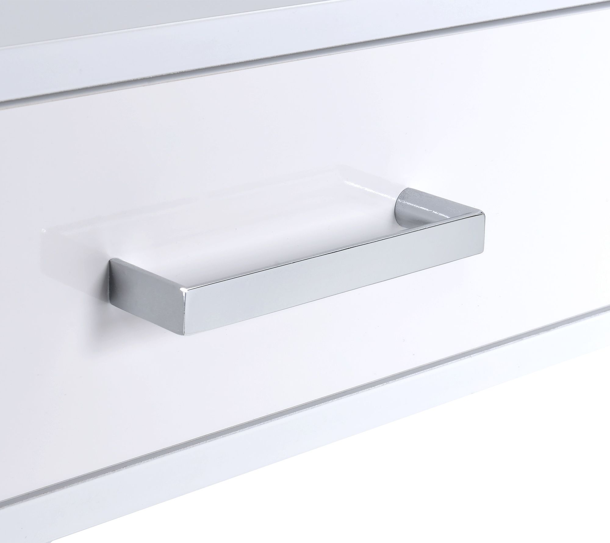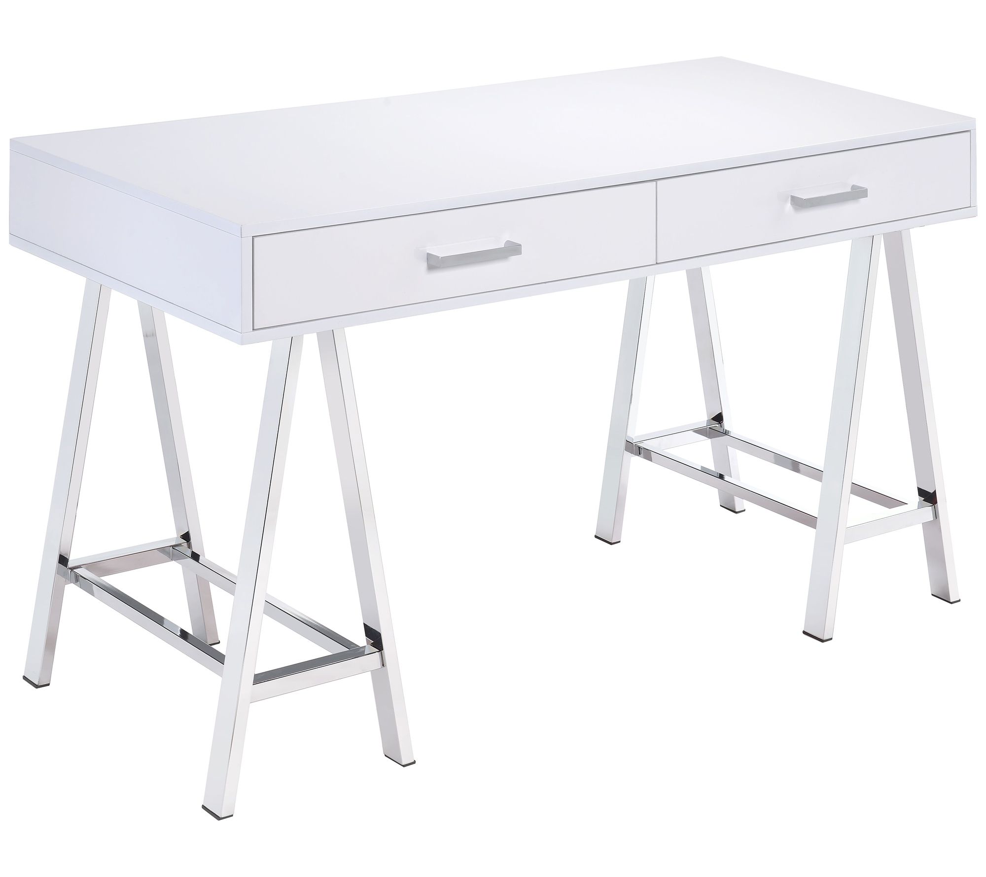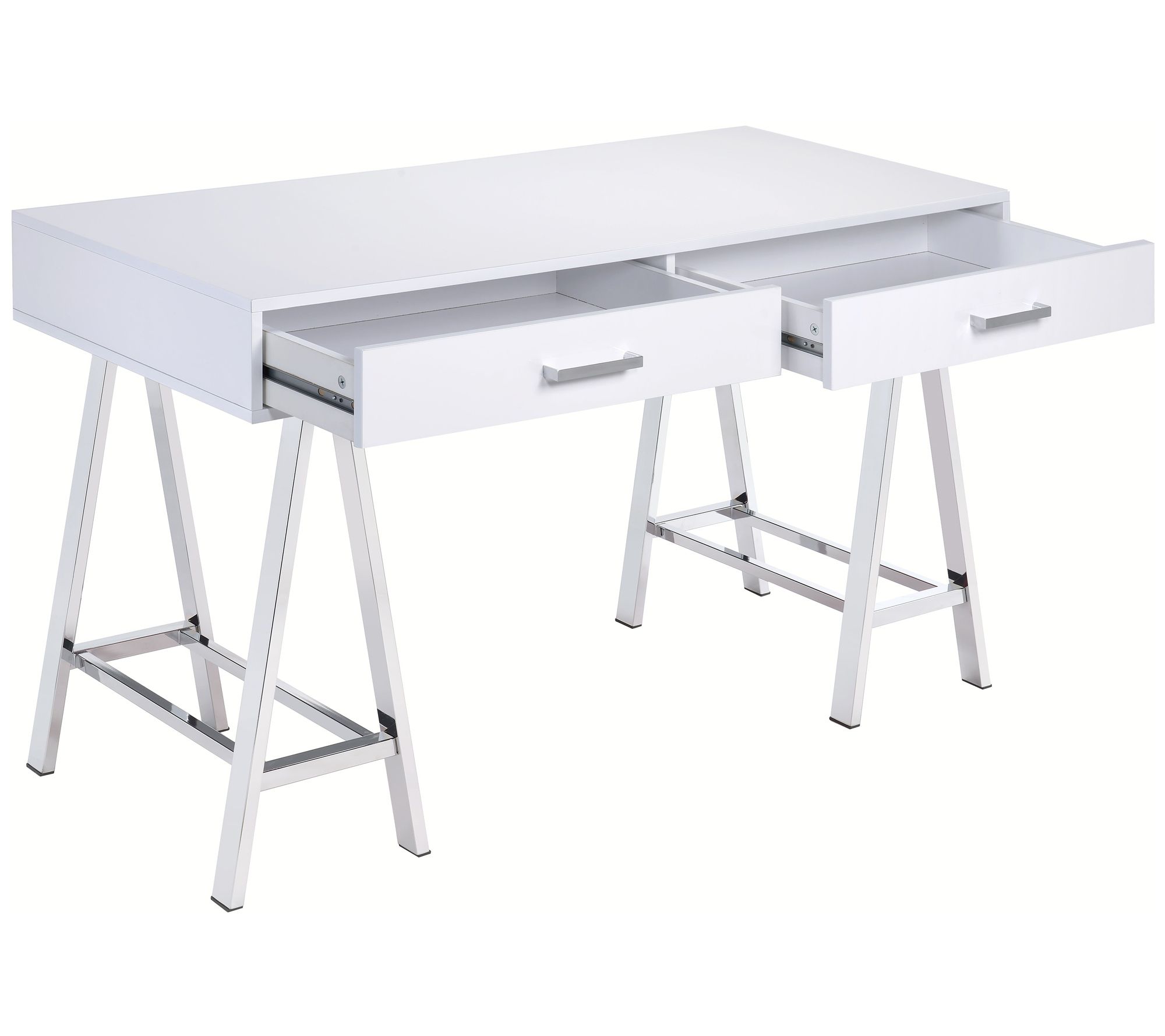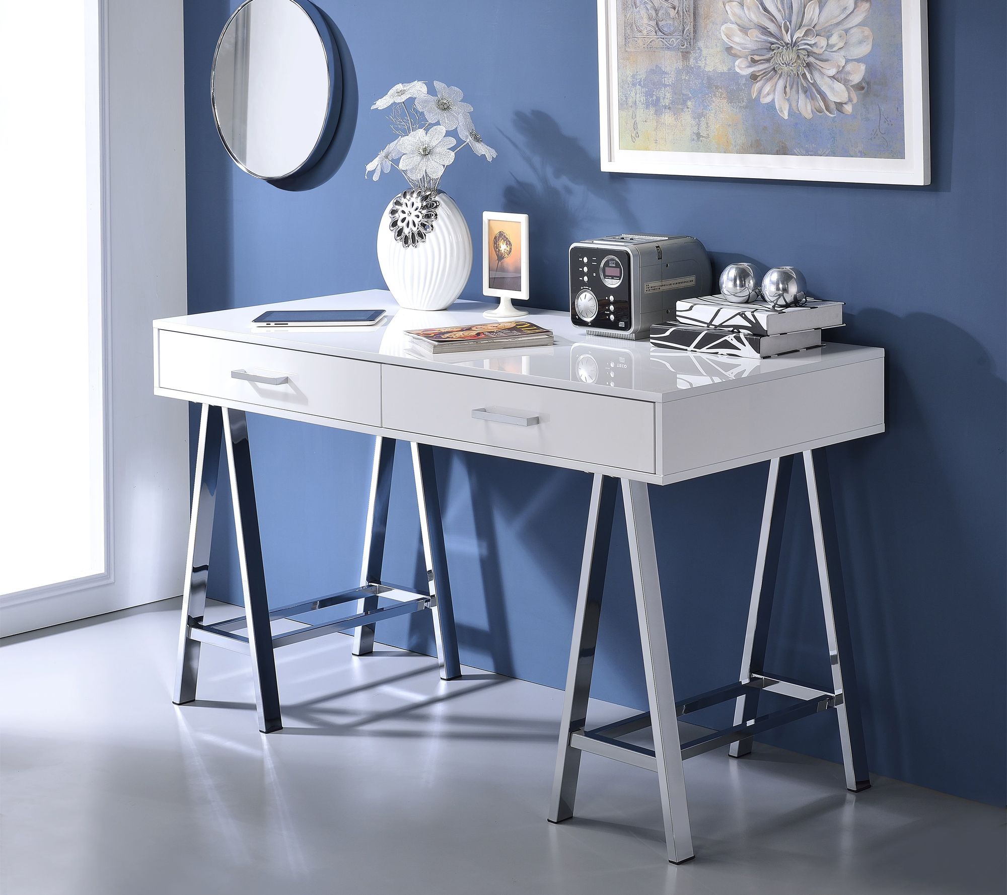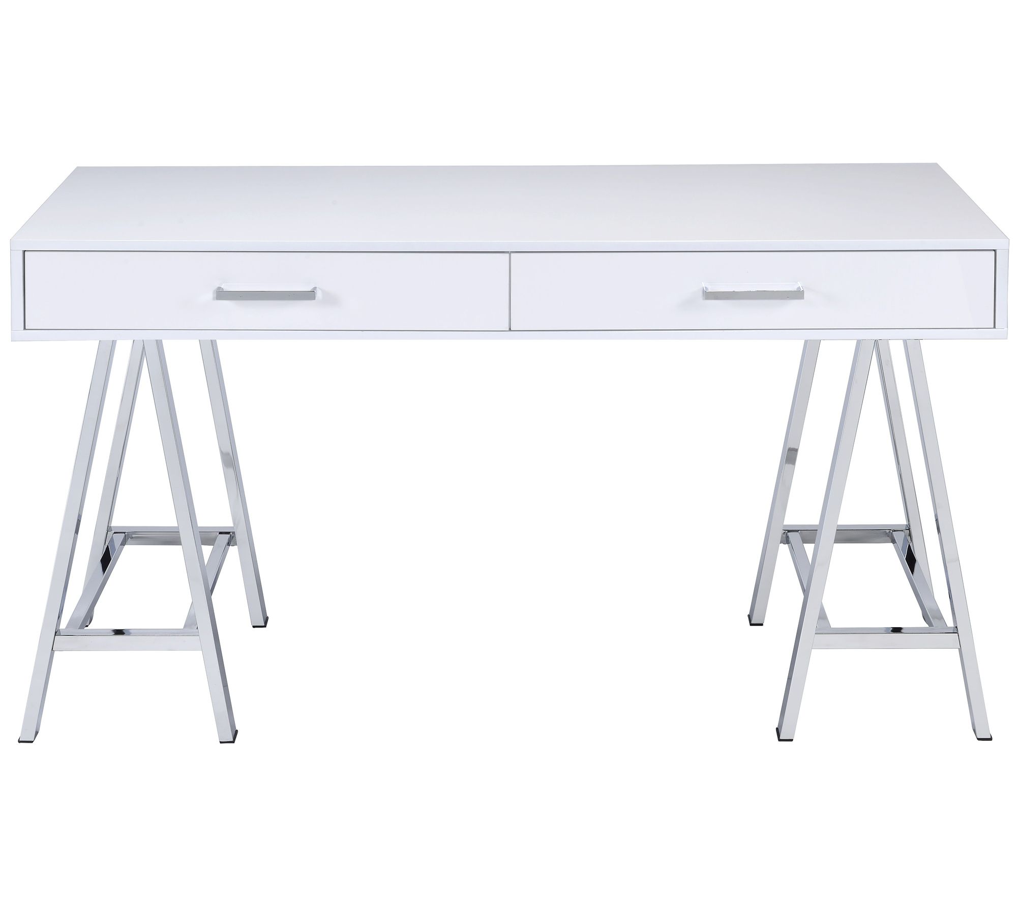 Enjoy contemporary style for your home office with this unique sawhorse-inspired desk featuring a high-gloss finished top and two drawers to organize supplies. From Acme.