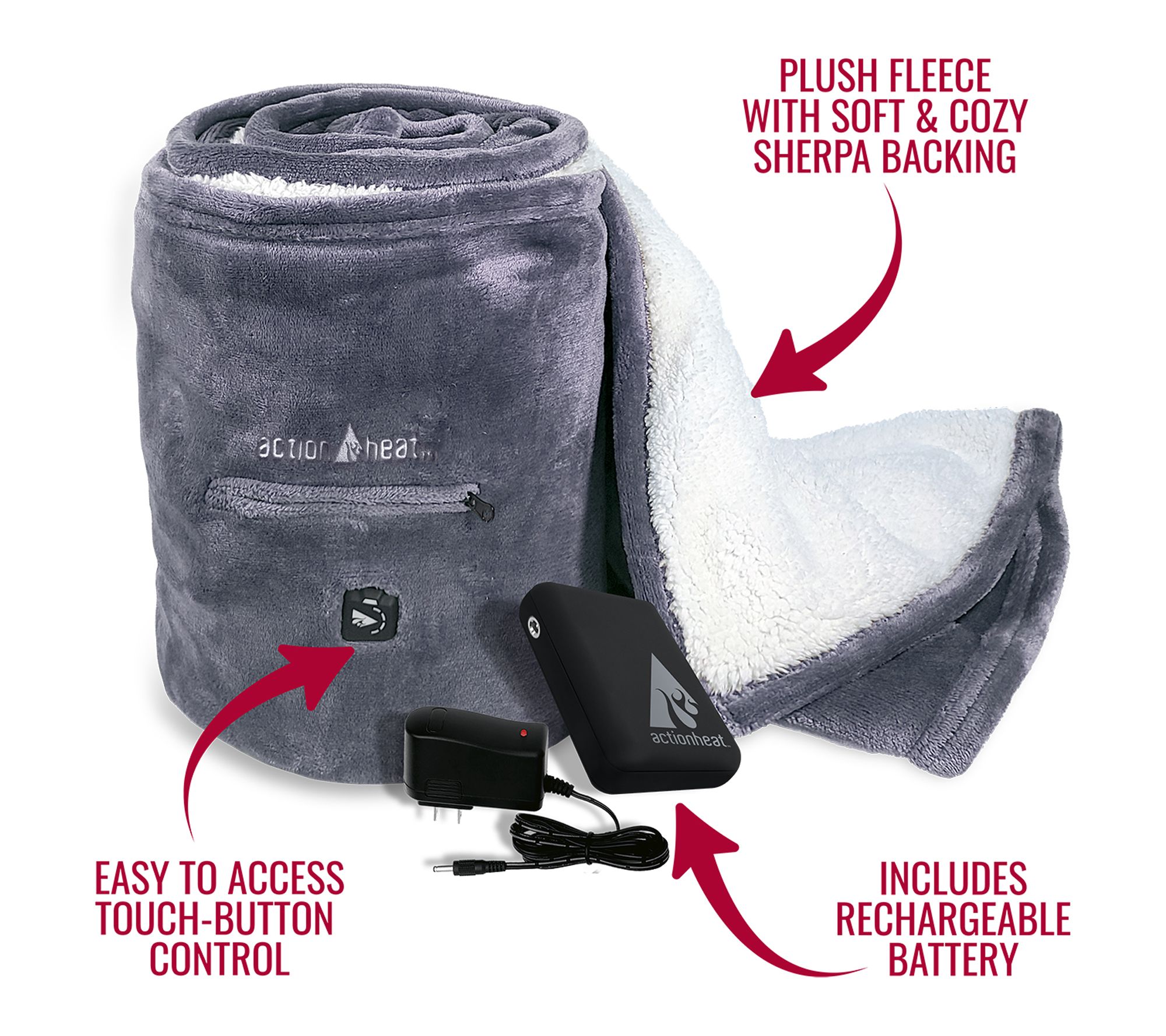 Includes ActionHeat throw blanket, 7V power bank, and charger