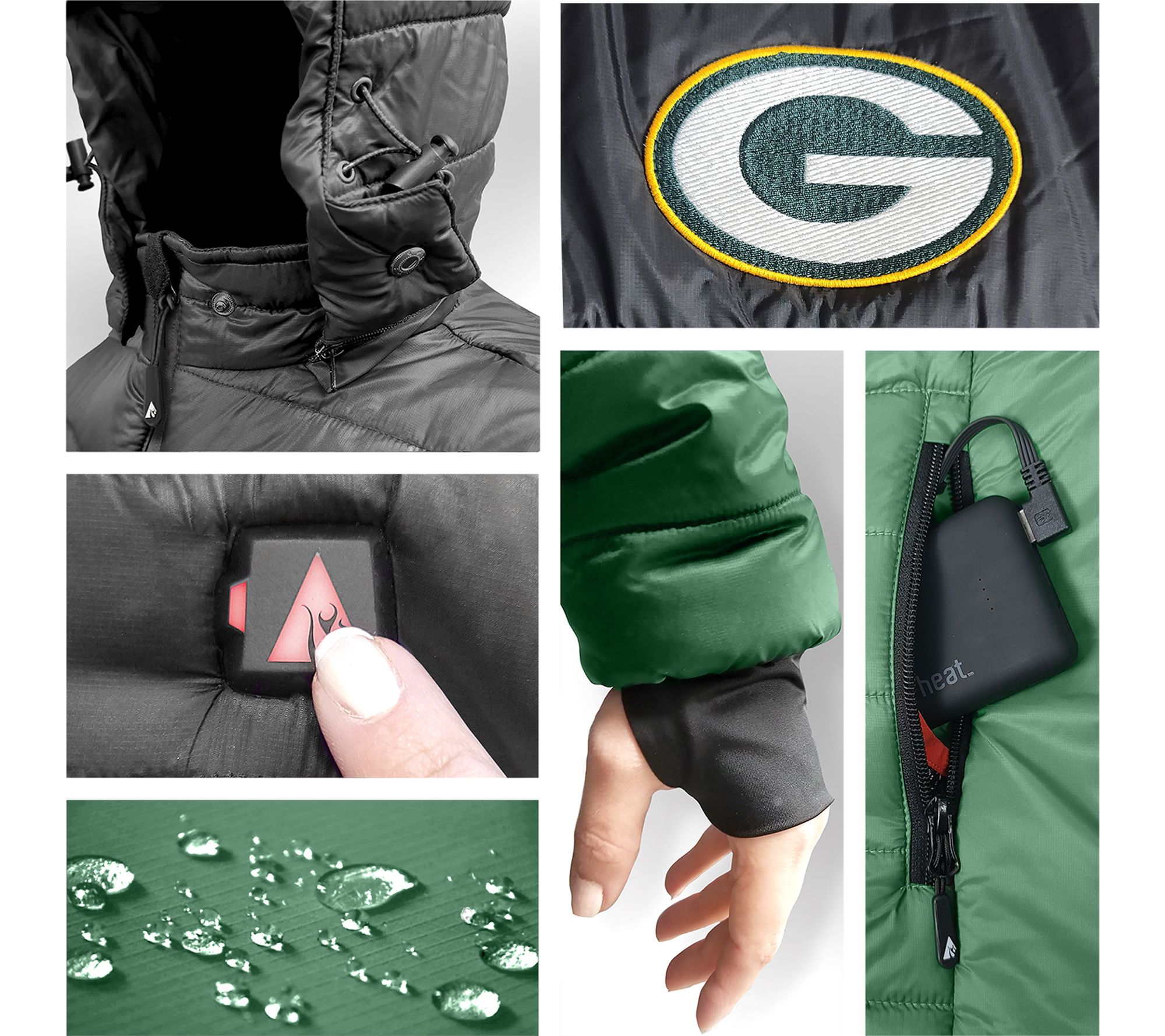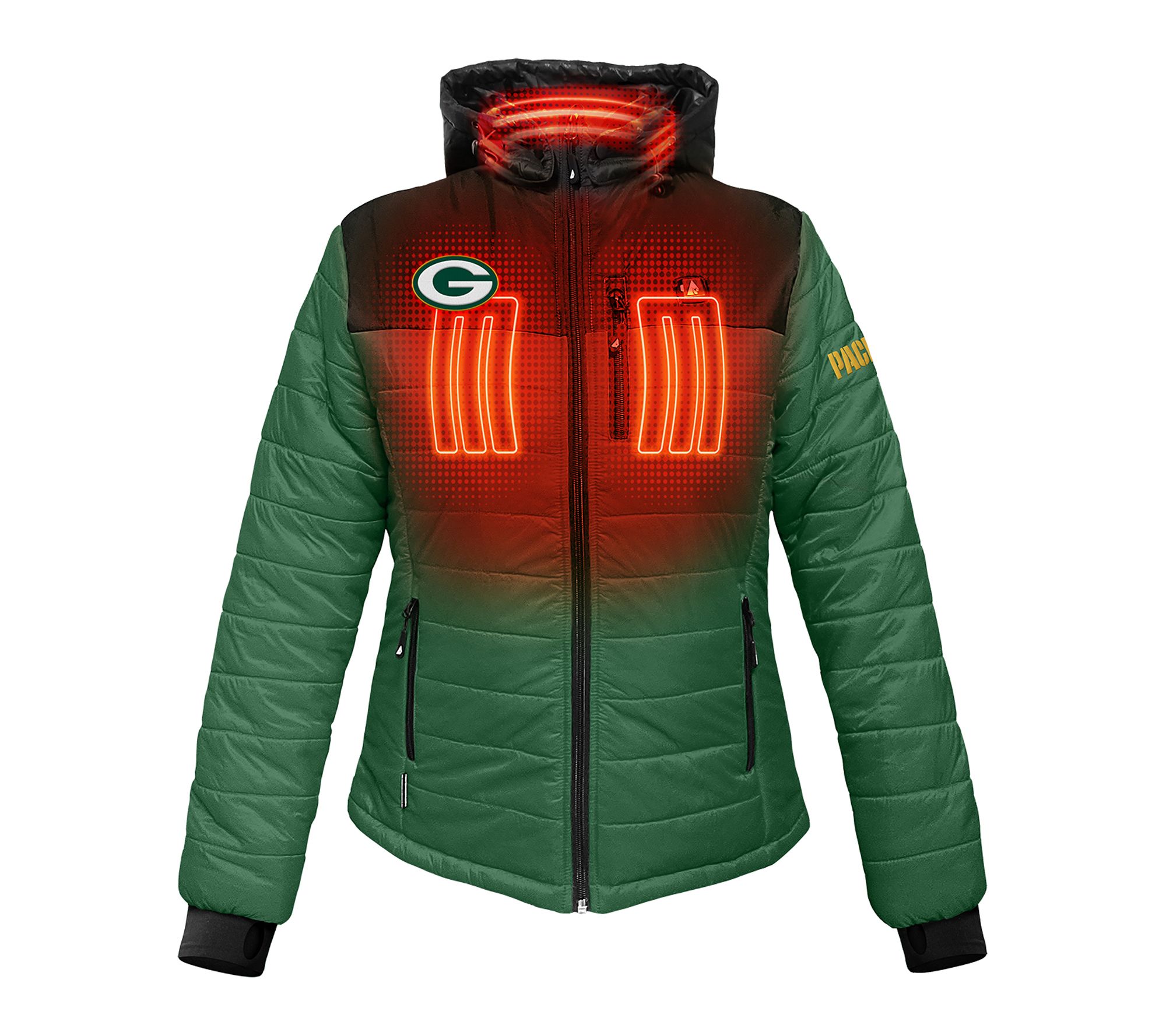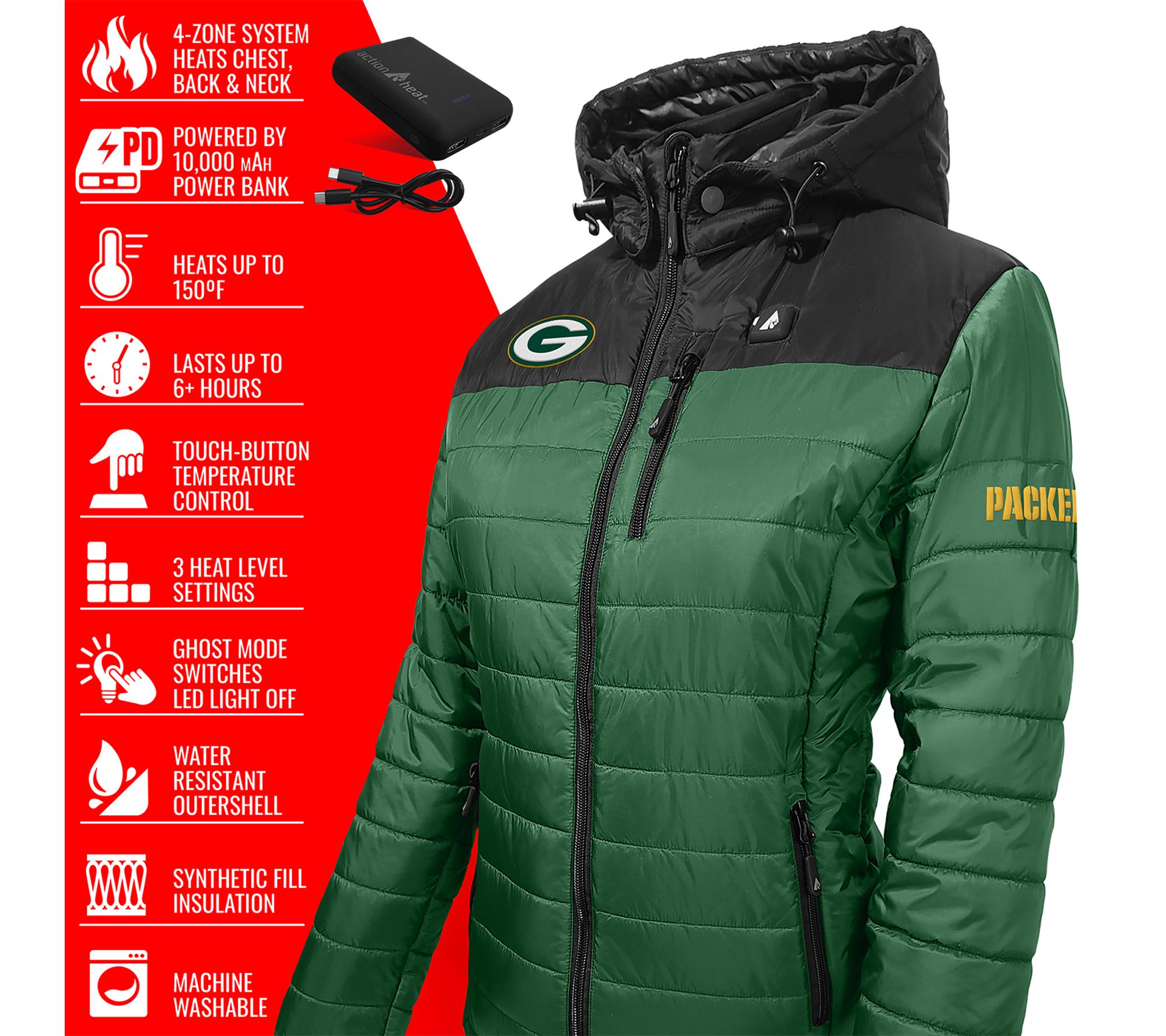 Stay warm while you show your team spirit, whether you're cheering from the stands or mingling at a chilly tailgate. This women's puffer jacket features battery-powered heating panels for lightweight comfort and a water-resistant shell, so you can enjoy outdoor NFL action without the bulk. From ActionHeat.