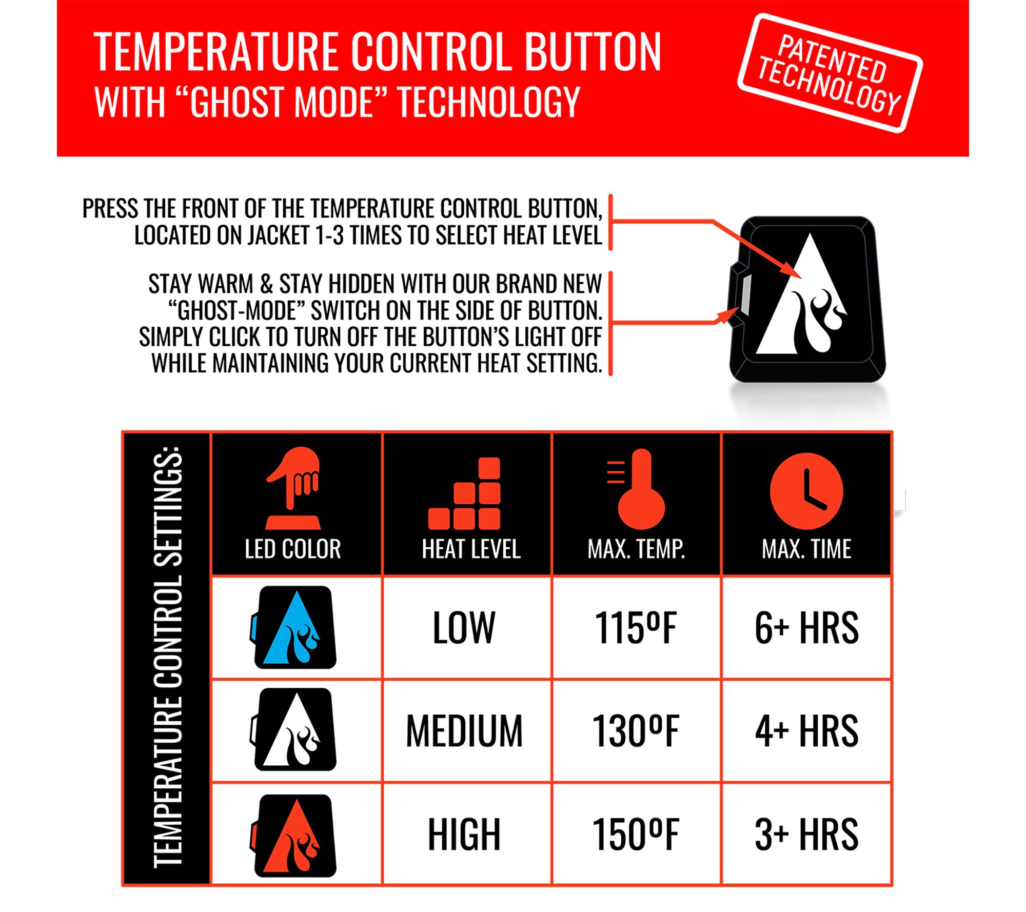 • Features: water-resistant shell, ultra-fine carbon fiber heating panels, touch-button temperature control, 4-zone heating system on chest/upper back/neck, 4 LED power indicators, two zippered pockets, hidden battery pocket, cinch bungees, collar with hood, long sleeves