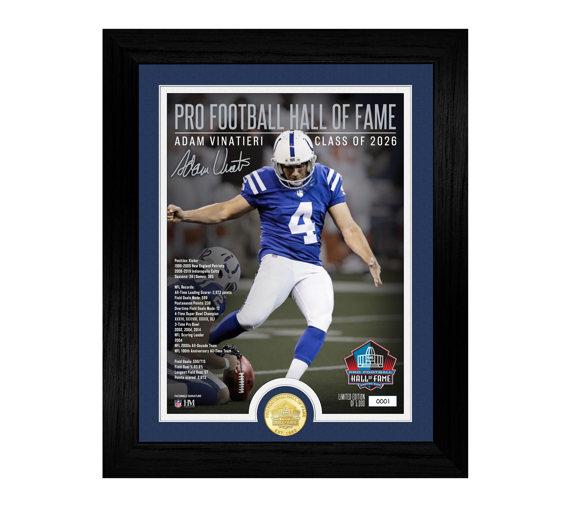 Celebrate football greatness with this limited edition framed collectible showcasing Adam Vinatieri's 2026 induction into the Pro Football Hall of Fame. Highlighting iconic career stats on a custom 8" x 11" print and set in a double-matted 13" x 16" wood molding frame with a minted bronze bullion, this autographed memorabilia is a centerpiece for any Colts fan or sports room. From The Highland Mint.