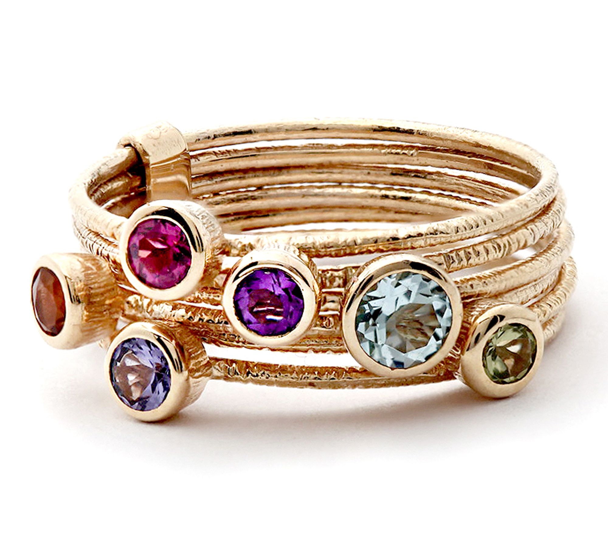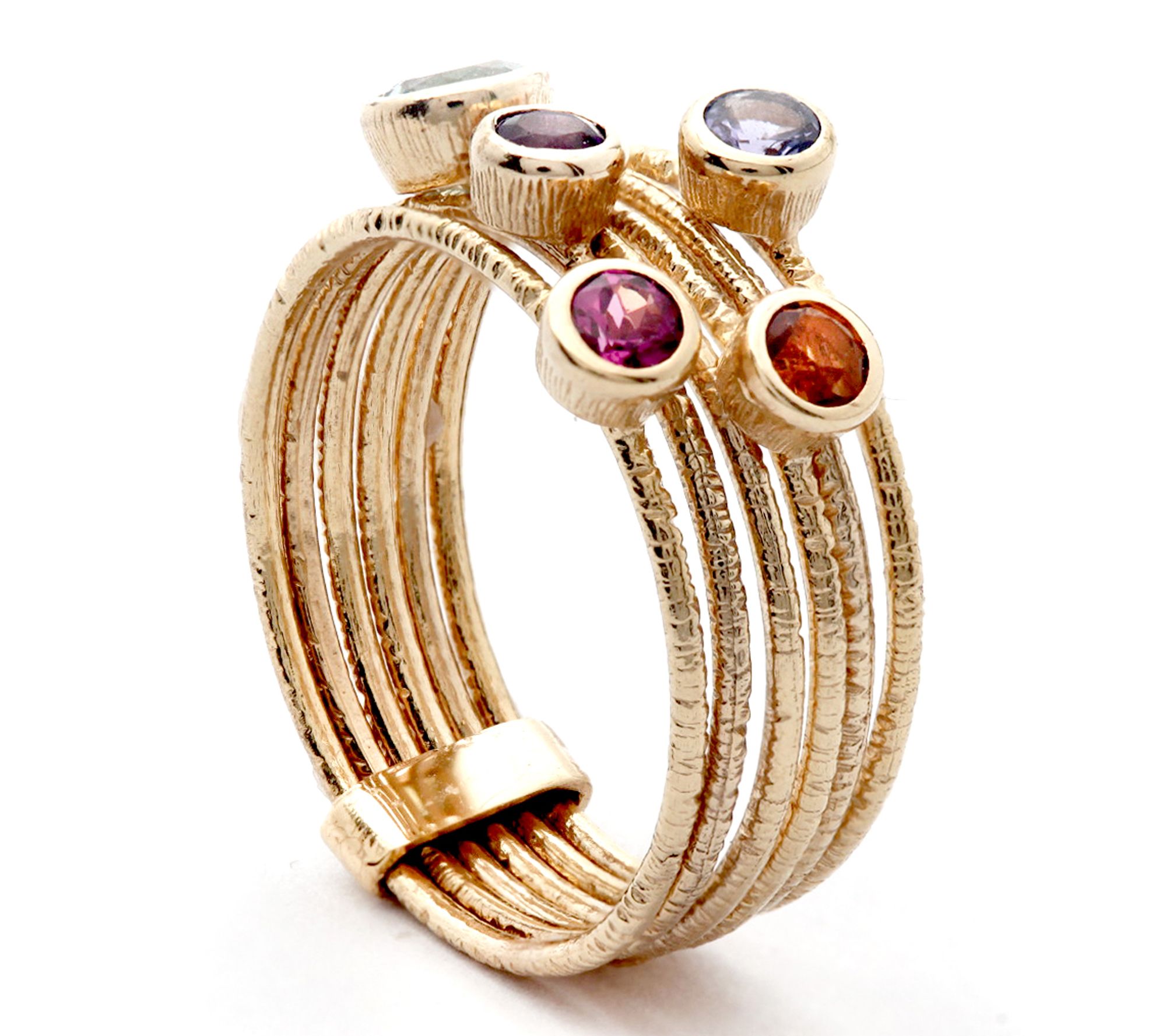 Bring a lively splash of color to any celebration with this 14K gold multi-gemstone cocktail ring. Five vibrant bezel-set gems -- blue topaz, citrine, peridot, African amethyst, and rhodolite -- crown each delicately stacked band, adding playful elegance to brunch with friends or a night downtown. From Adi Paz® Jewelry.
