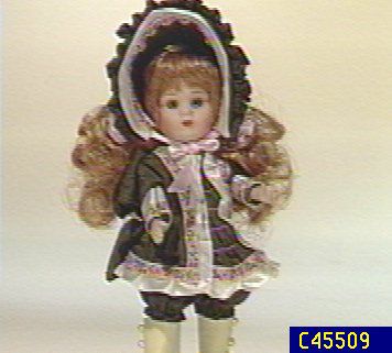Adrienne, a 6" doll by Marie Osmond, features blonde hair and green eyes. She is dressed in a Victorian green costume trimmed with ivory satin and embroidered with pink and green flowers. A matching hat is tied under her neck with a large pink satin ribbon. White boots with faux pearls on the side complete her outfit. Limited edition of 2500. It includes a Certificate of Authenticity and a doll stand. Reproduction of Bru doll. All porcelain. From Petite Amour series. Made in China.