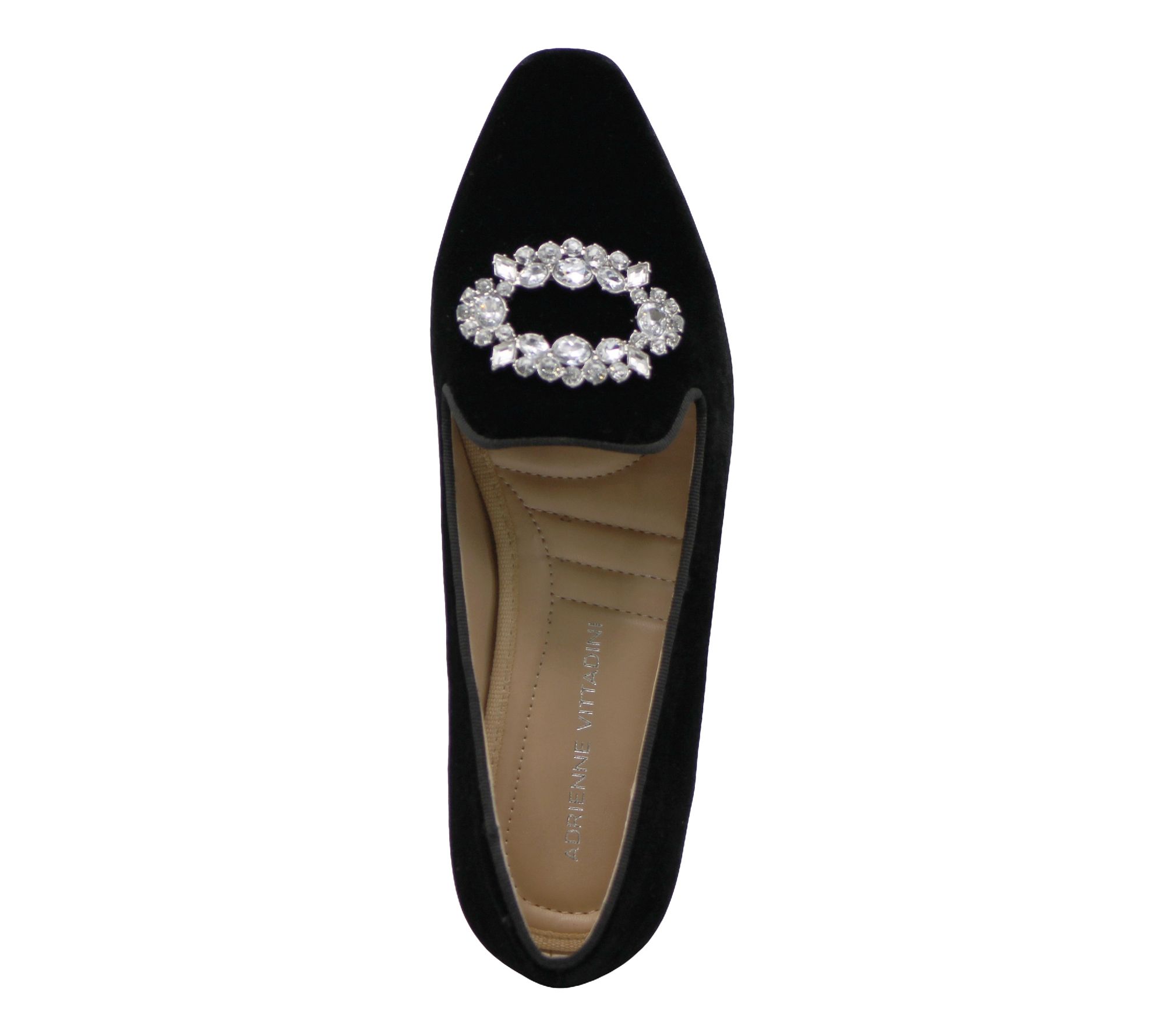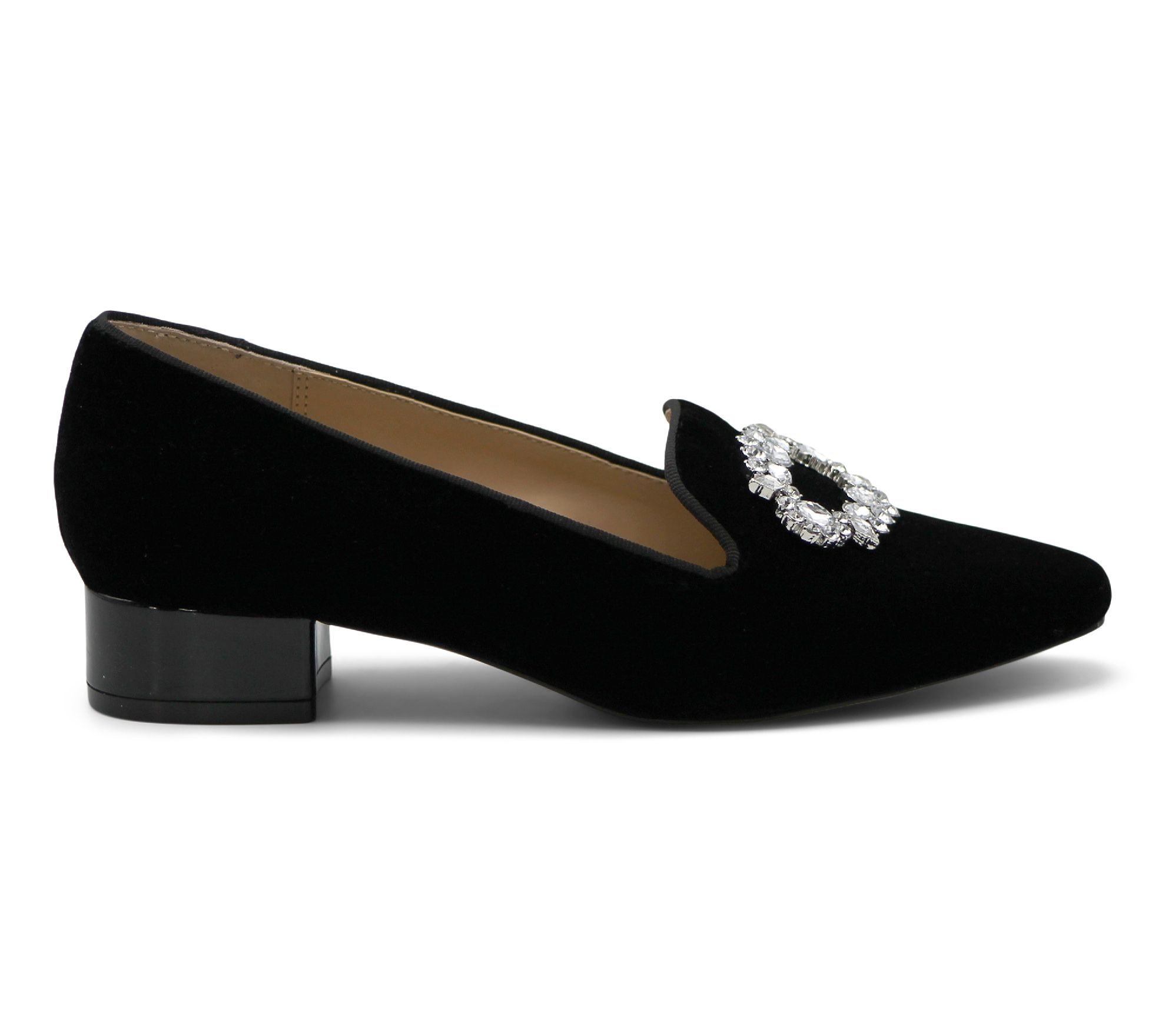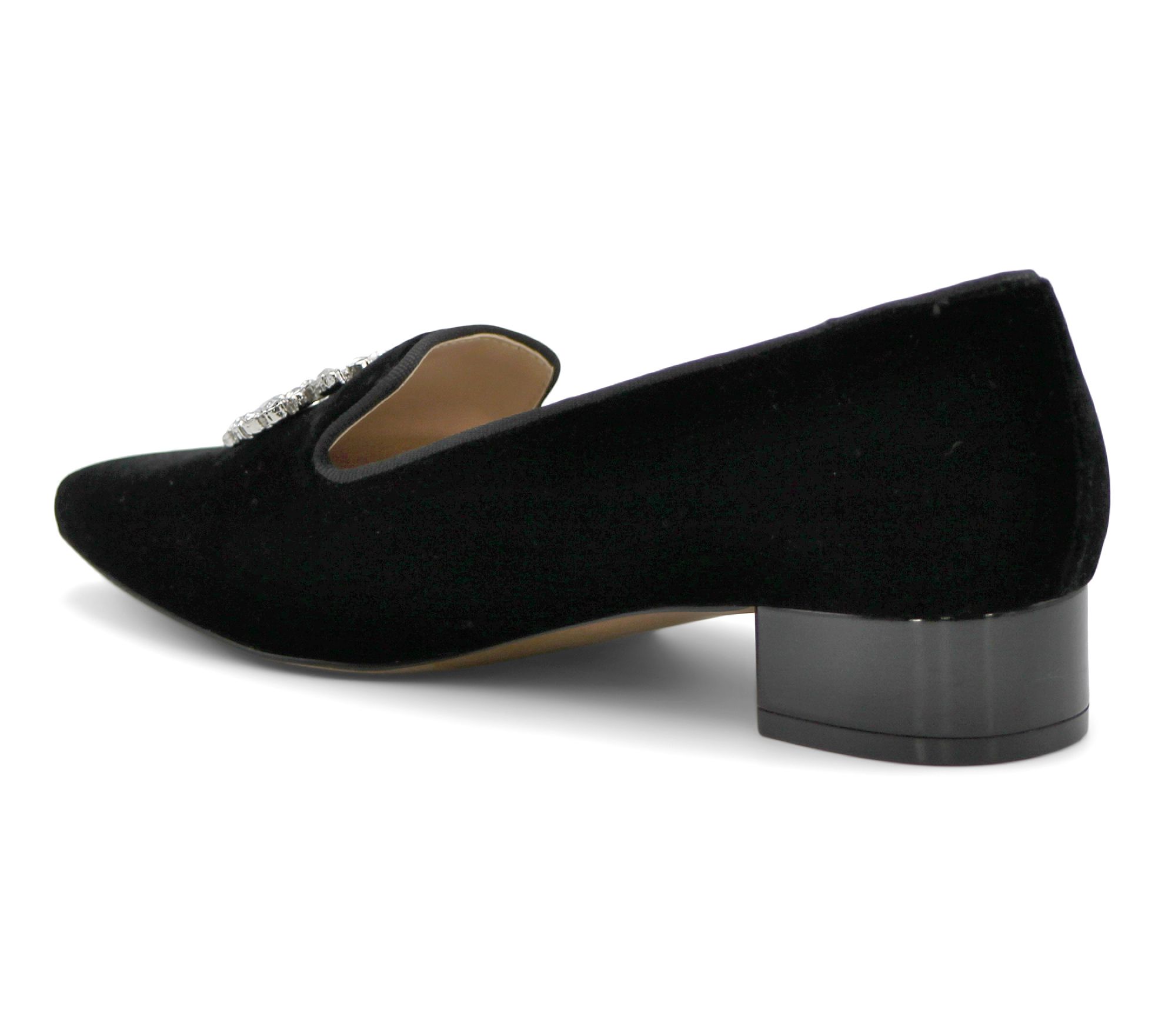 • Slip-on style, low block heel, loafer pump, plush velour upper, rhinestone buckle
