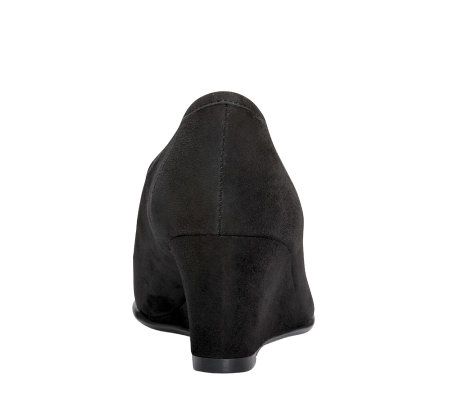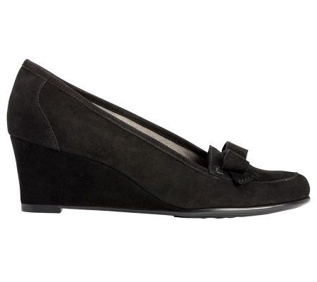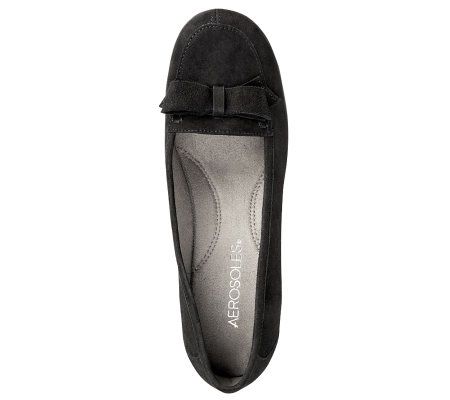 You have it made in the suede. Lucky you, wearing this pair of suede wedges with a feminine bow detail. Success comes easy when you strut your stuff in stylish shoes. From Aerosoles.