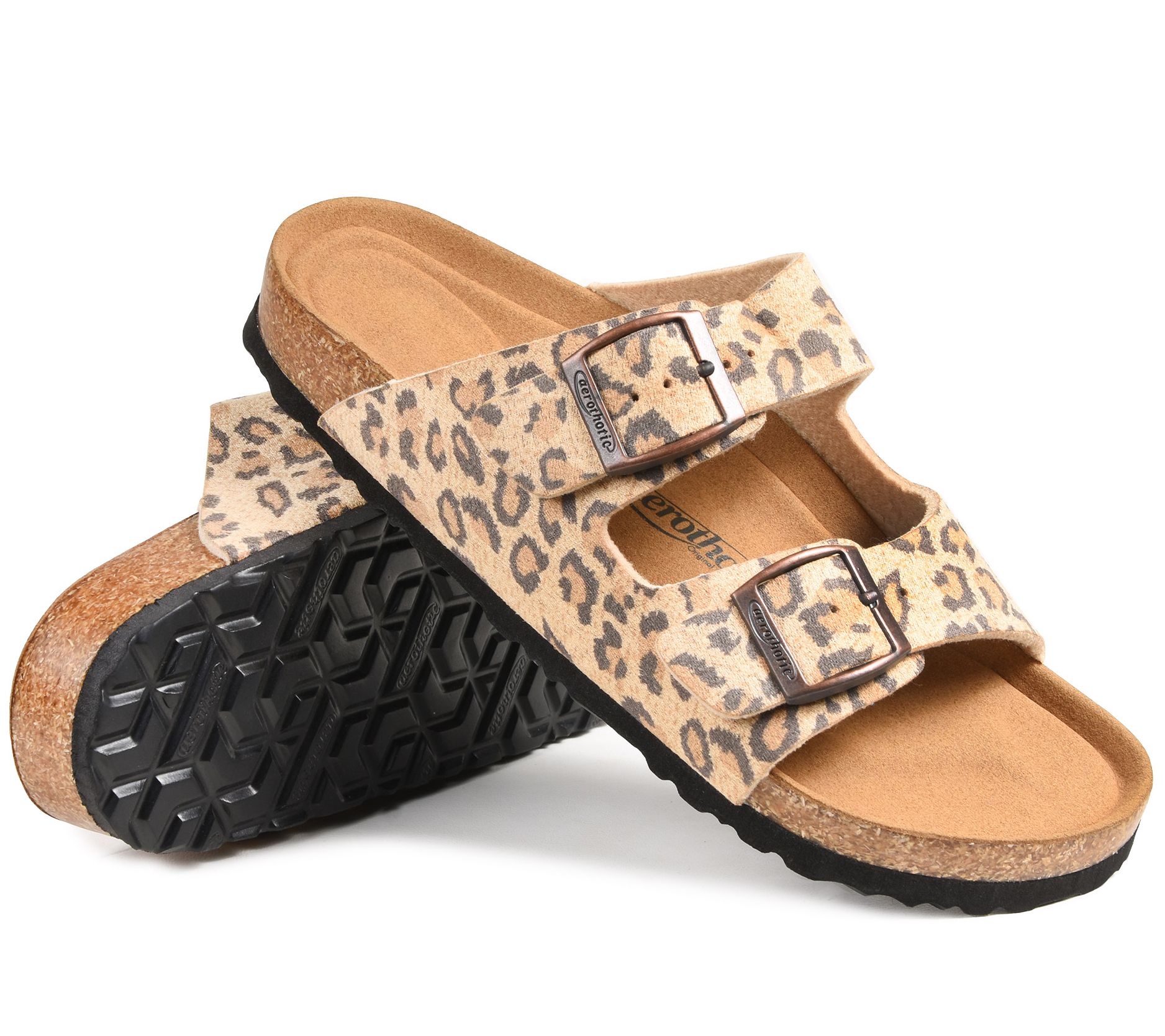 Exotic, wild style meets casual comfort in the Ellys, a laid-back sandal with a leopard-printed dual strap upper, adjustable buckles, and a footbed that keeps you comfortable all day. From Aerothotic.