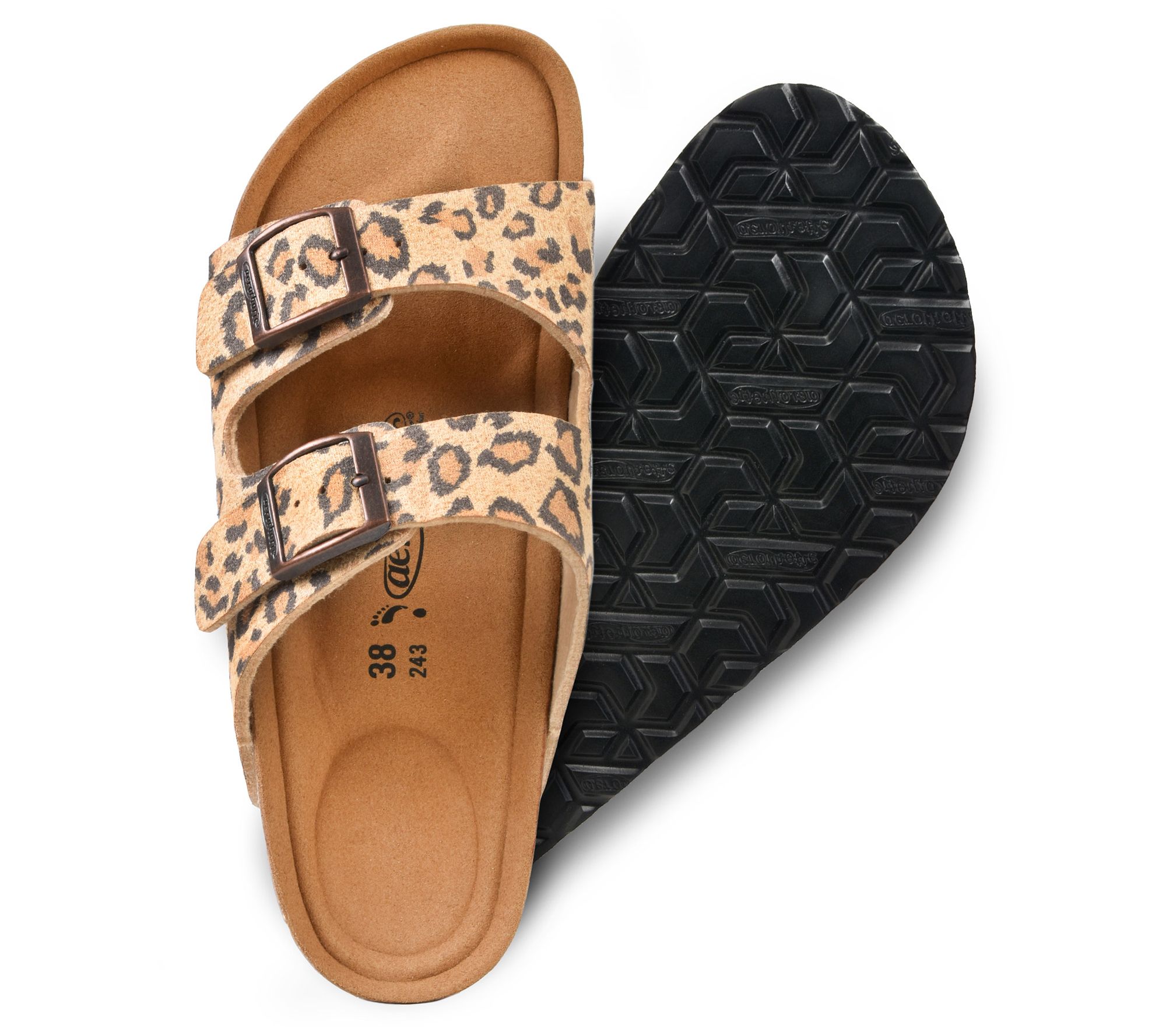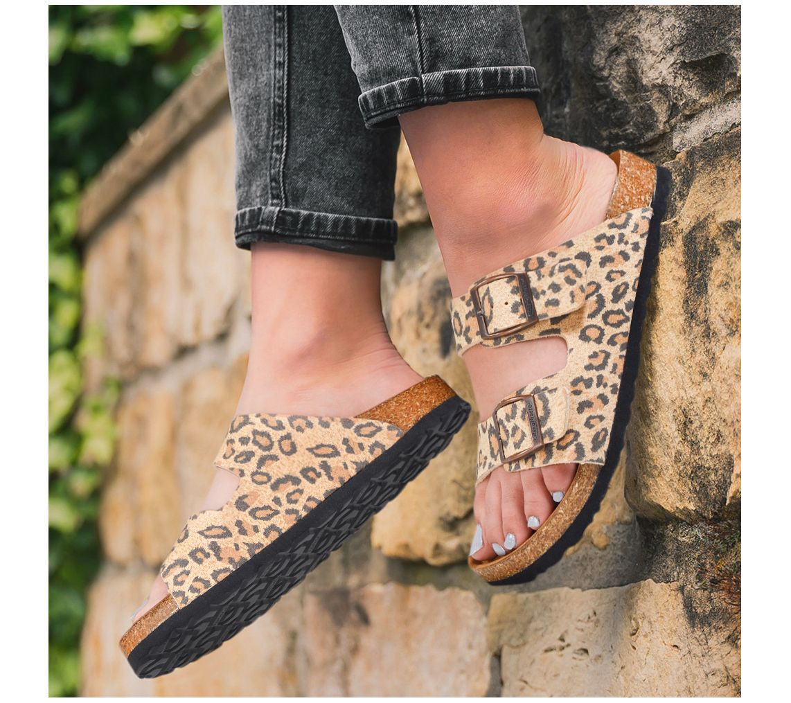 • Slip-on style, two adjustable straps with buckles, leopard-printed straps, cork-blend footbed, rounded toe