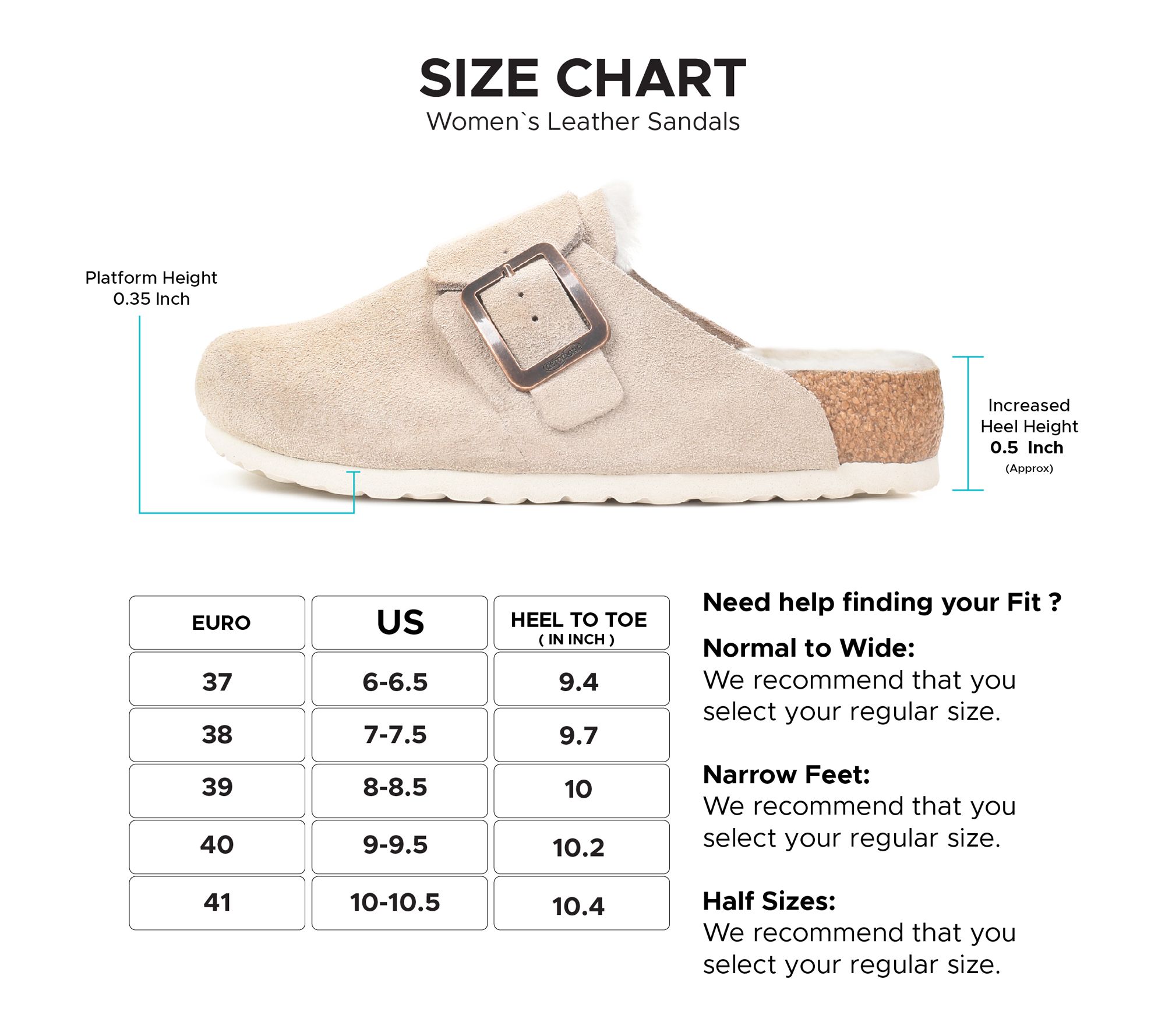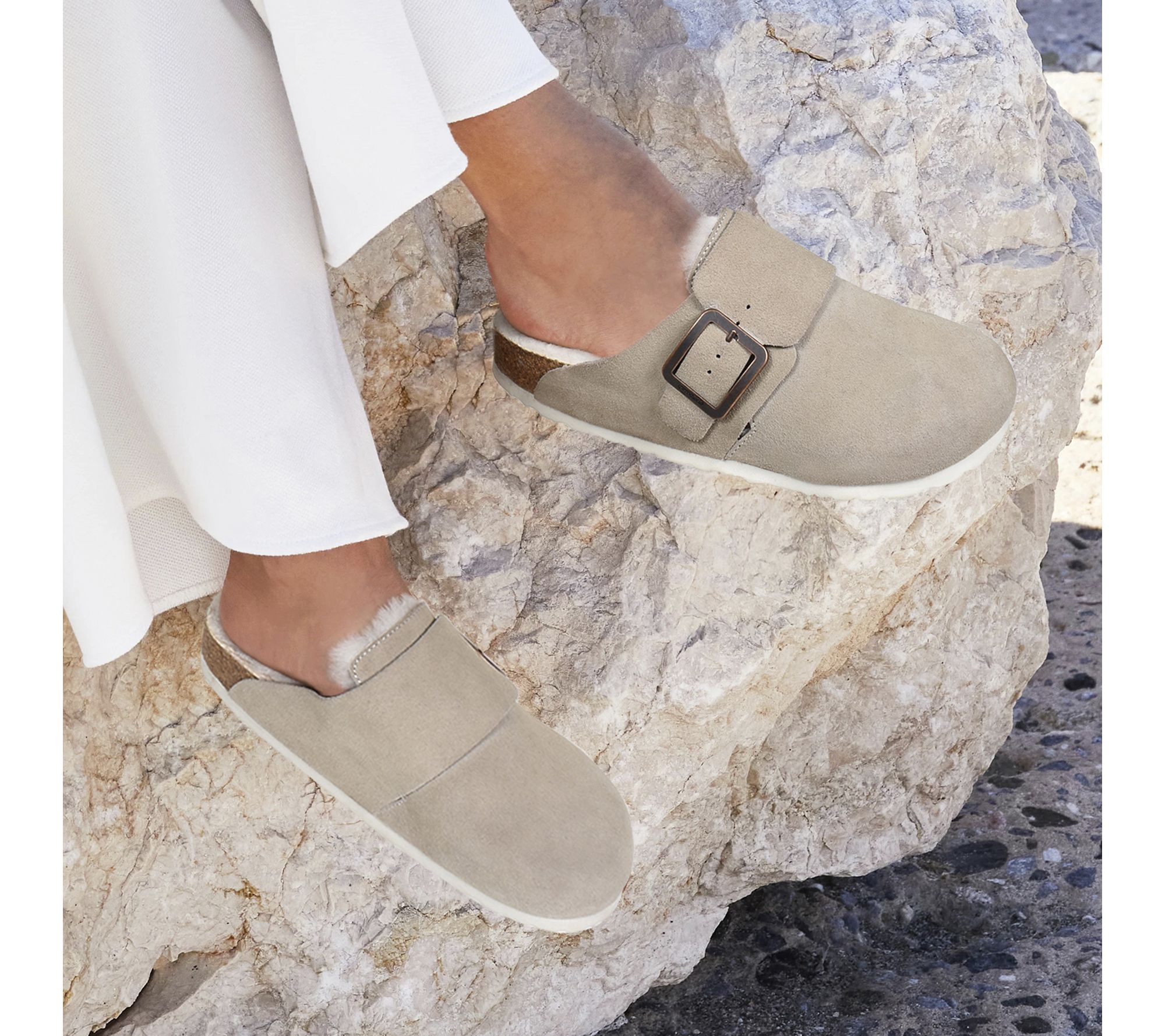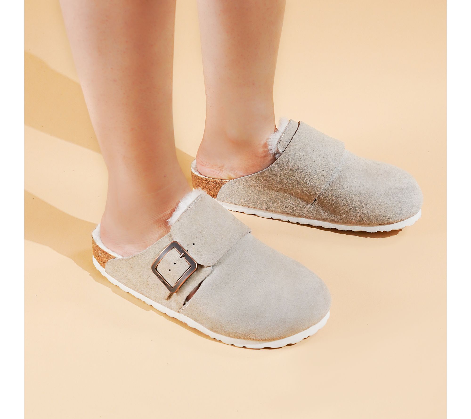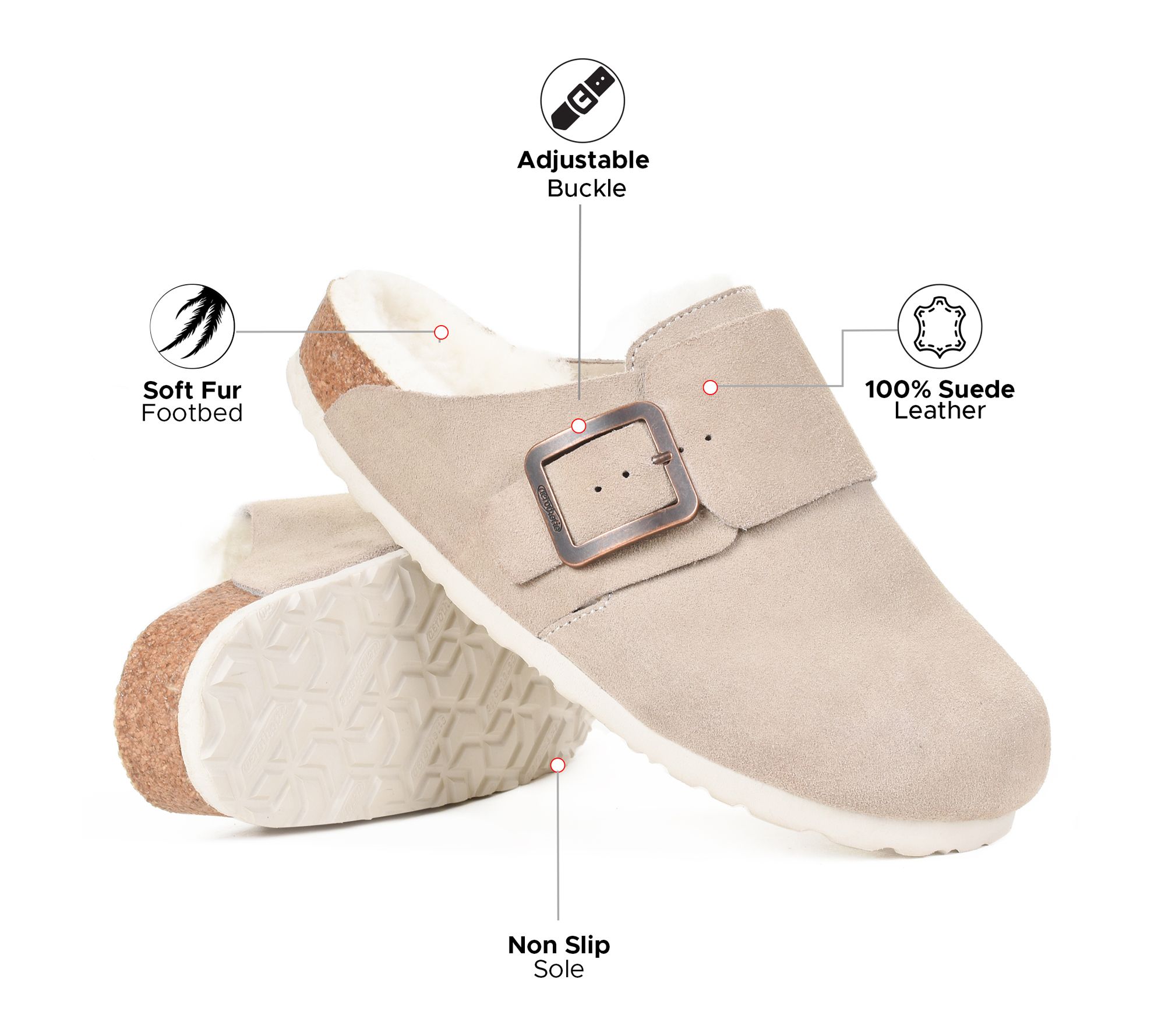 • Open back, slip-on style, wool fur lining, adjustable buckle strap