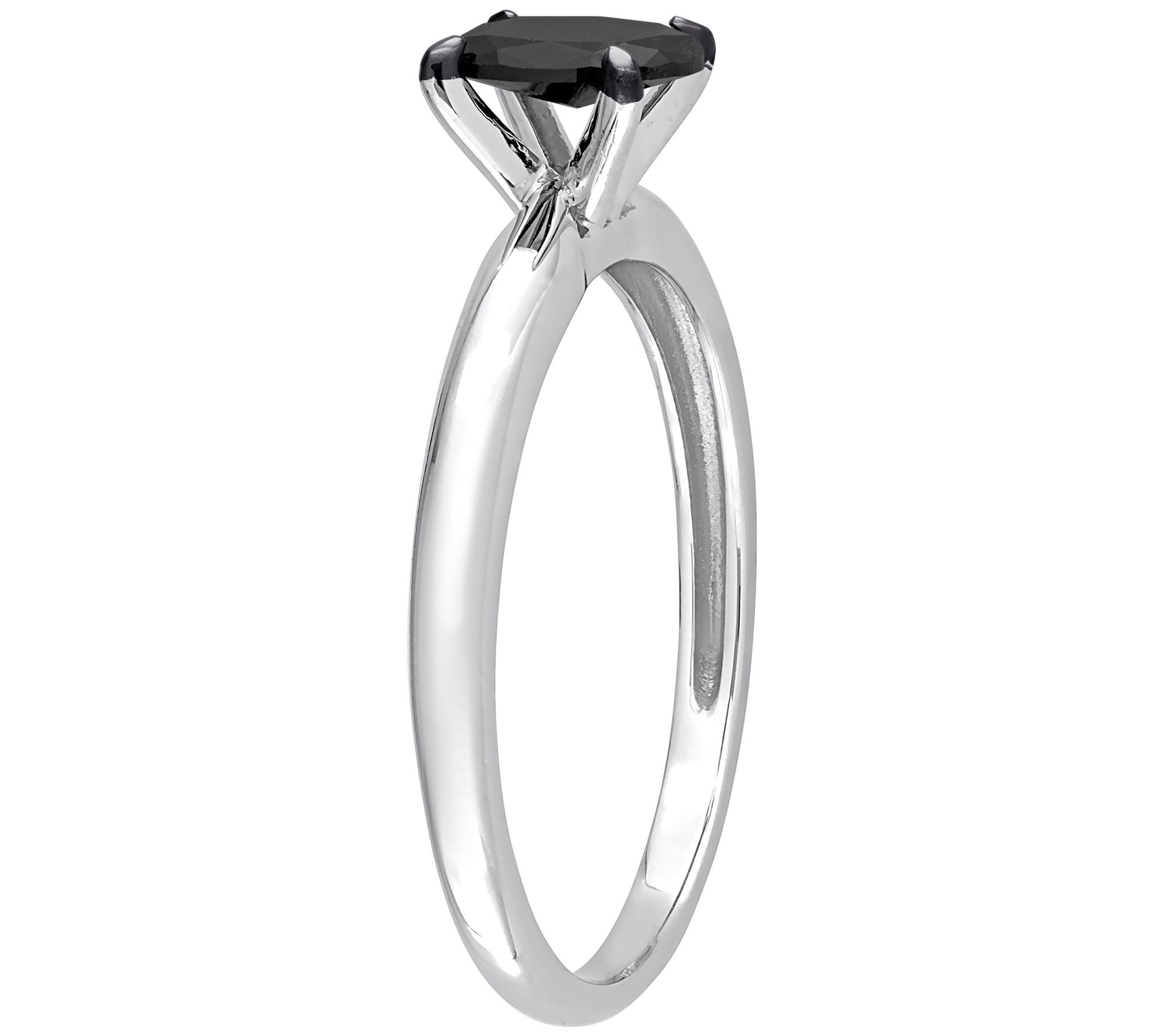 - Solitaire engagement ring with oval-cut, prong-set black diamond; polished finish