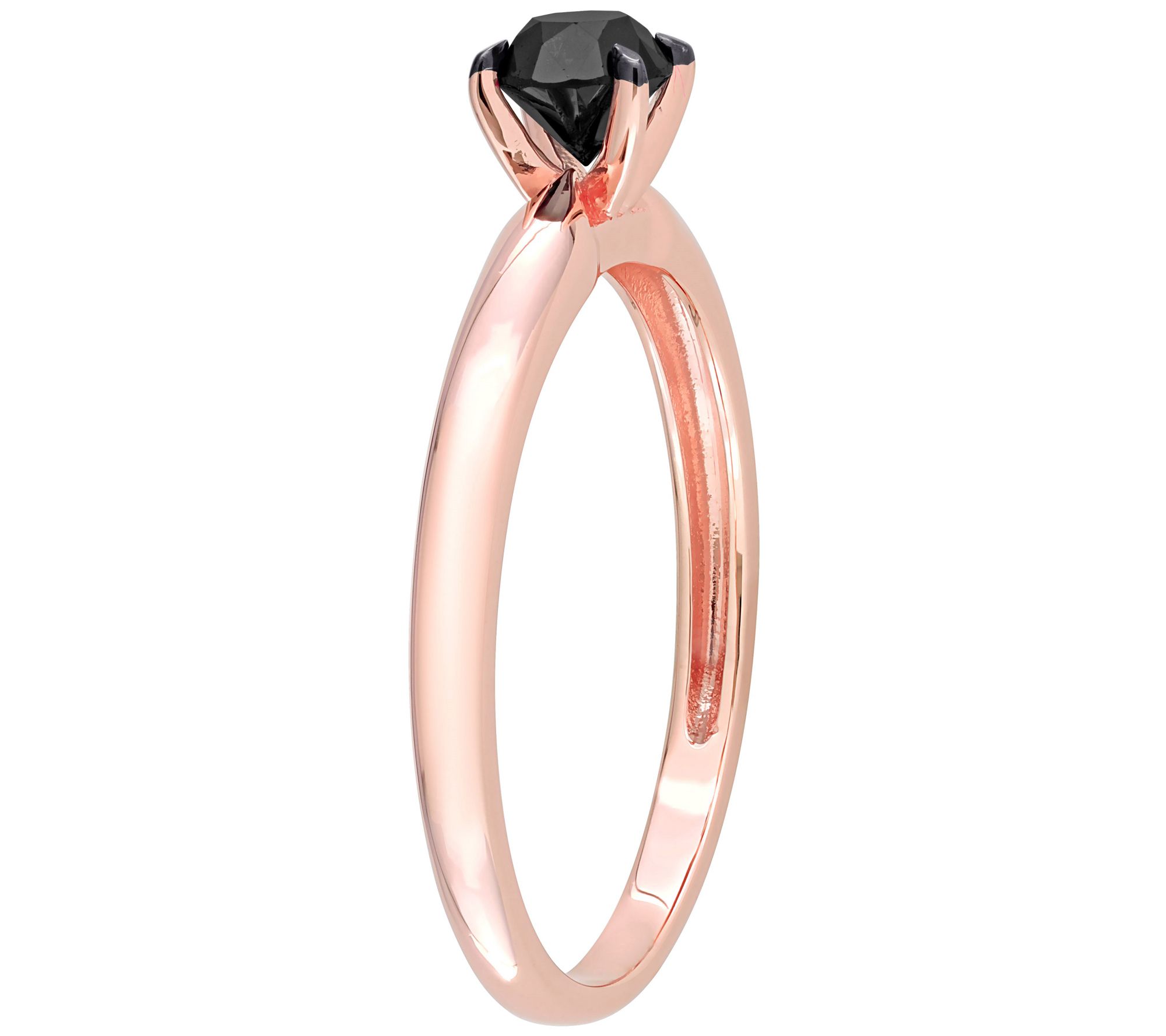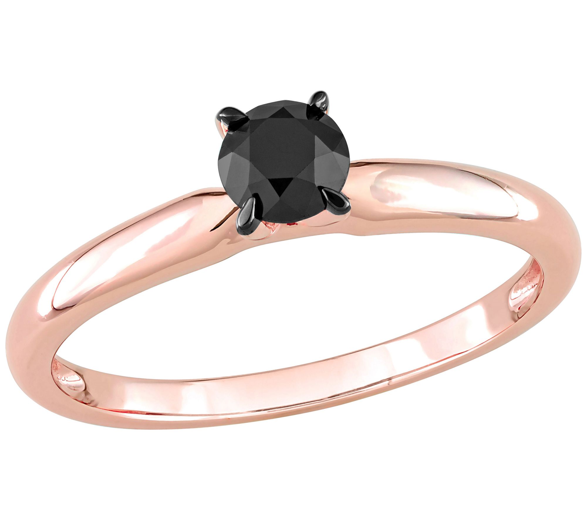 - Solitaire engagement ring with round-cut, prong-set black diamond; polished finish