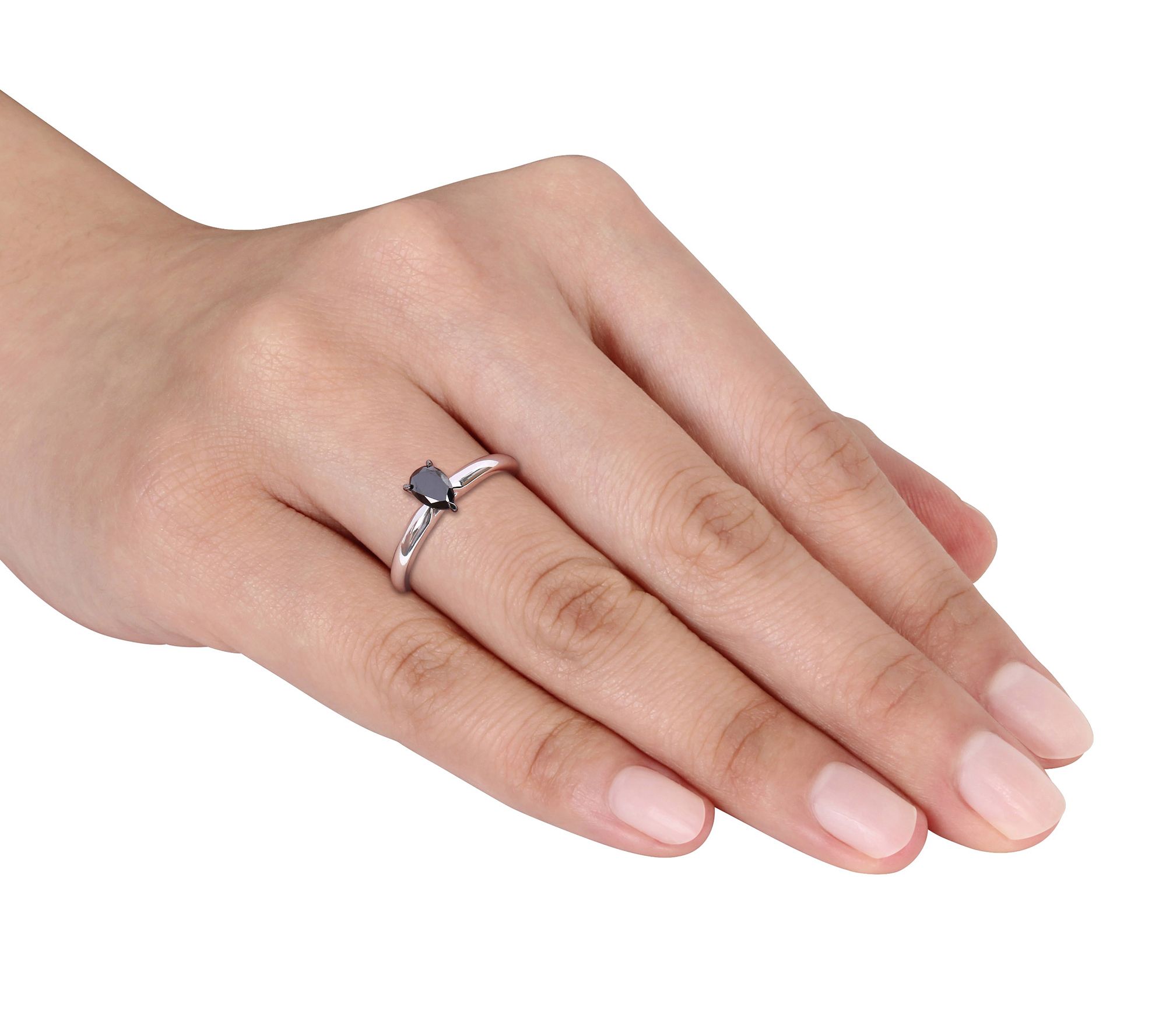 - Solitaire engagement ring with pear-cut, prong-set black diamond; polished finish