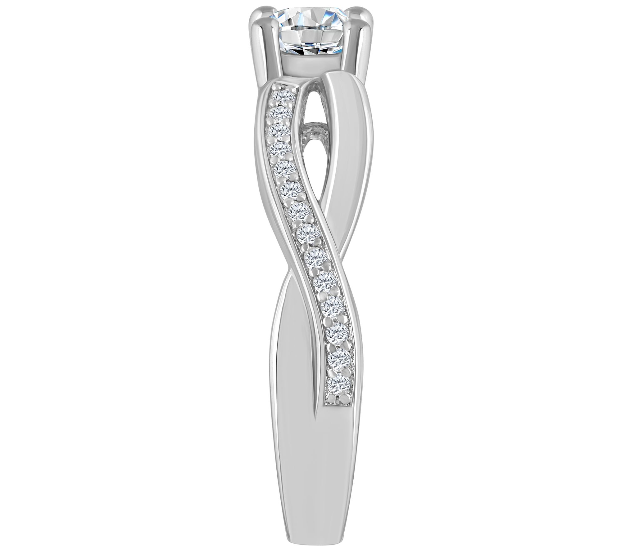 - Round, prong-set white diamond center; round, prong-set white diamonds on curved openwork shank