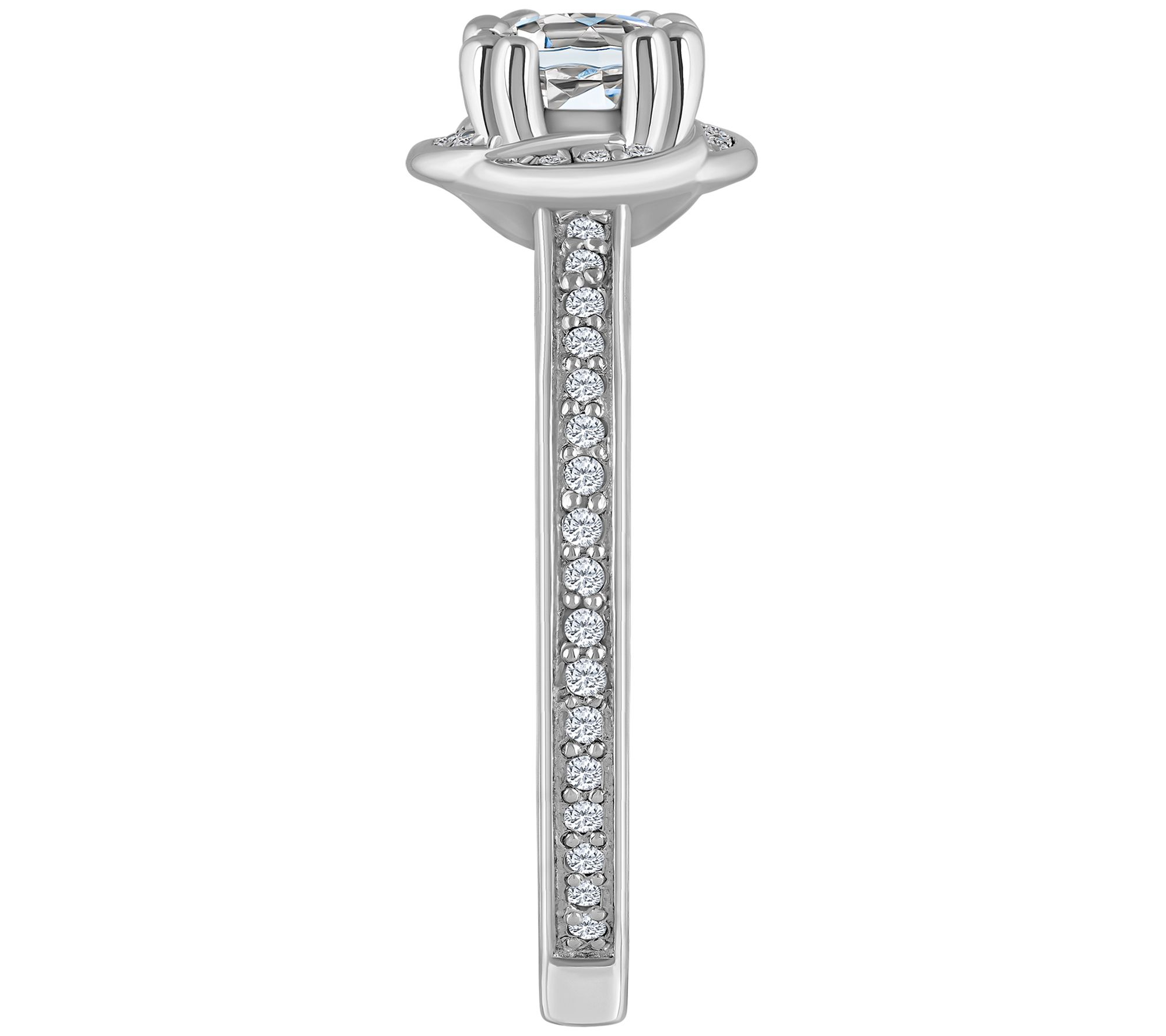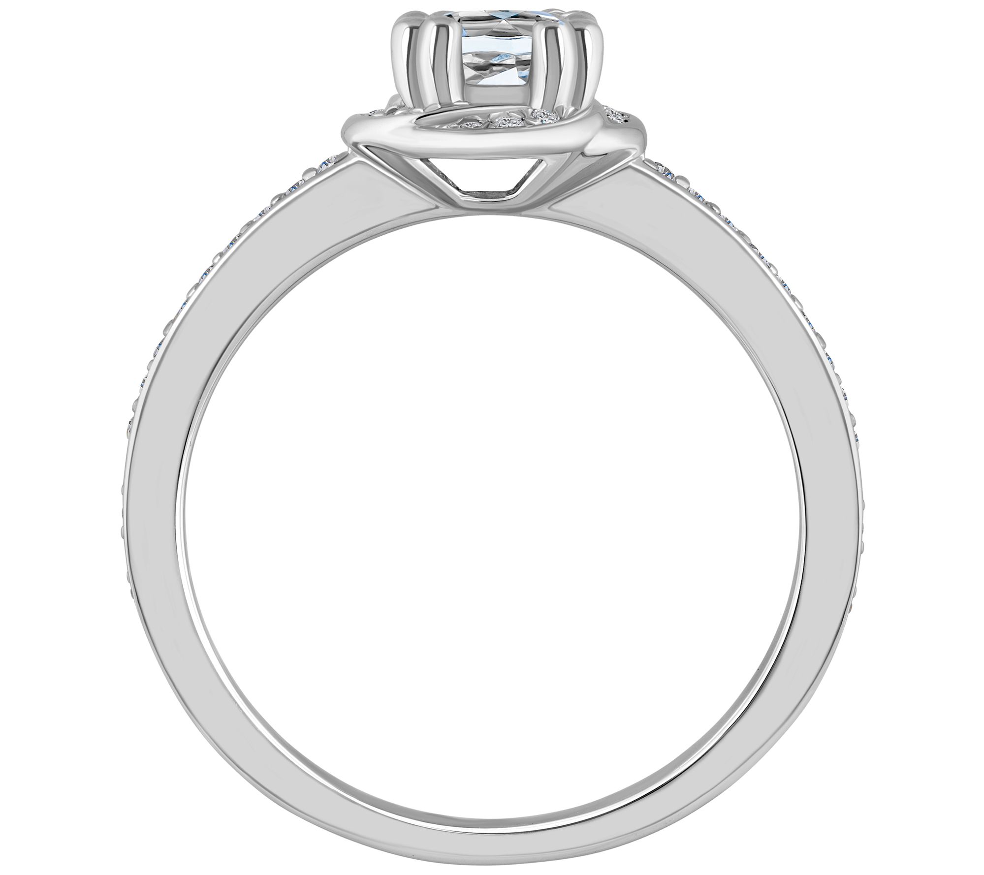 - Round, prong-set white diamond center with a halo of round, prong-set white diamonds; round, prong-set white diamonds on the shank