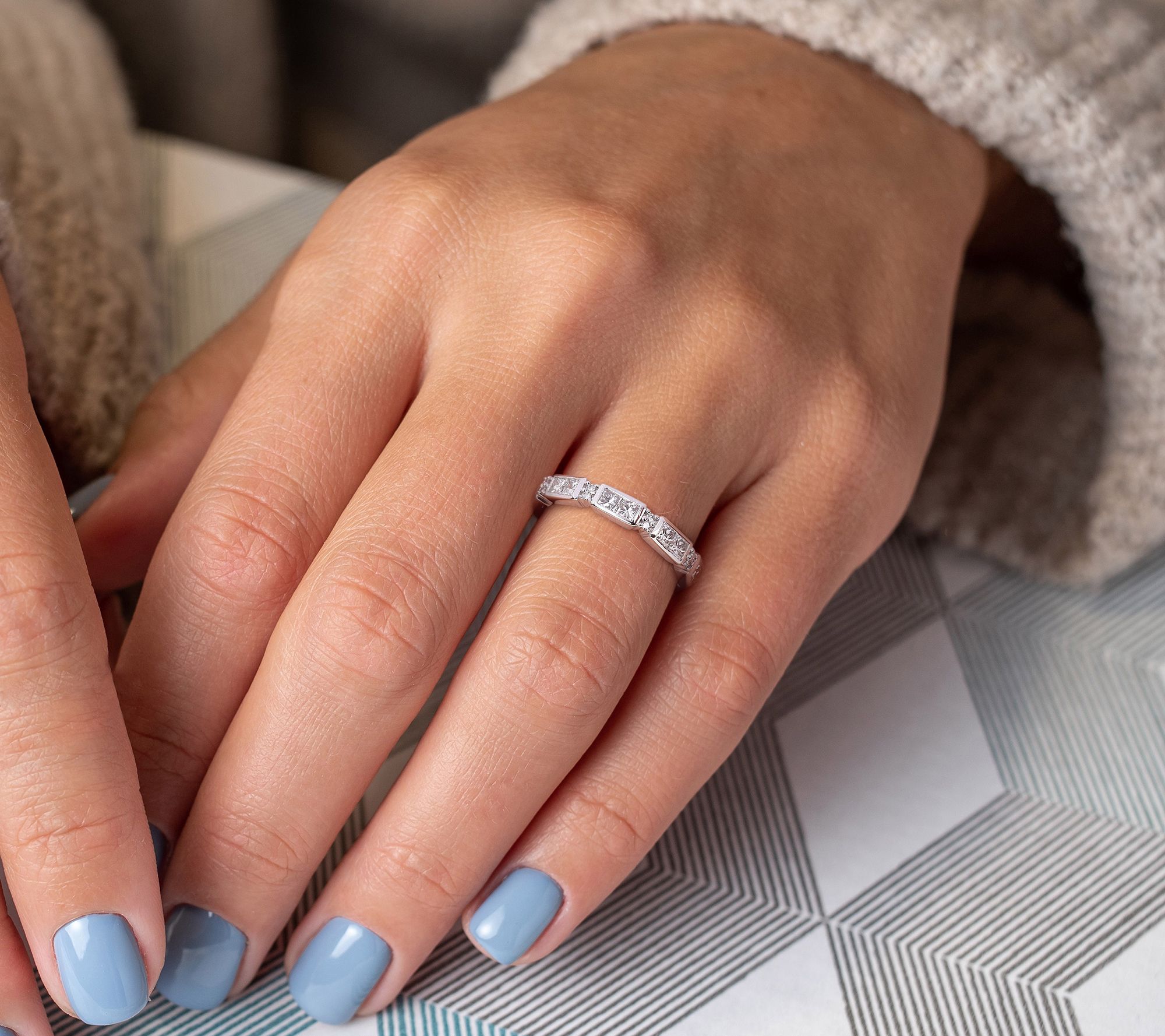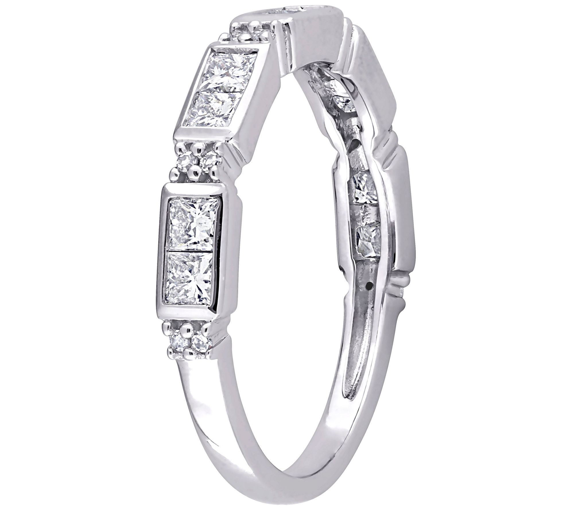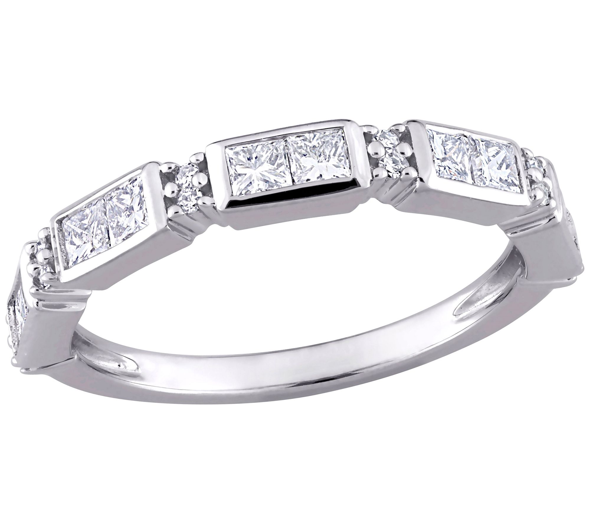 - Semi-eternity ring; round, prong-set diamonds and princess-cut, bezel-set diamonds; polished finish
