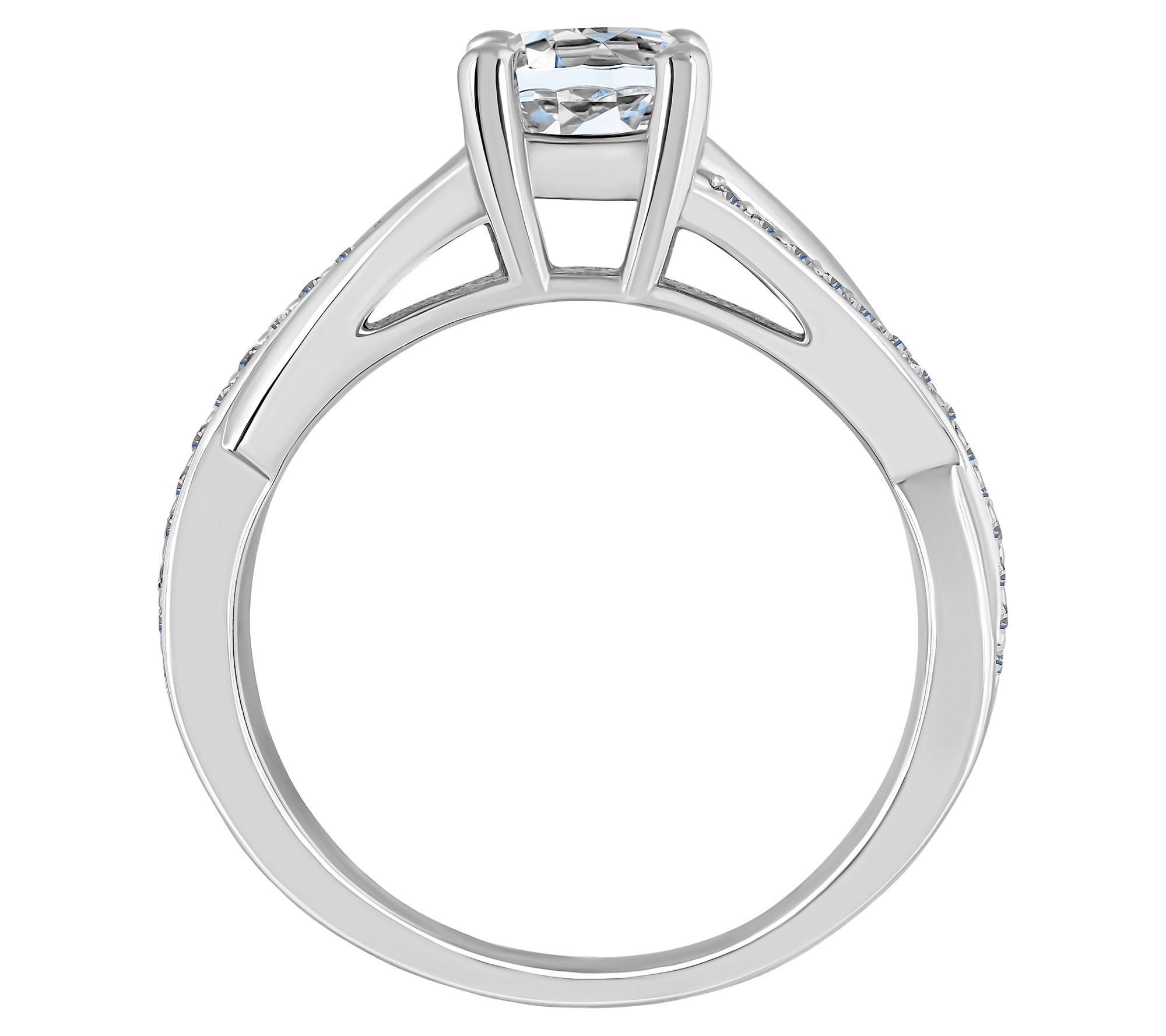 - Round-cut, prong-set white diamond center; openwork design shank with one curved row of round-cut, prong-set white diamonds