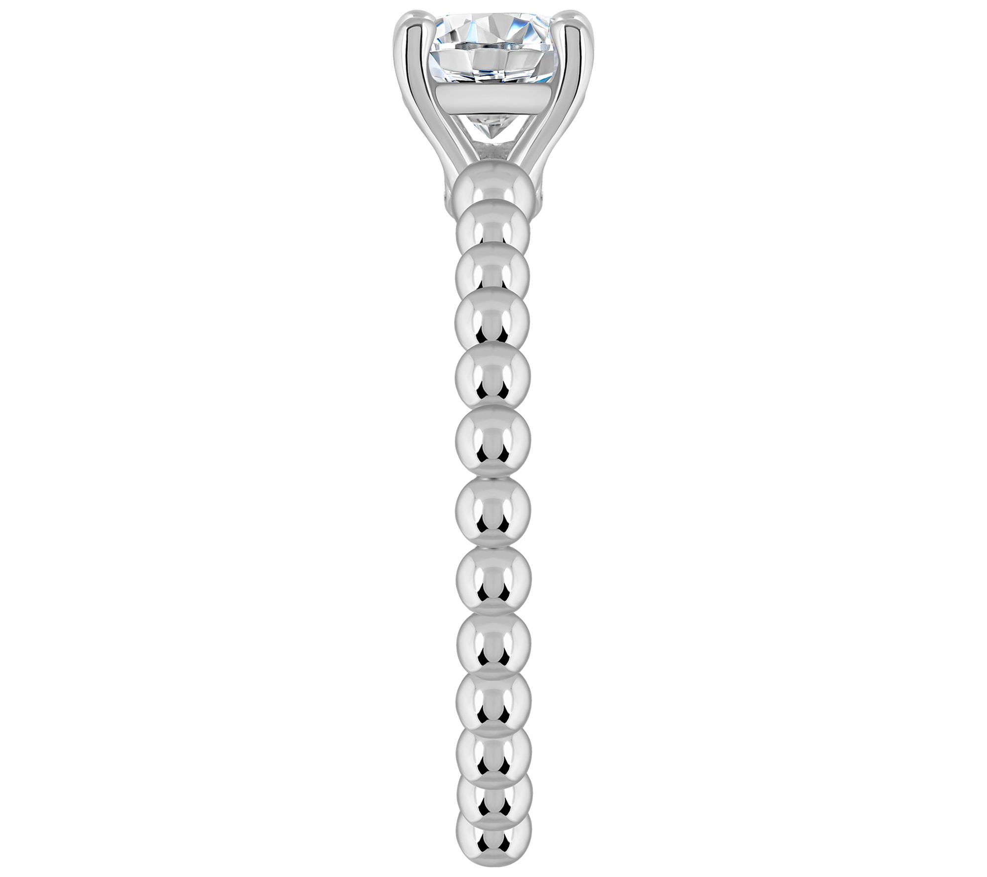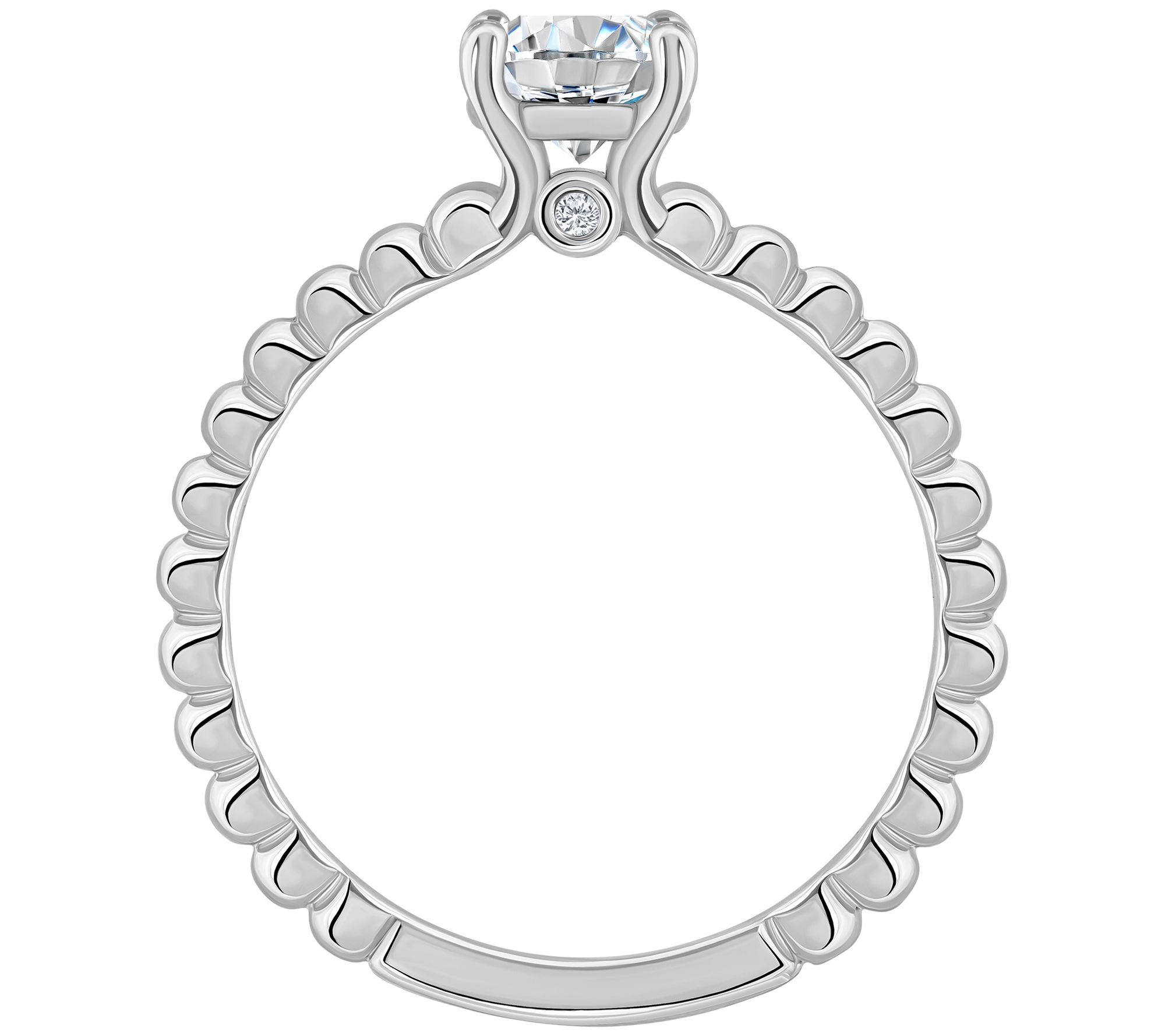 - Round, prong-set white diamond on beaded shank with a round, bezel-set white diamond set on each side