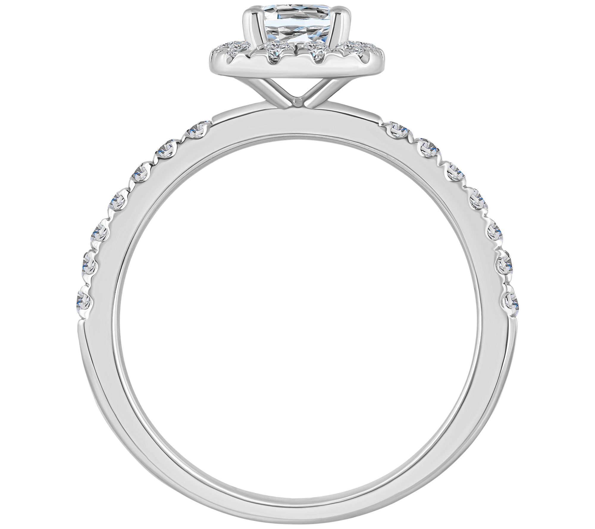 - Round, prong-set white diamond center stone surrounded by cushion-shape halo of round, prong-set white diamonds; diamonds along shank