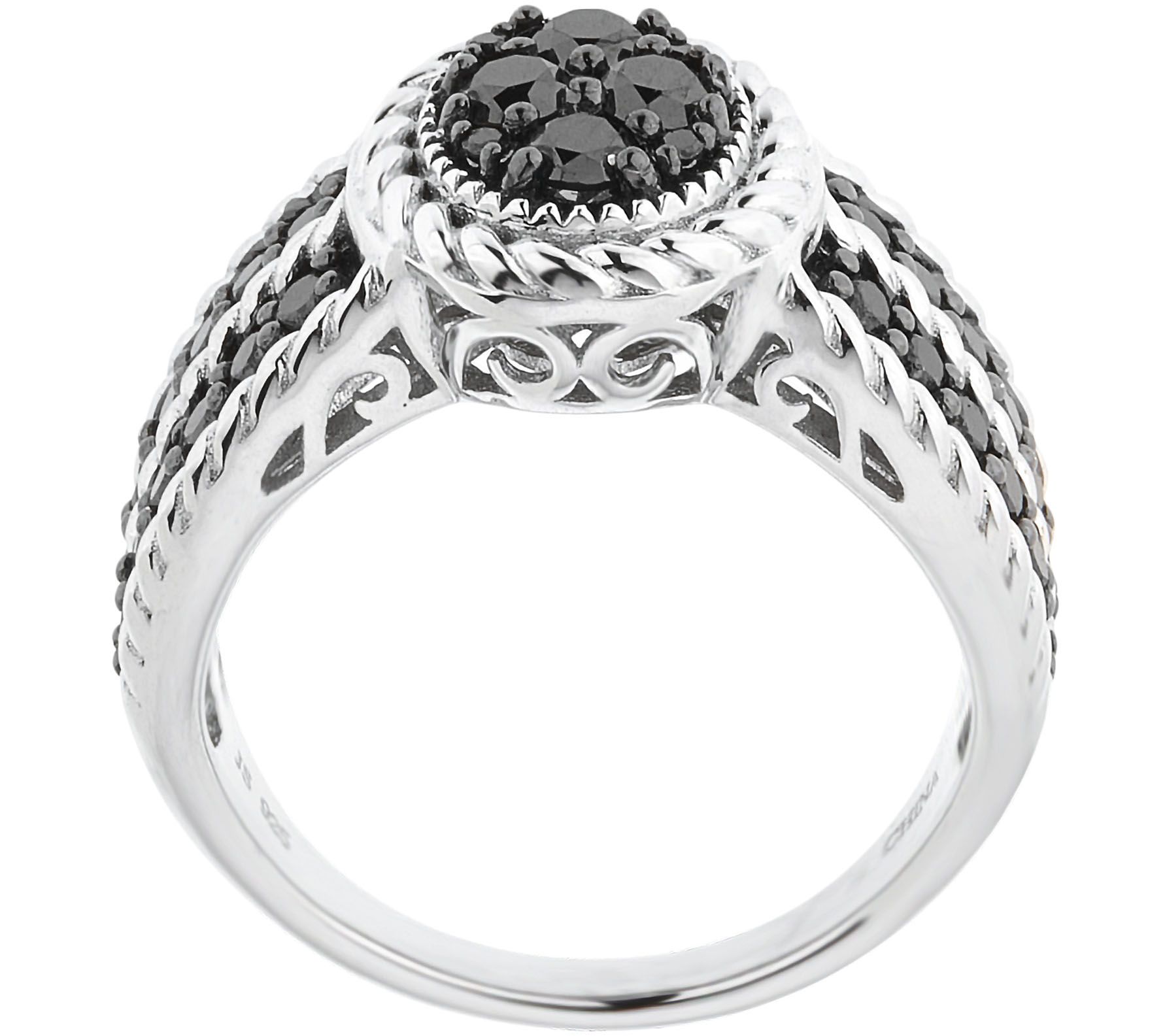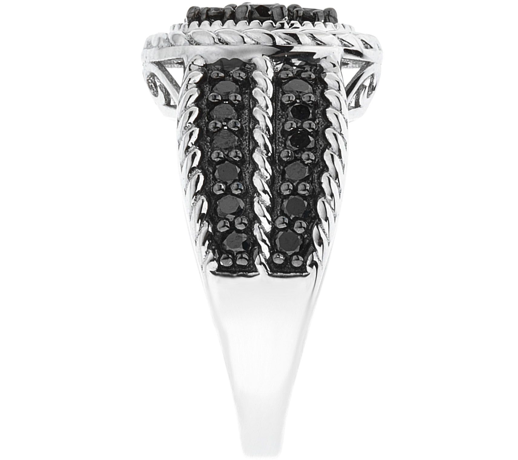 • Round, prong-set black diamonds in a center oval cluster design with a rope border; two rows of round black diamonds with rope-textured outlines on either side; black diamonds are set in black rhodium plating