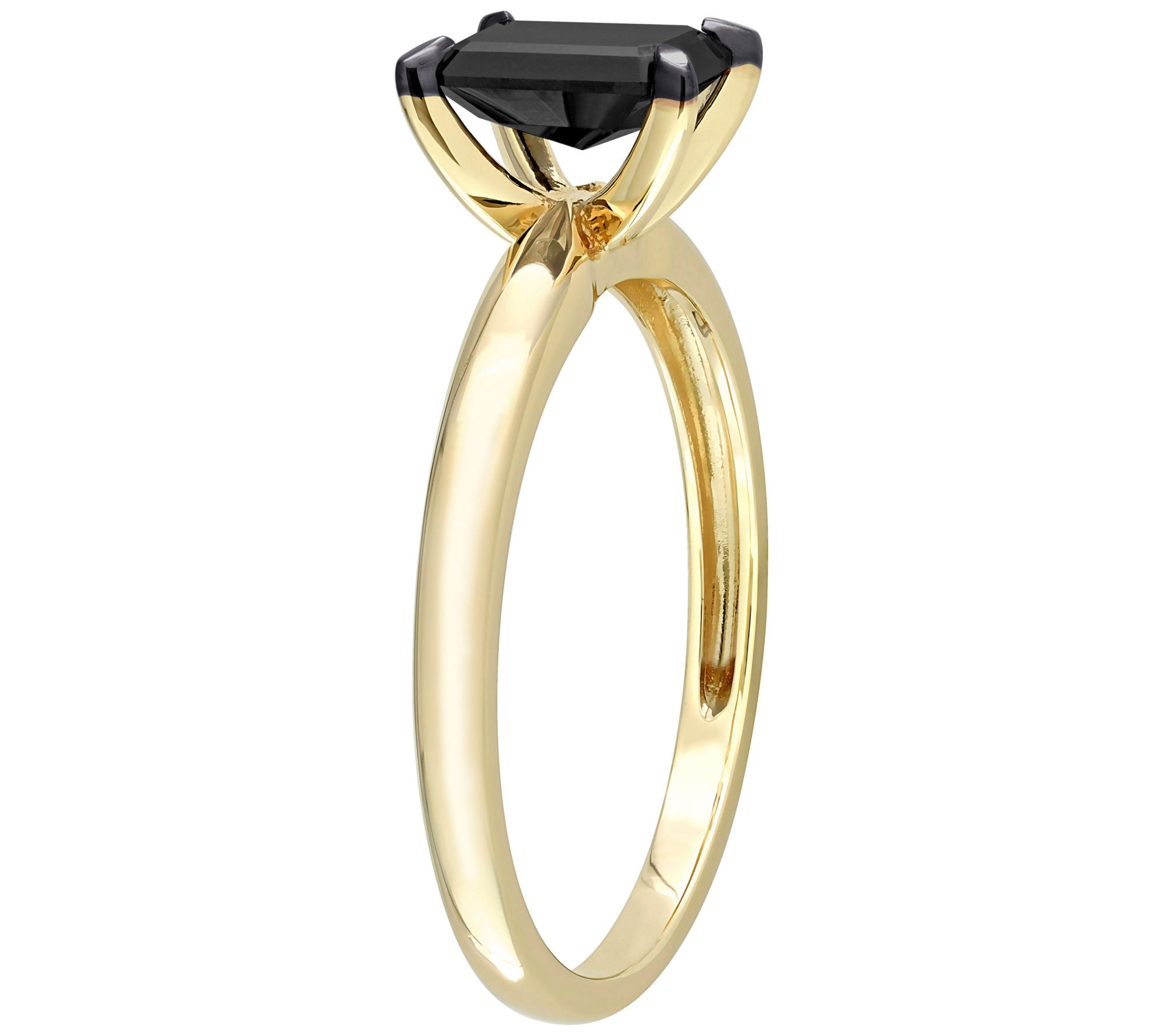 - Solitaire engagement ring with emerald-cut, prong-set black diamond; polished finish