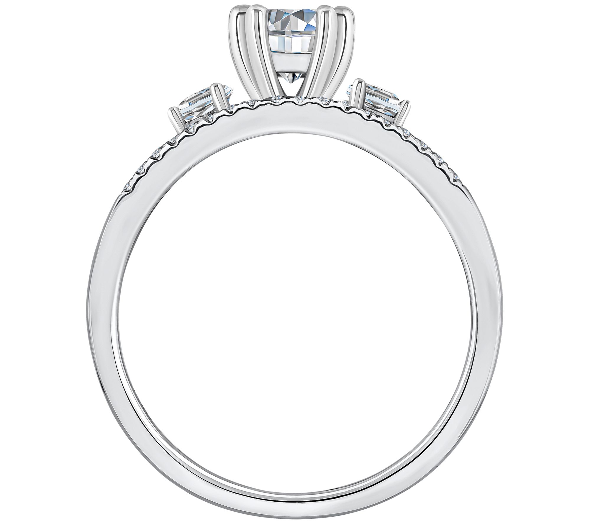 Three round, prong-set white diamonds; largest diamond in center; split shank with pave diamonds running above and below