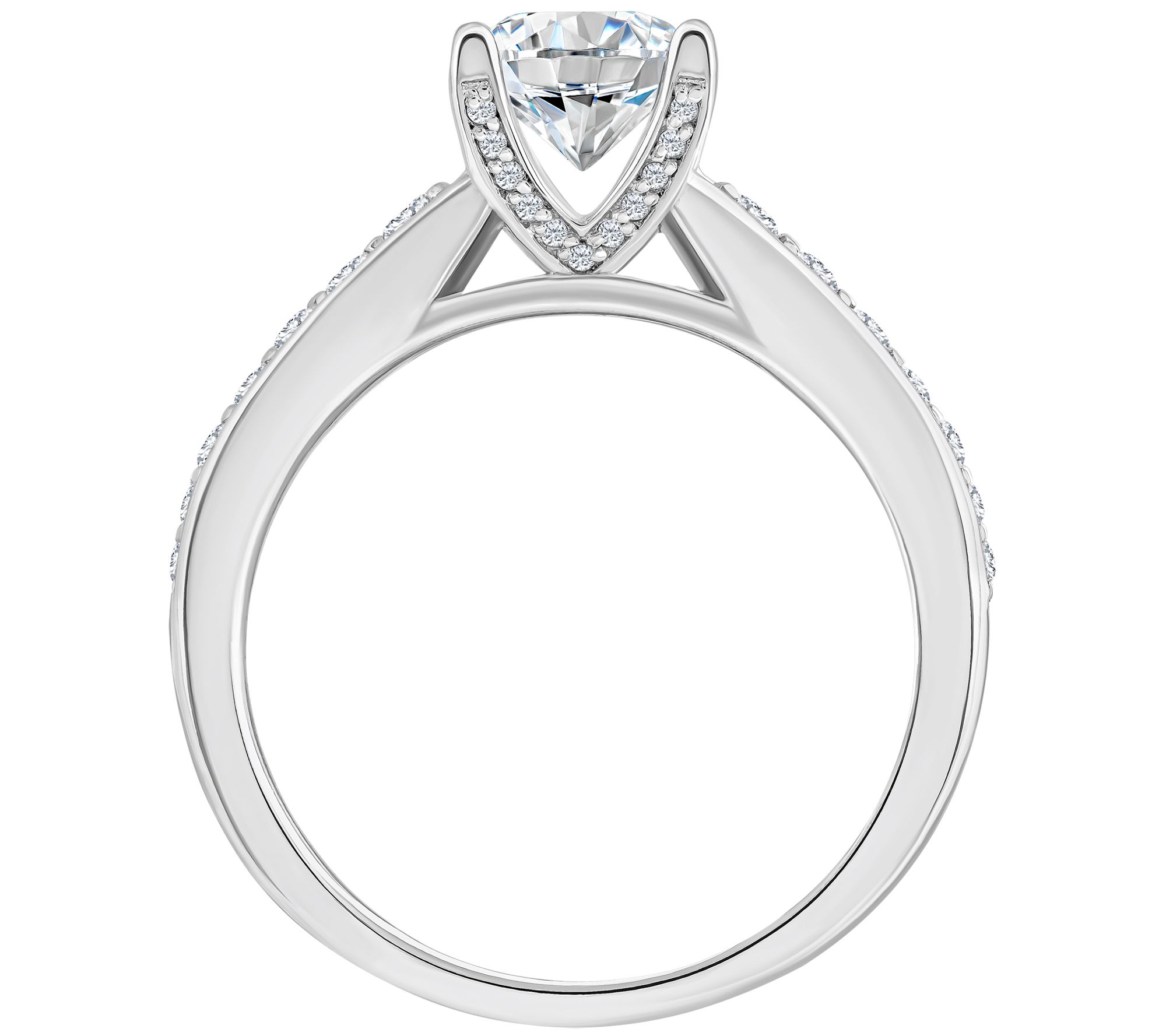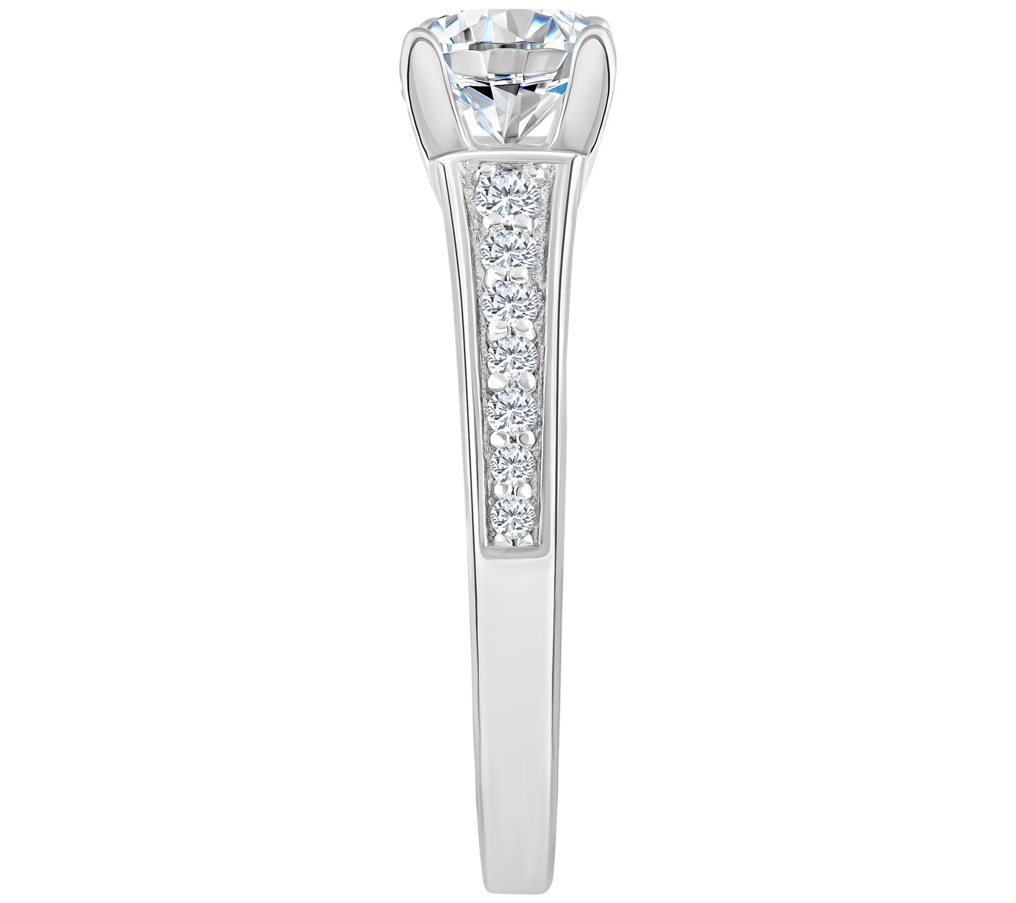 • Round, prong-set diamond at center; round, prong-set diamonds on band sides; polished finish