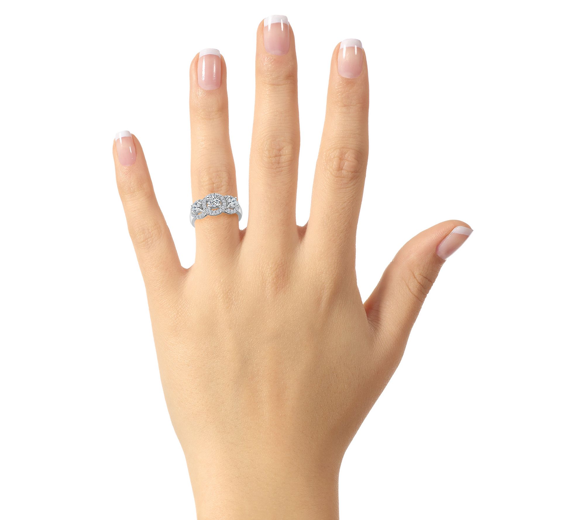 • Three round, prong-set white diamonds each surrounded by a halo of round, prong-set white diamonds; largest diamond at the center
