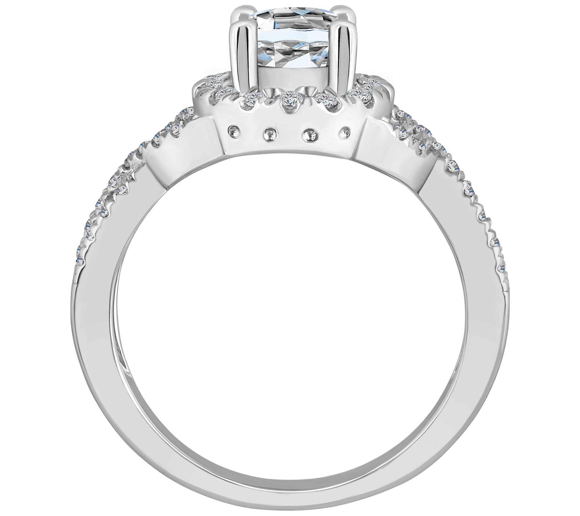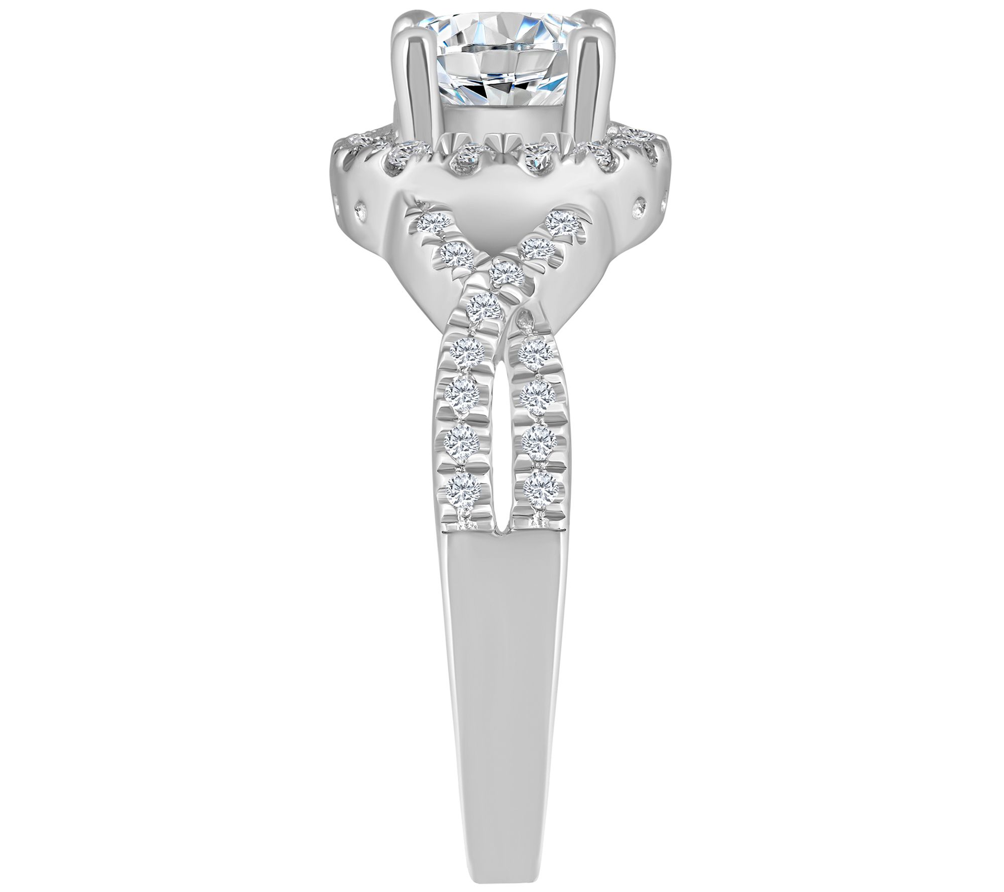 Round, prong-set white diamond center surrounded by a halo of round, prong-set white diamonds; round, prong-set white diamonds along twisted openwork-design shank