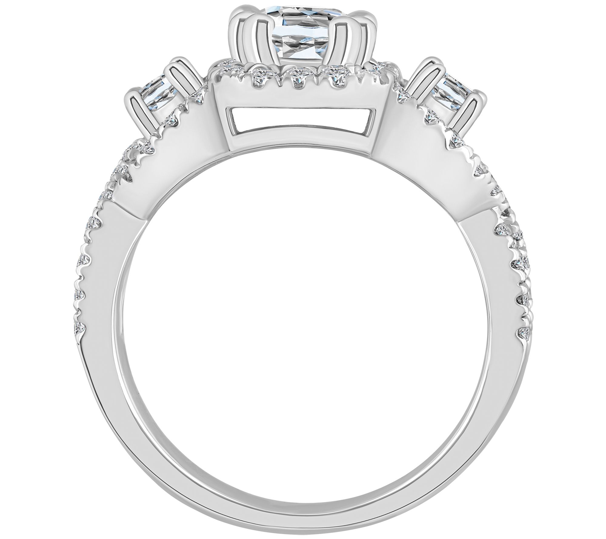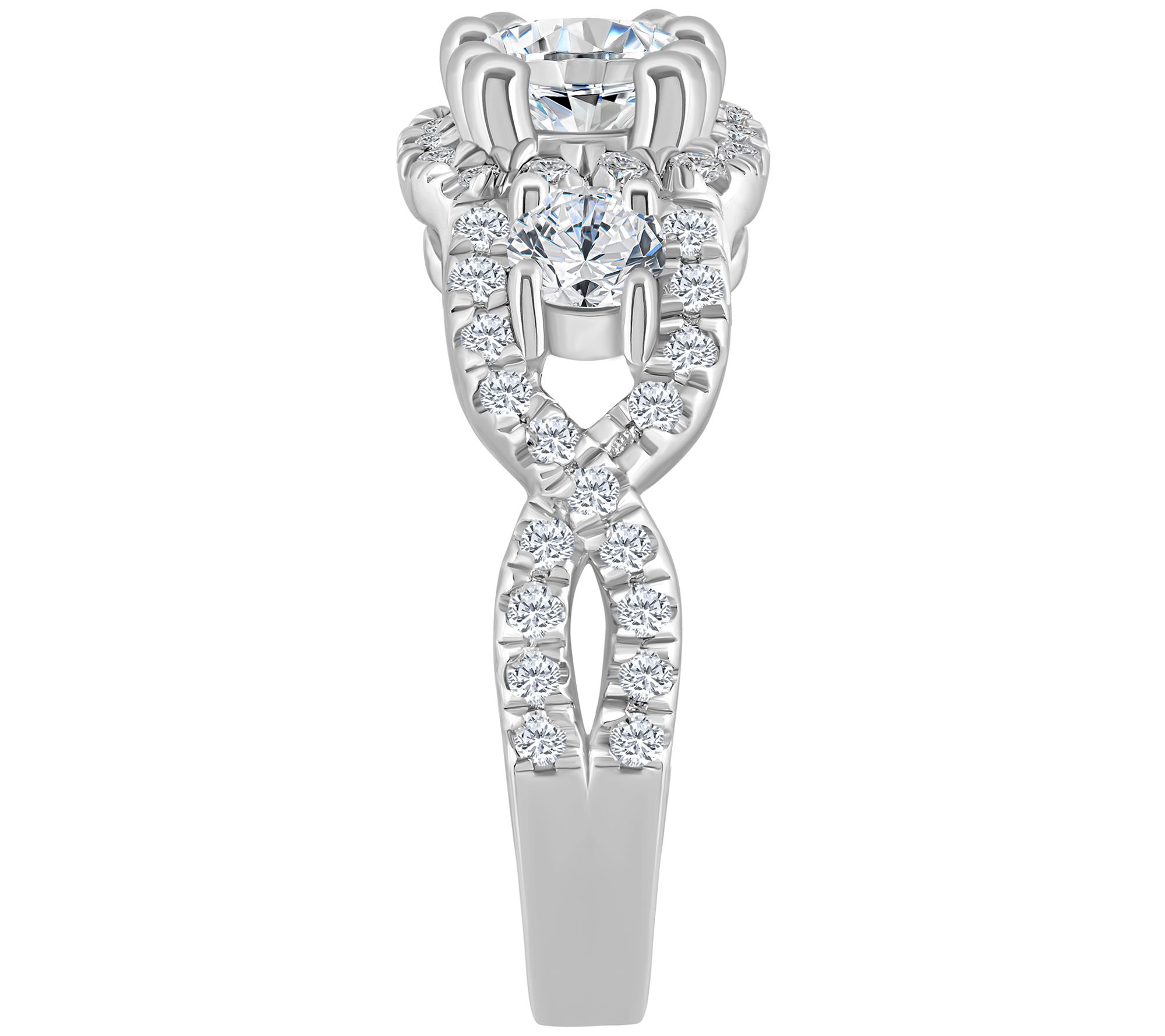 Three round, prong-set white diamond center stones surrounded by halo of round, prong-set white diamonds; diamonds along shank