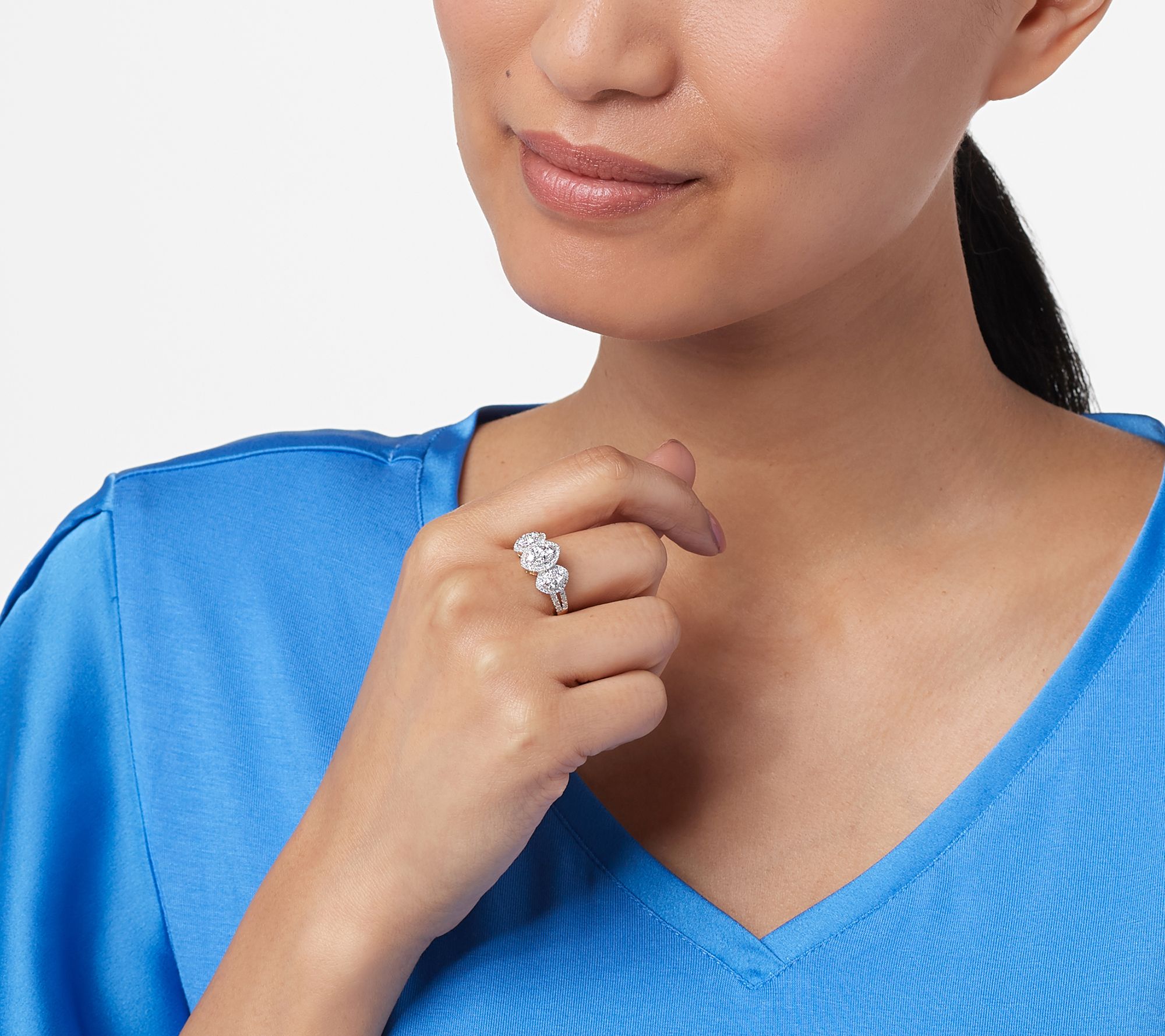 • Pave-set, round, white diamonds in three marquise-shaped clusters, each with bead-set, round, white diamond halo; bead-set, round, white diamonds on split shank with polished finish; openwork gallery with milgrain details; white rhodium plating on diamond settings