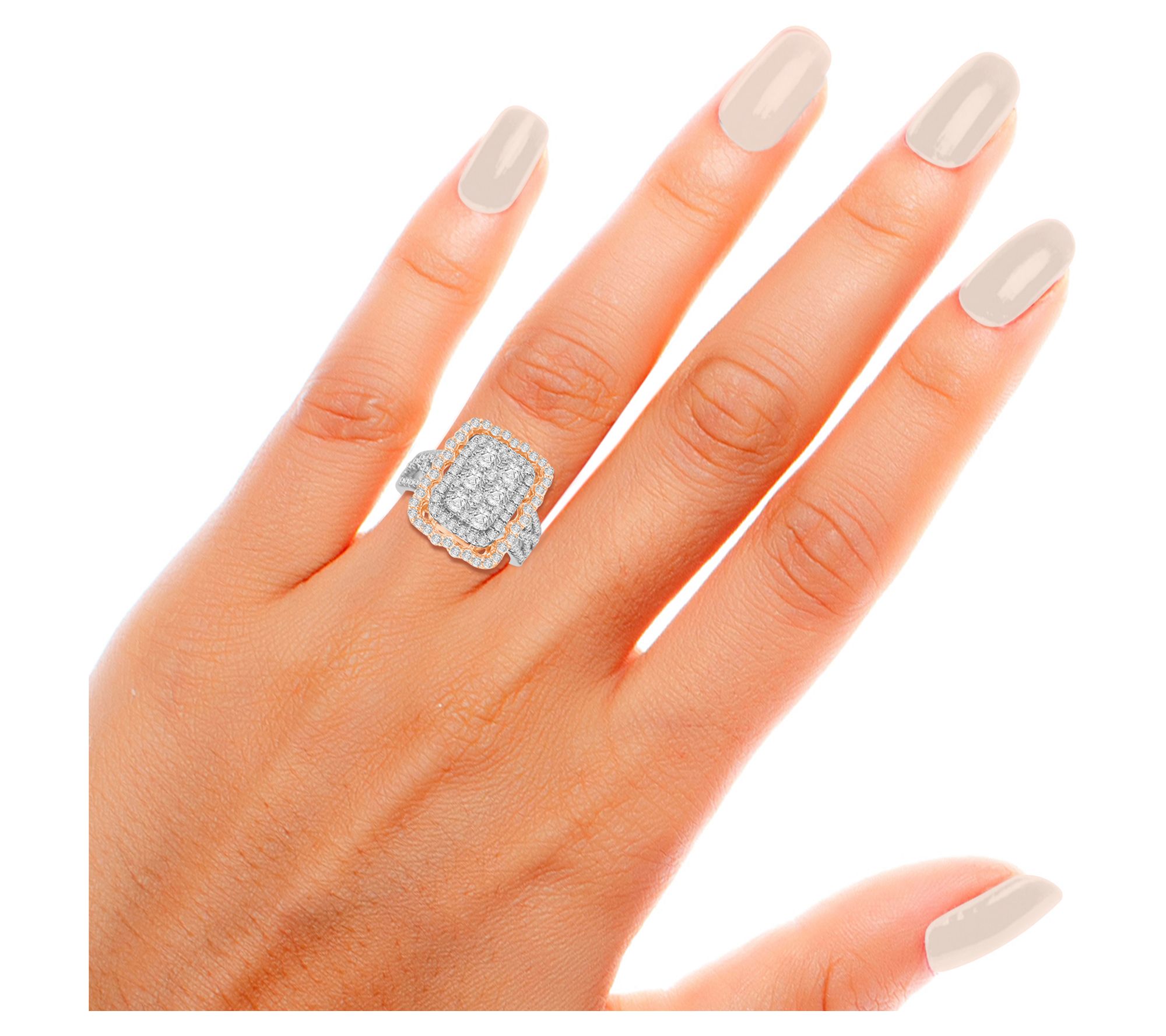 Two-tone cocktail ring with six large round, prong-set diamonds in the center; smaller round, prong-set diamonds surrounding and throughout; polished finish