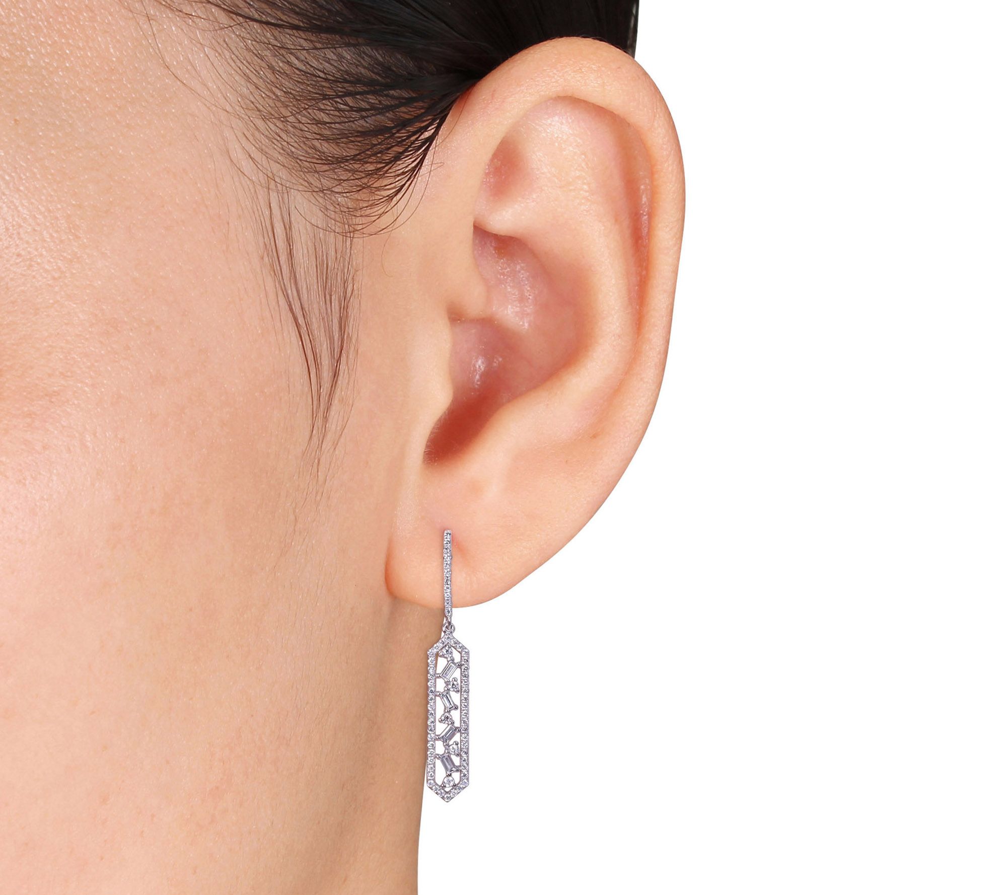 • Geometric drop earrings with baguette-cut and round-cut shared prong-set diamonds; round, prong-set diamonds border the drop and bar- shaped post; polished finish