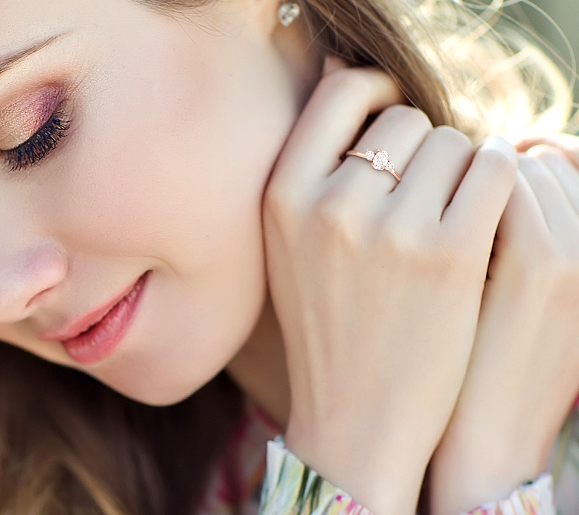 - Oval, prong-set white diamond in center; round, prong-set white diamond on each side; polished finish