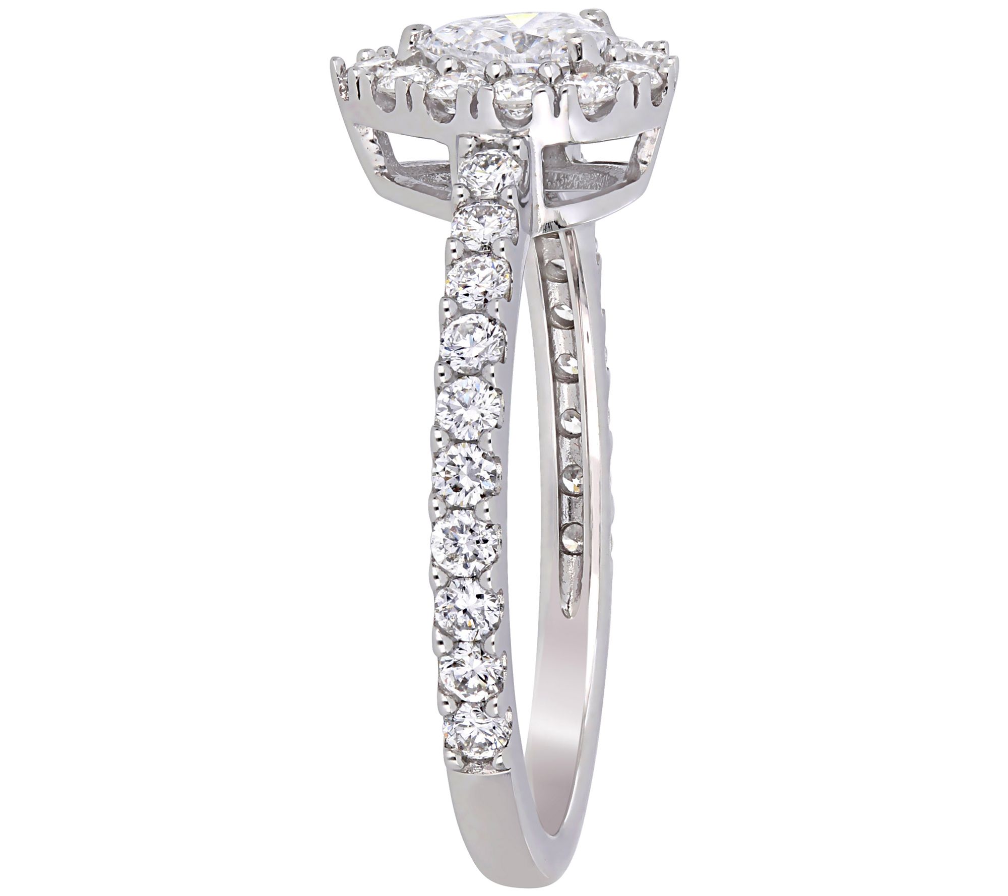 - Pear-cut, prong-set white diamond in center; round, bead-set white diamonds on halo and shank; polished finish
