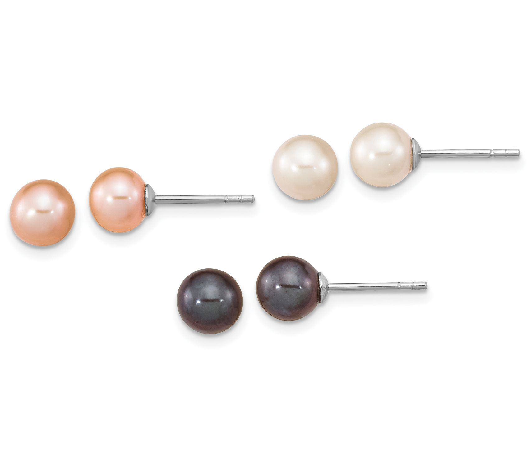 • Three pairs of round, cultured freshwater pearl studs in white, black, and pink colors