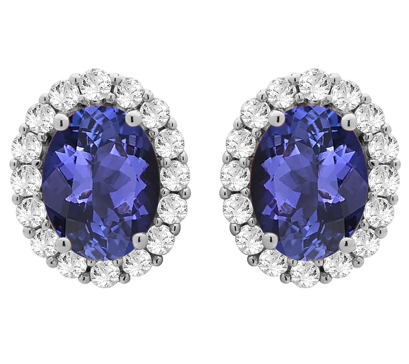 Stud design; oval, prong-set Tanzanite center gemstone surrounded by halo of round, prong-set diamonds