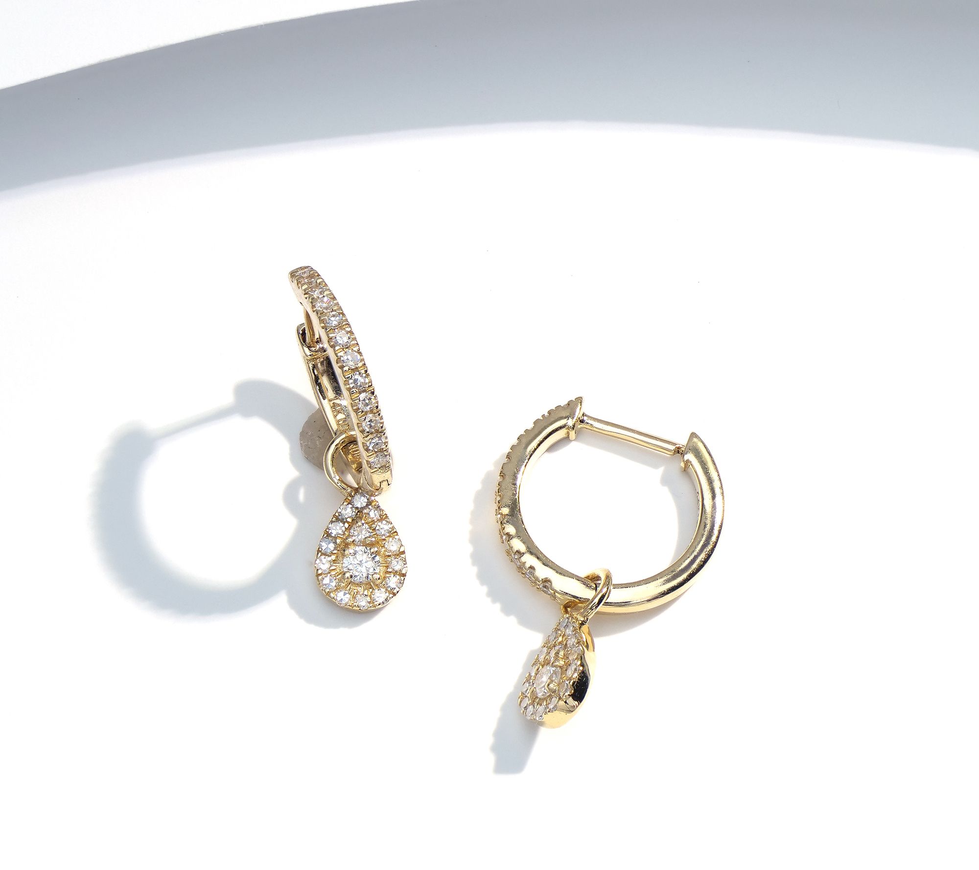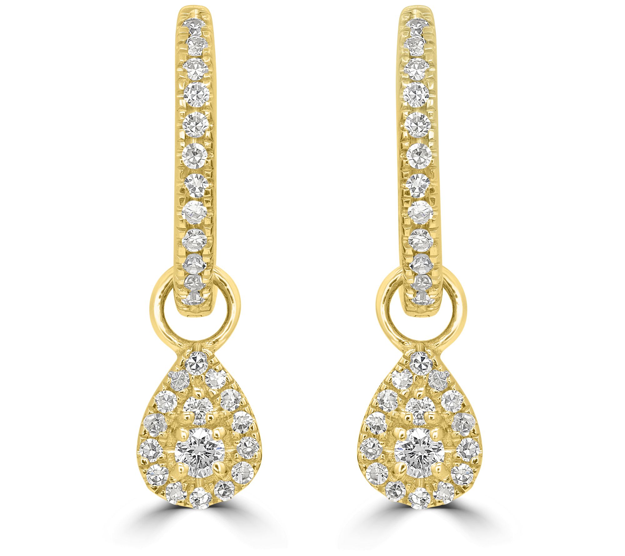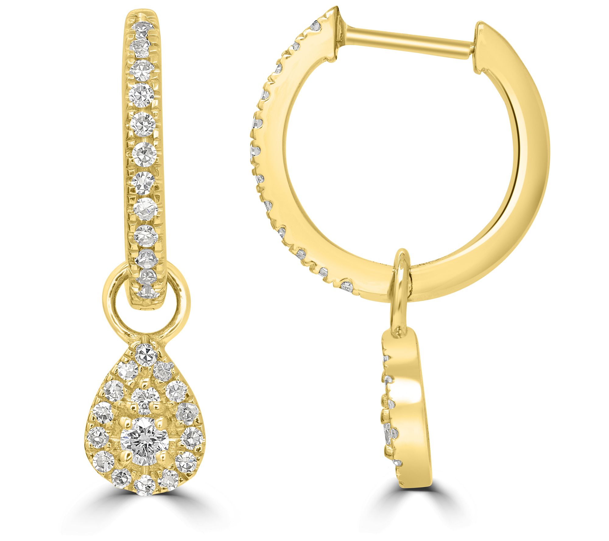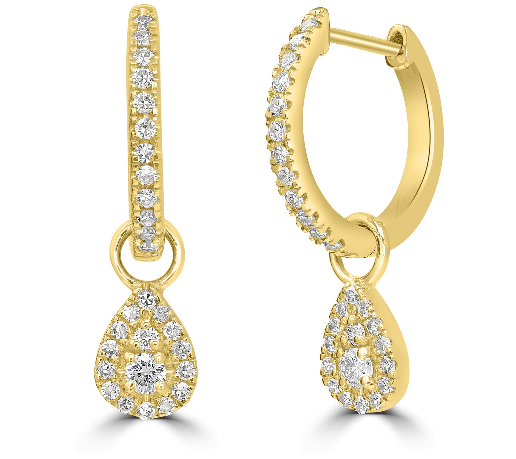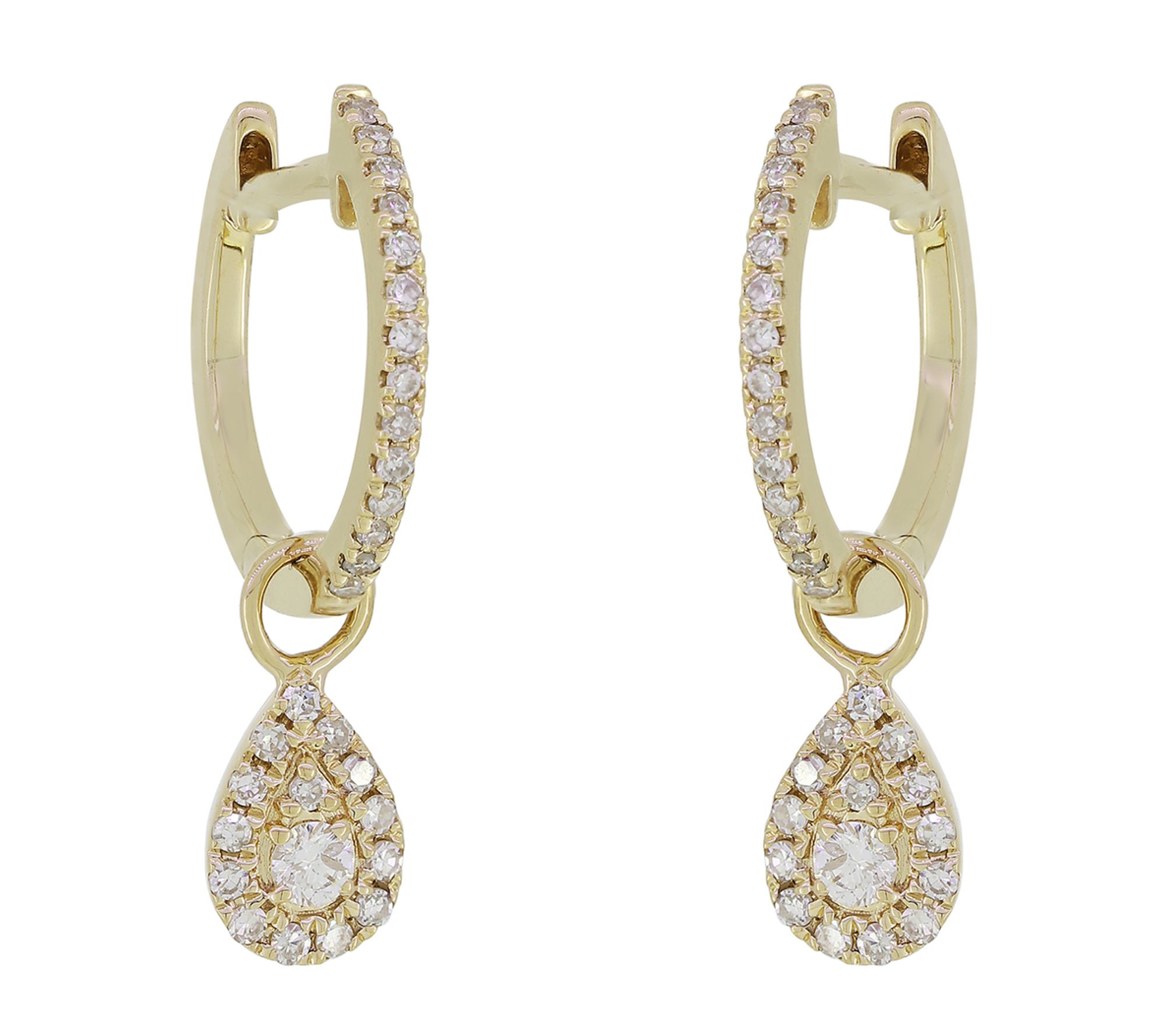 - Round hoop design with round-cut, prong-set diamonds; teardrop shaped charm with round-cut prong-set diamonds