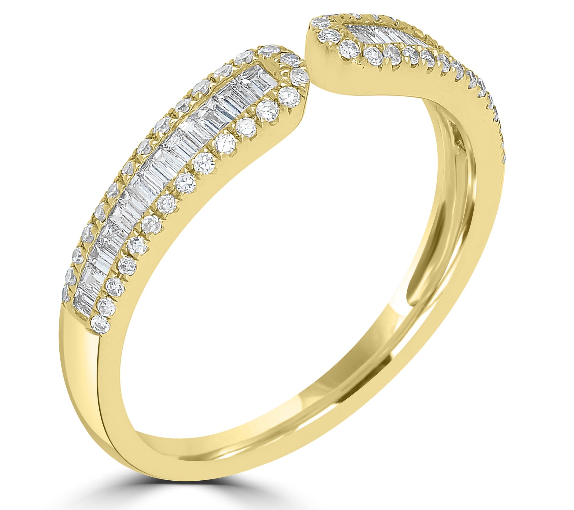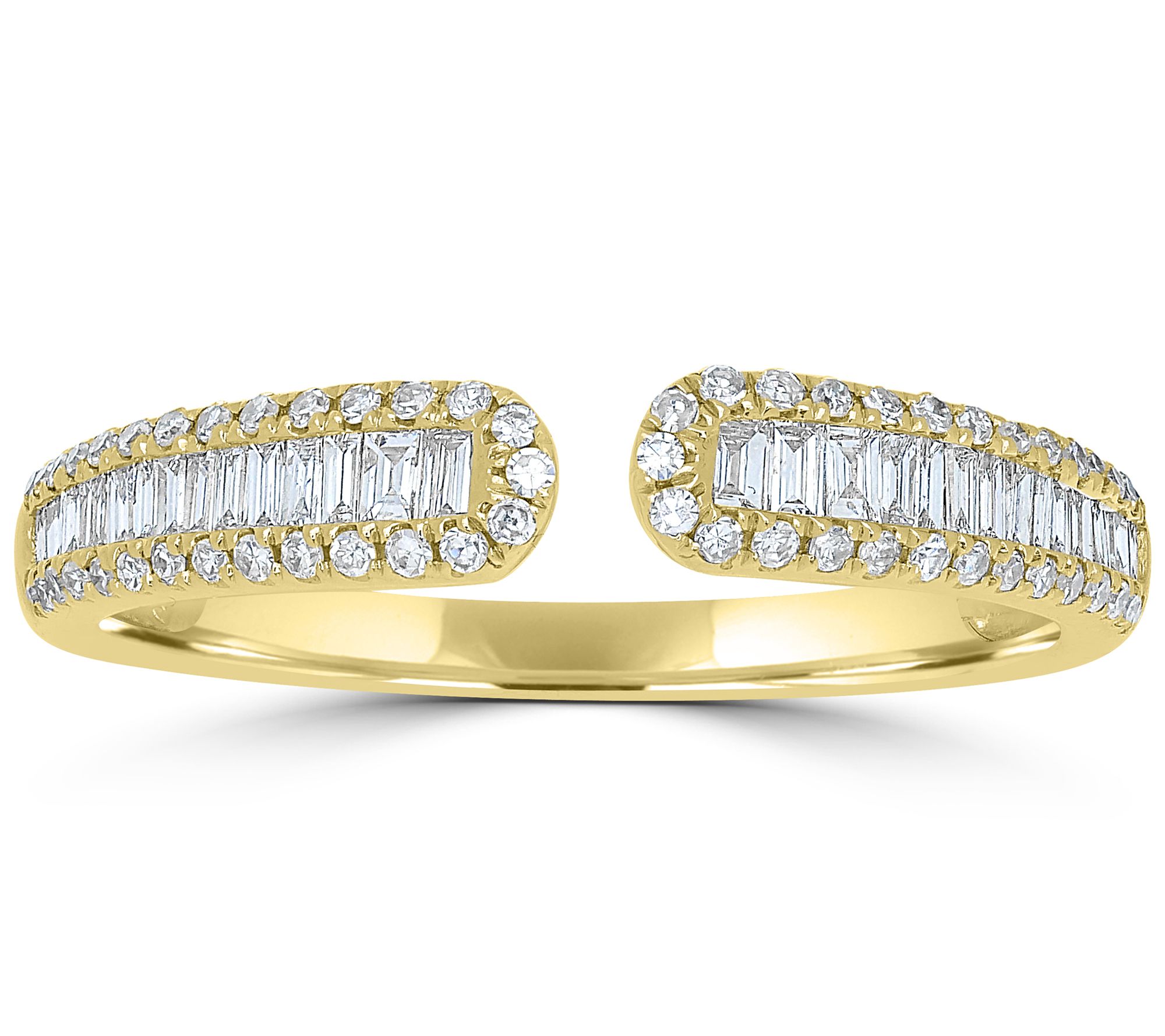 - Cuff design with baguette-cut, channel-set white diamonds and a border of round-cut, prong-set diamonds; polished finish