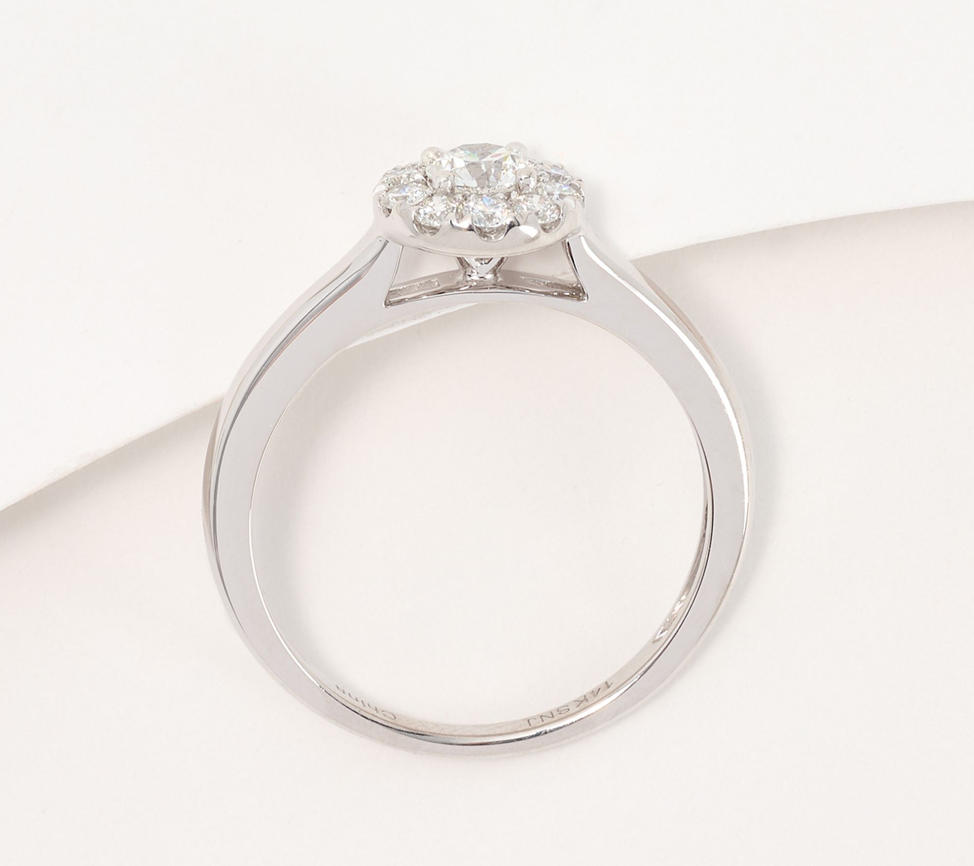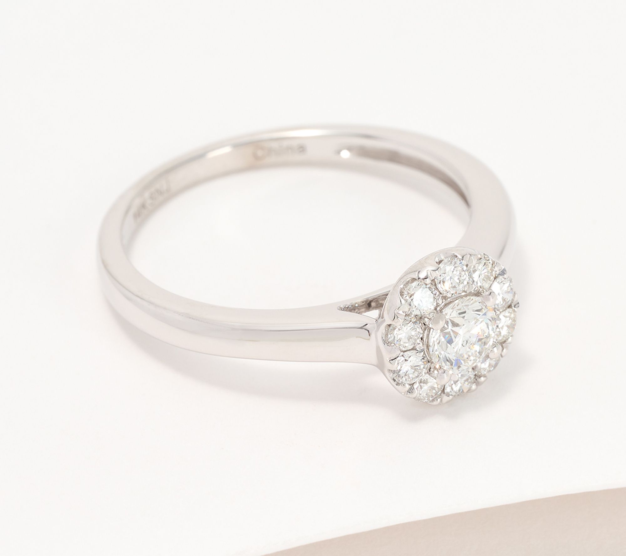 Total diamond weights are approximate: Center 0.23 carat; Halo 0.25 carat; diamond weights are minimum weights