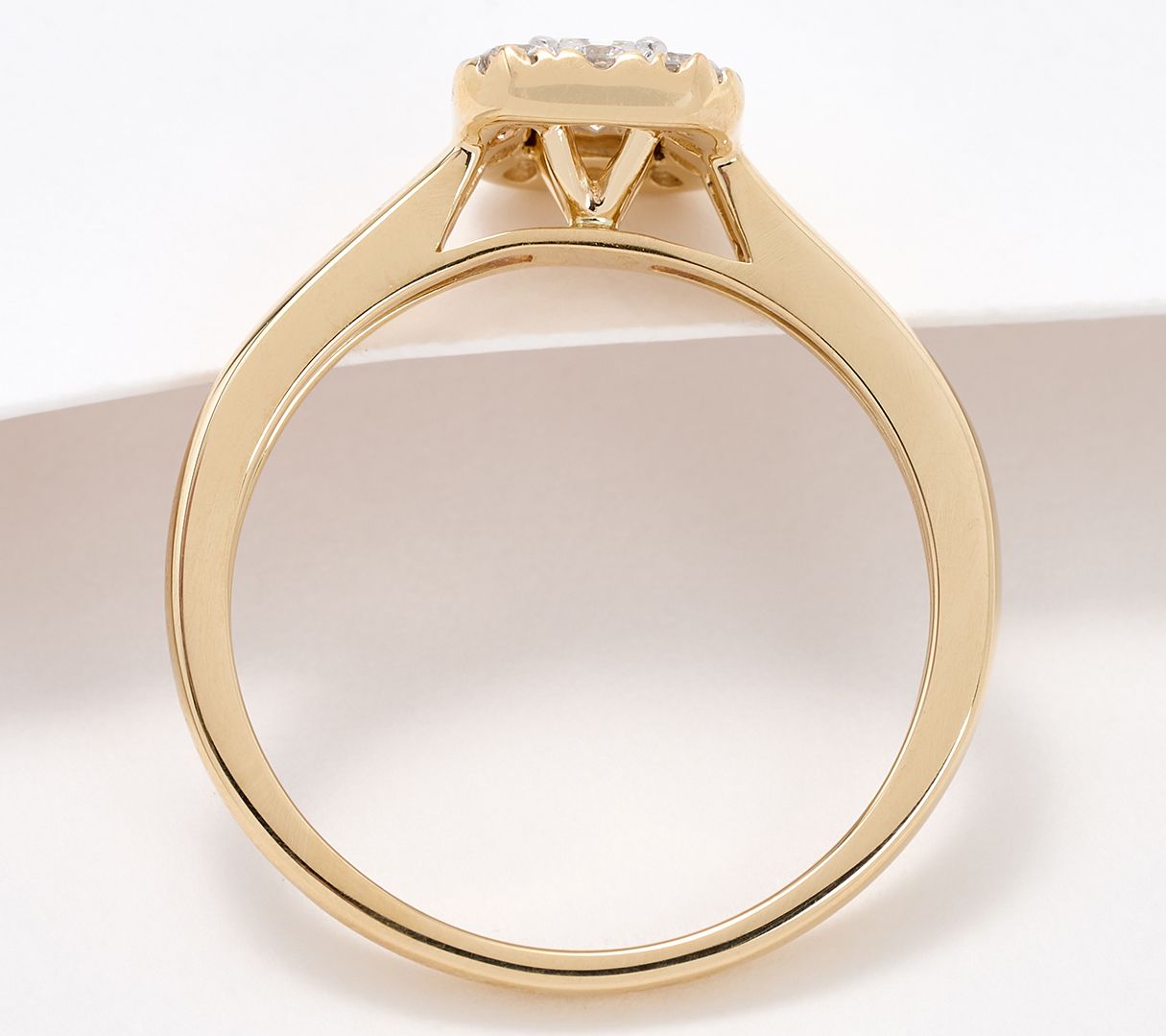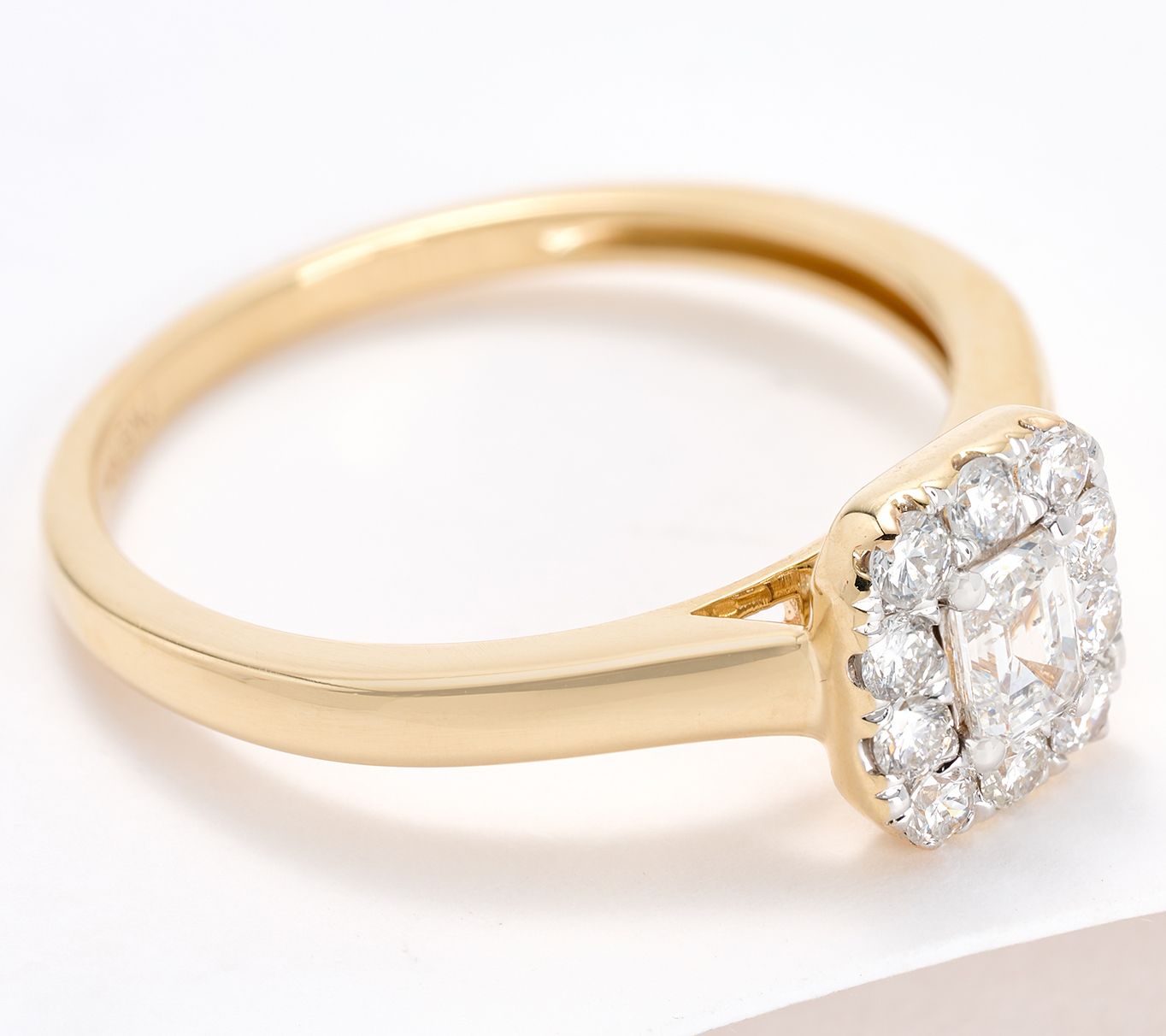 Total diamond weights are approximate: Center 0.23 carat; Halo 0.25 carat; diamond weights are minimum weights