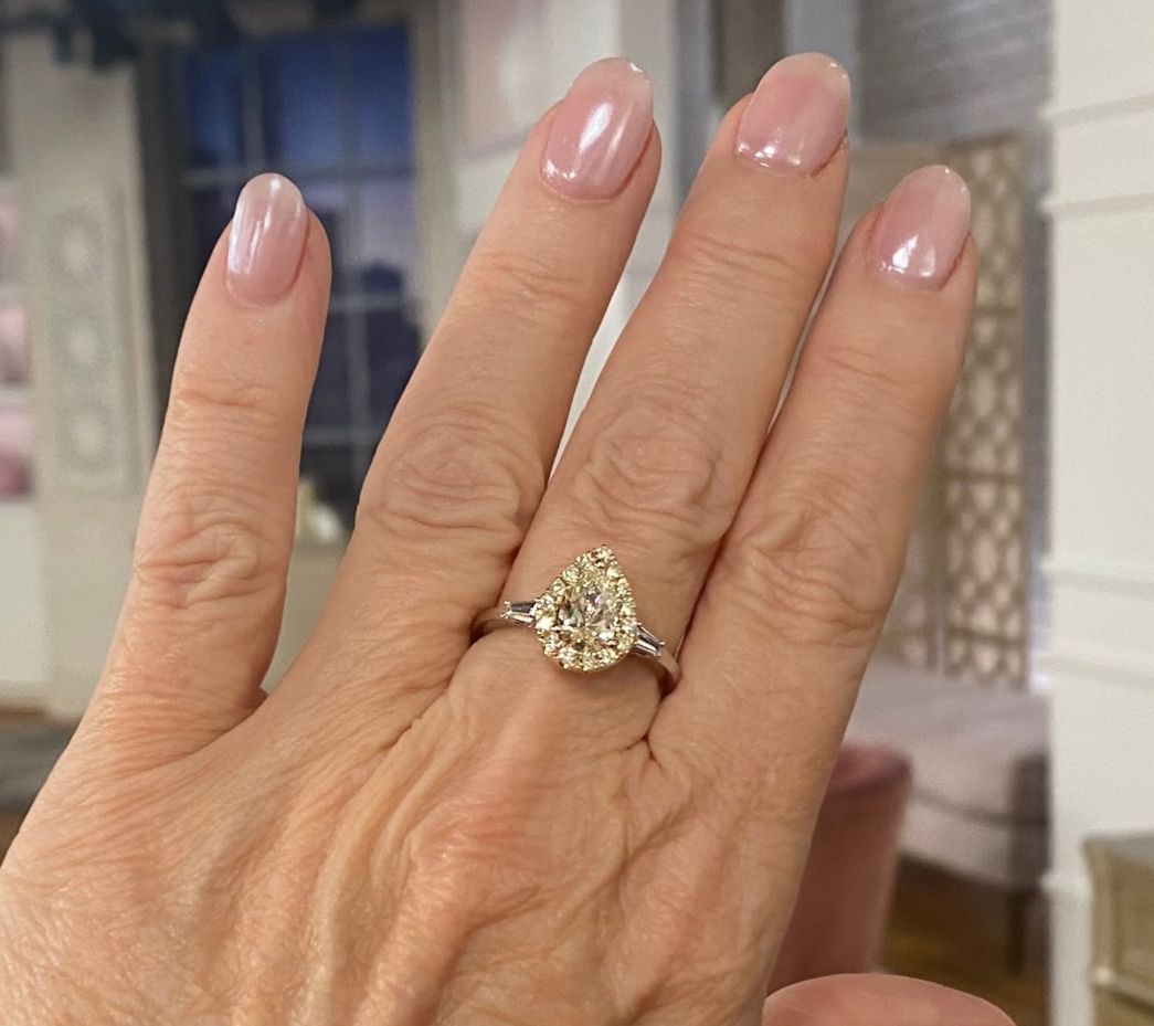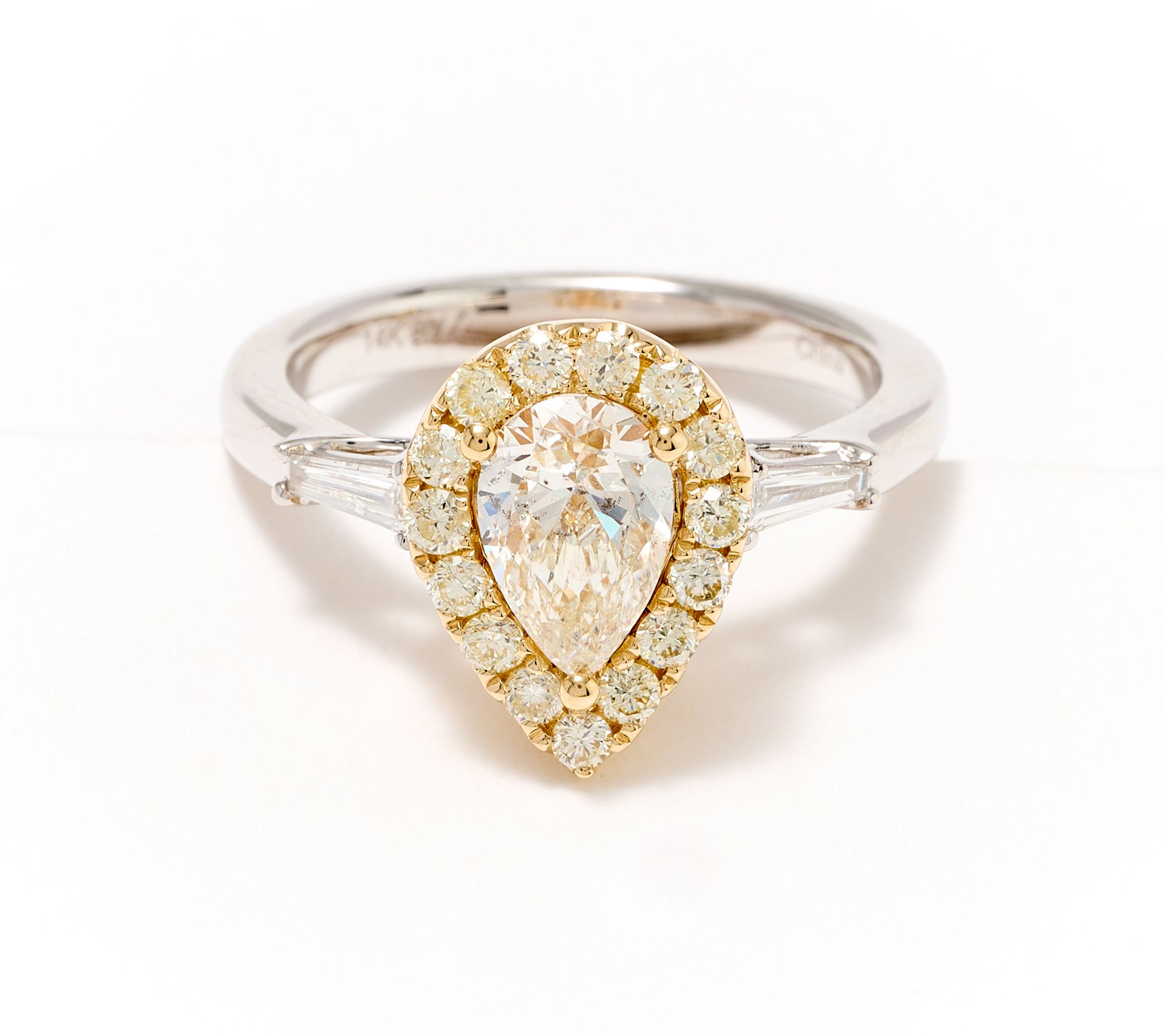 • Yellow pear-shaped diamond in center; tapered baguettes on sides; round diamond accents