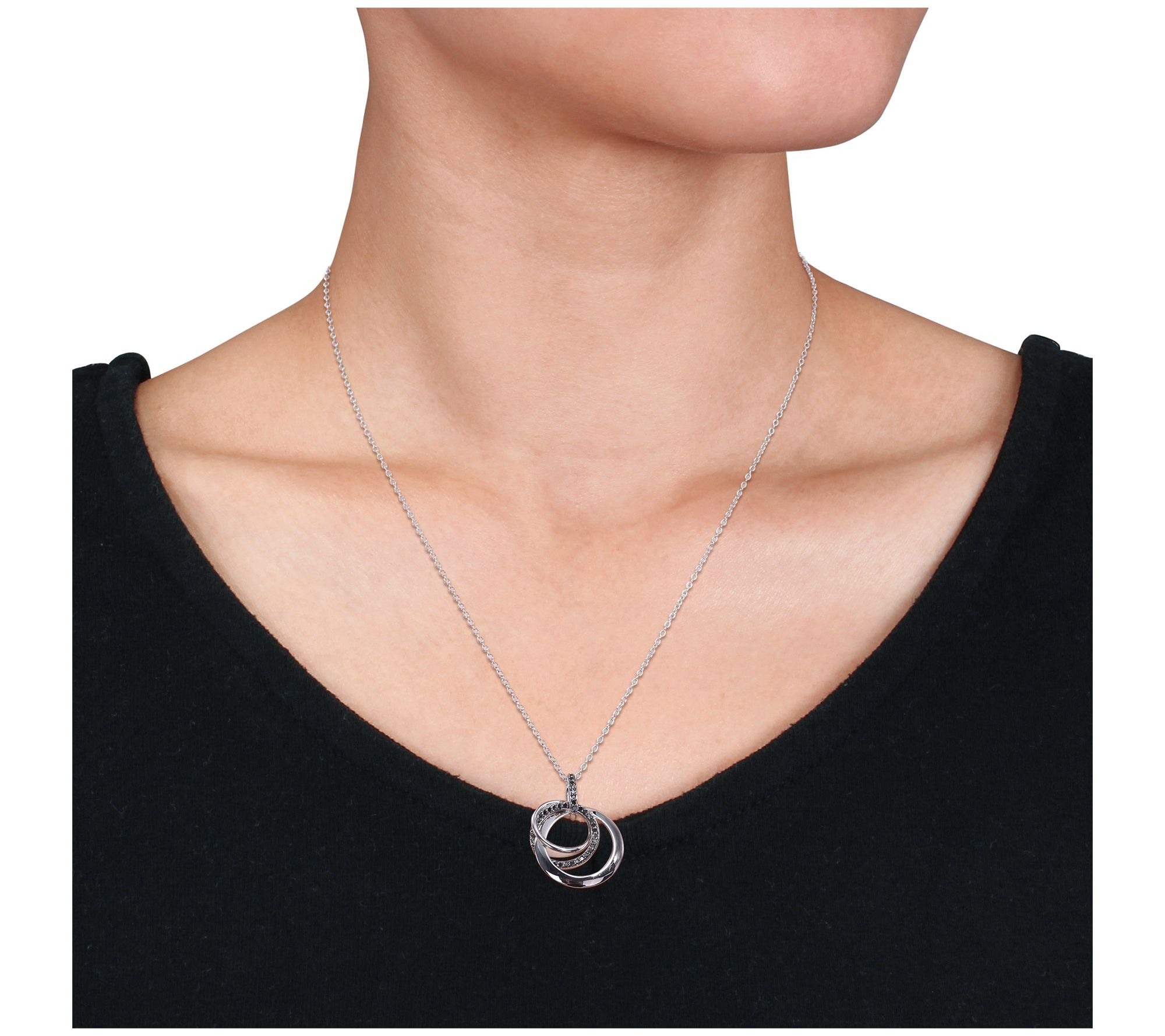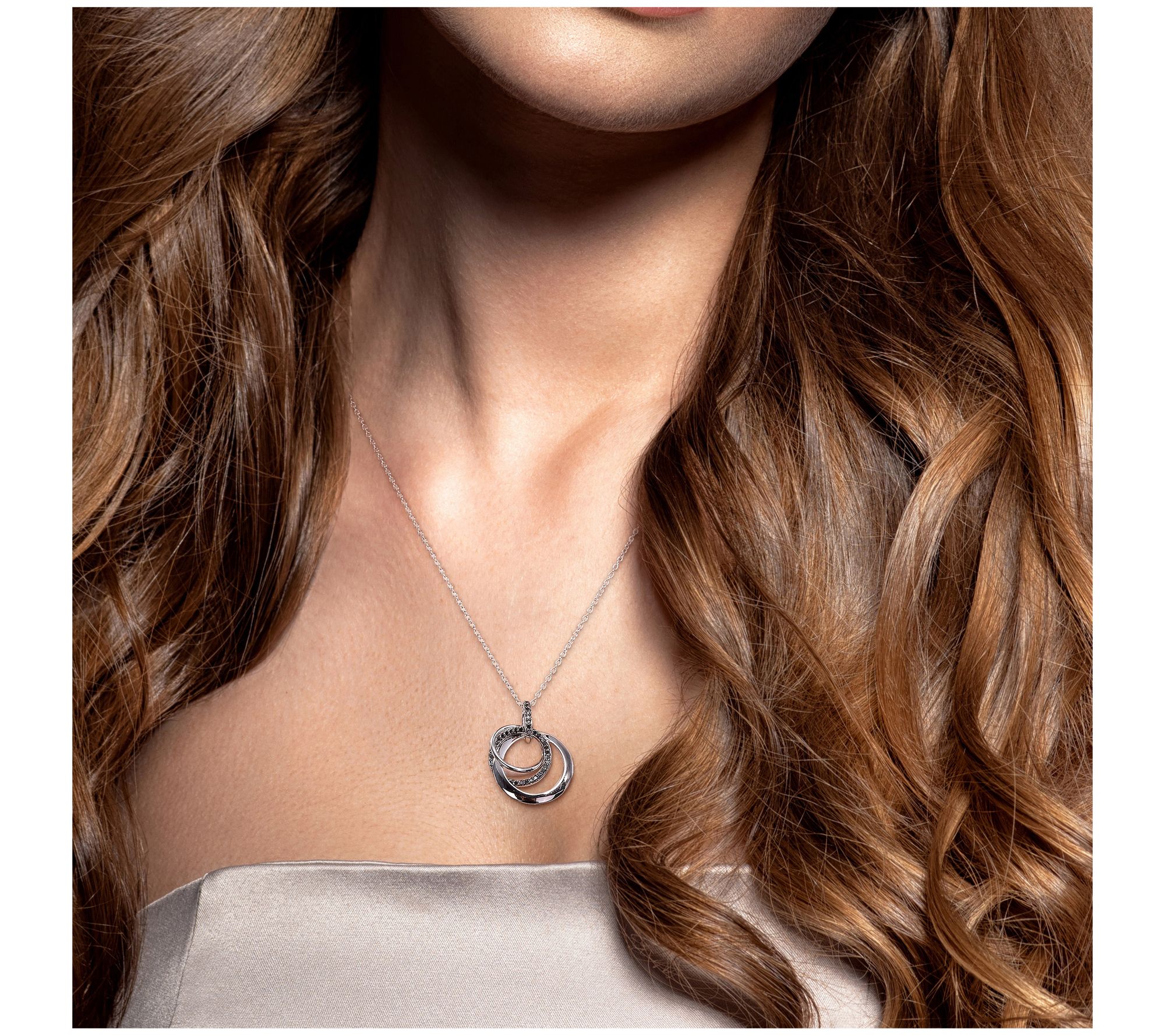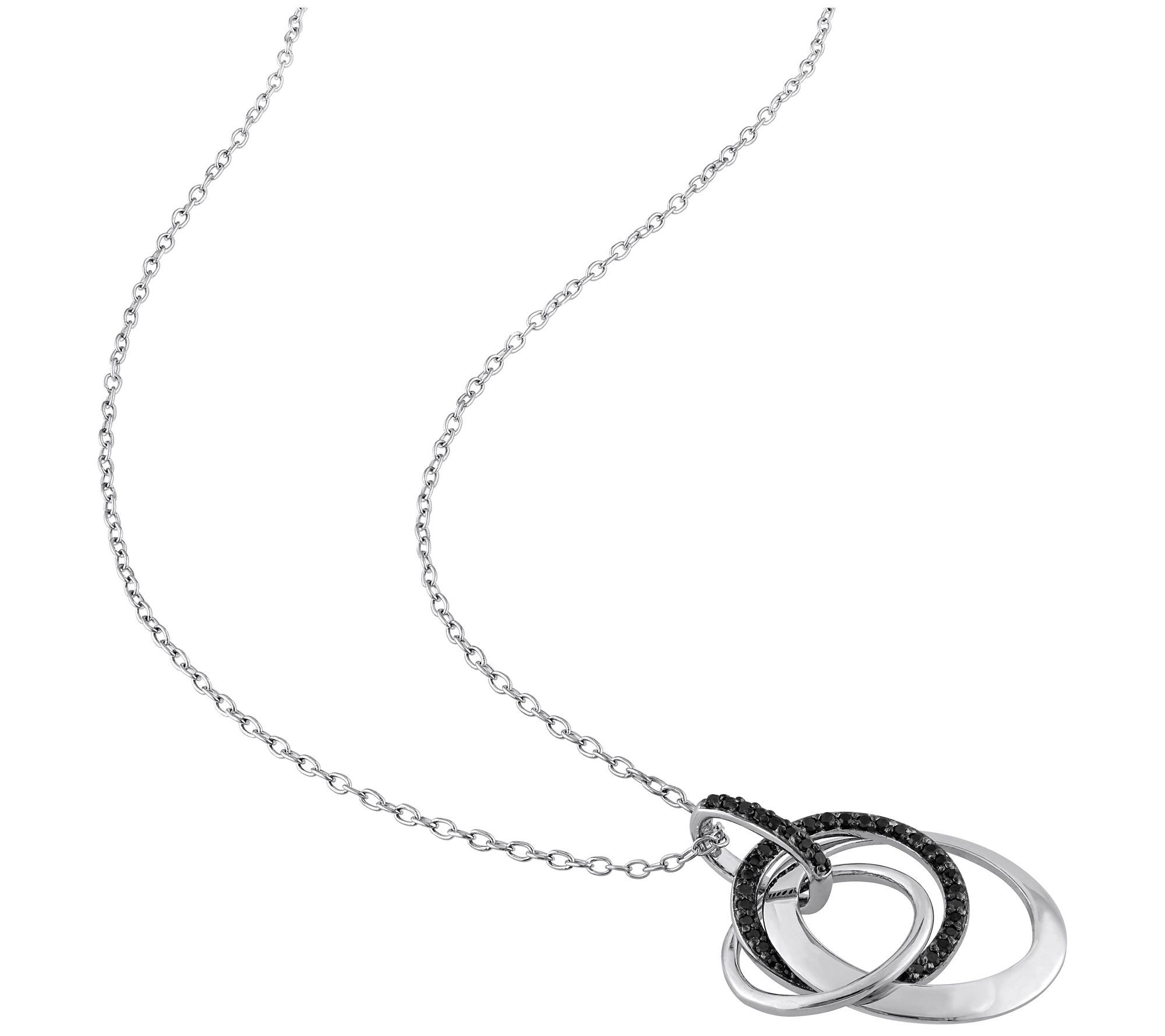 - Triple interlocked circles pendant; one with round-cut prong set black diamonds