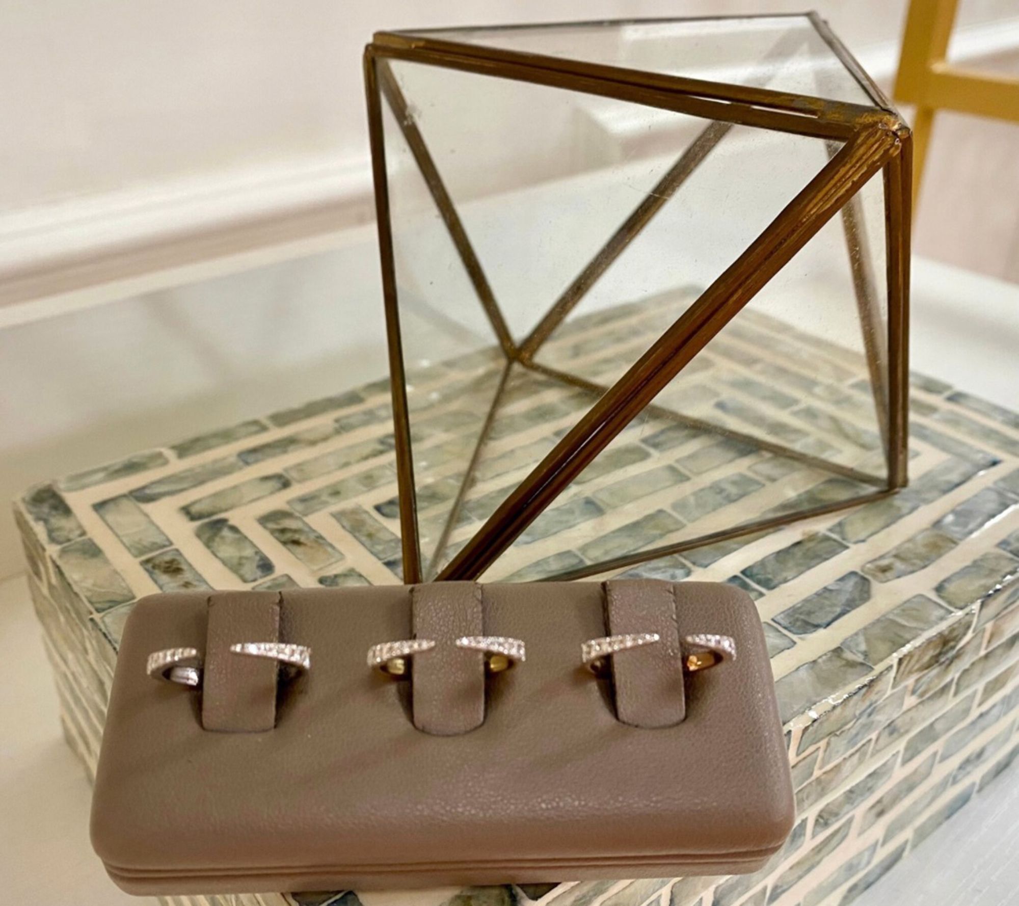 Tapered open design with round brilliant and single-cut diamonds; polished finish