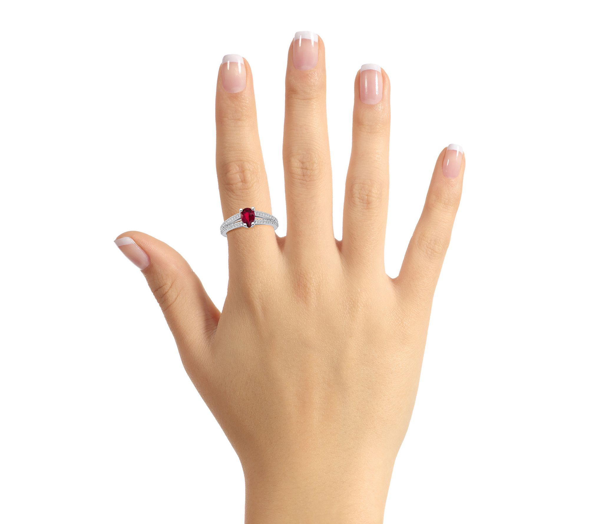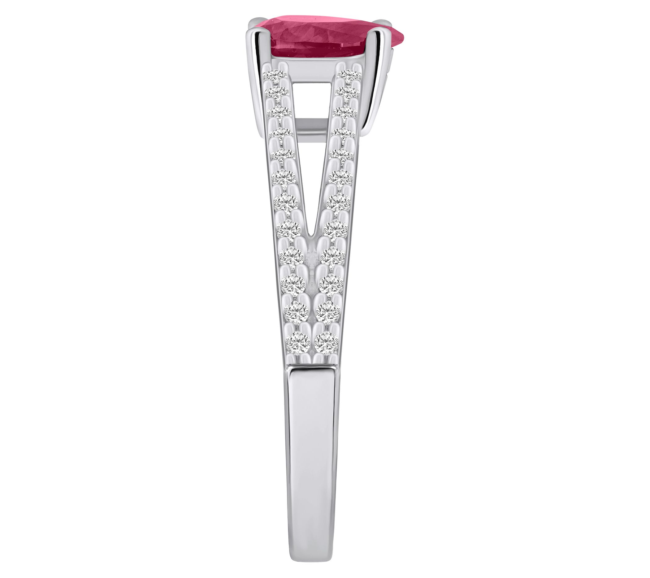 Center pear-cut ruby; split shank with diamond accents