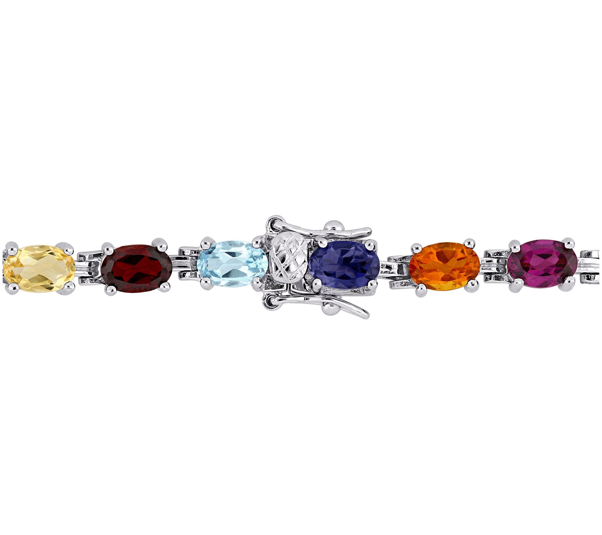- Oval link bracelet with oval-cut, prong-set gemstones; polished finish; box clasp