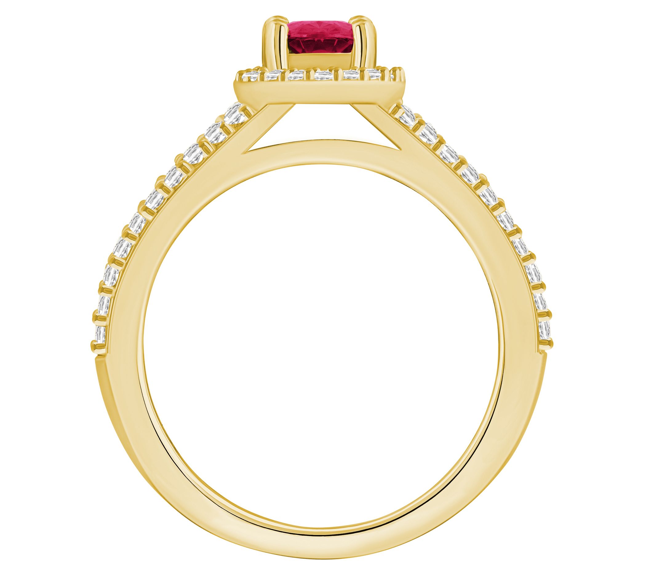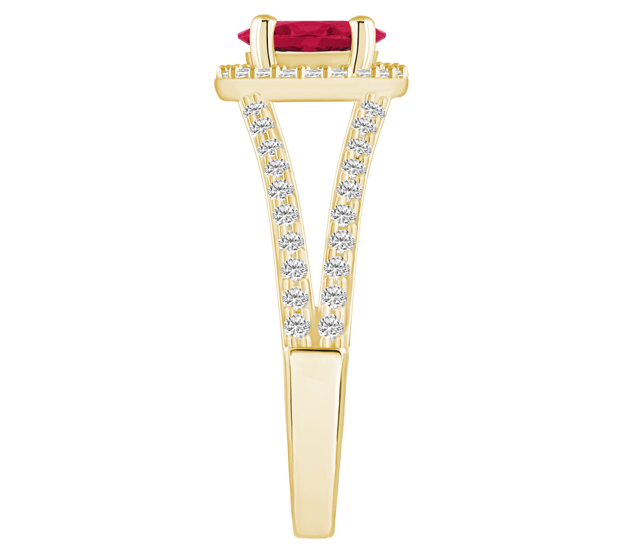 - Prong-set, round ruby with a halo of prong-set, round diamonds and prong-set round diamond accents on the split shank