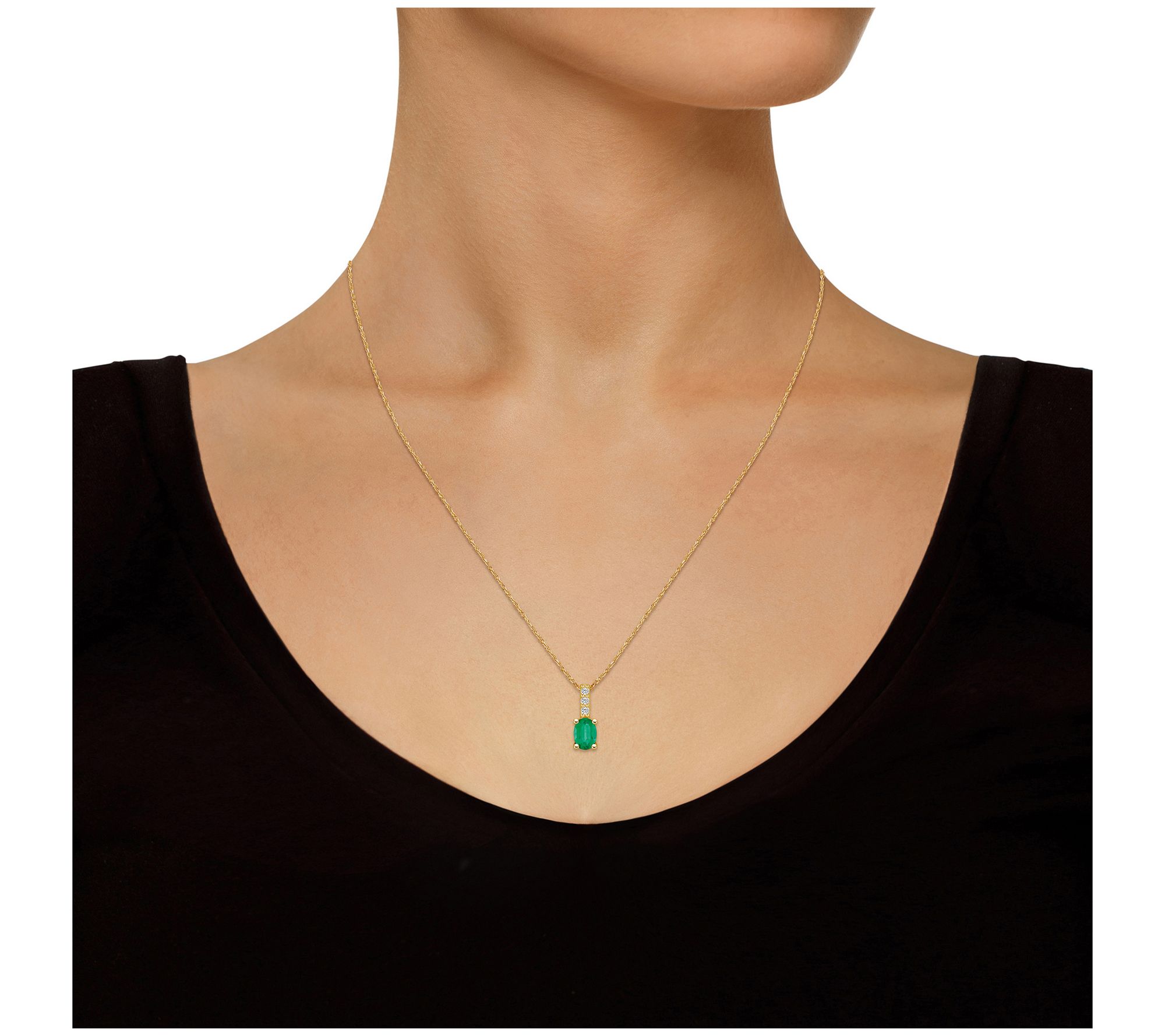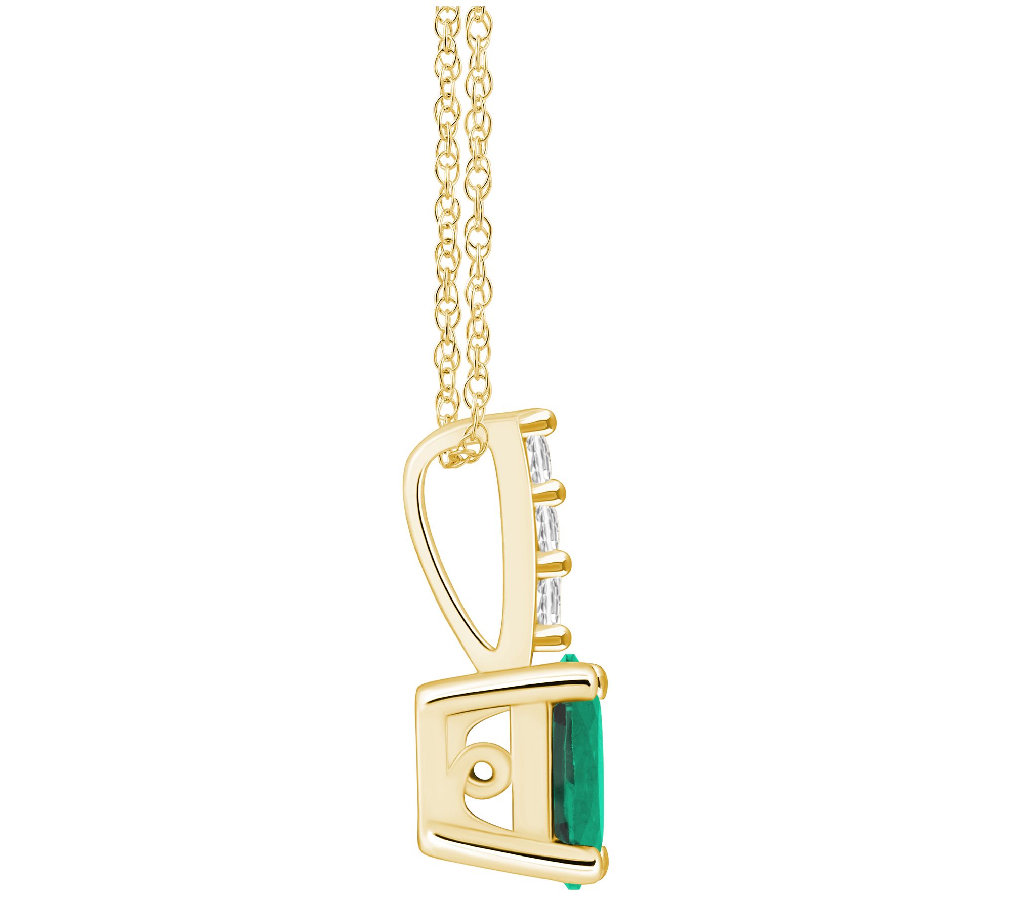 Oval-cut, prong-set gemstone with prong-set, round-cut diamonds set in the bail; rope chain