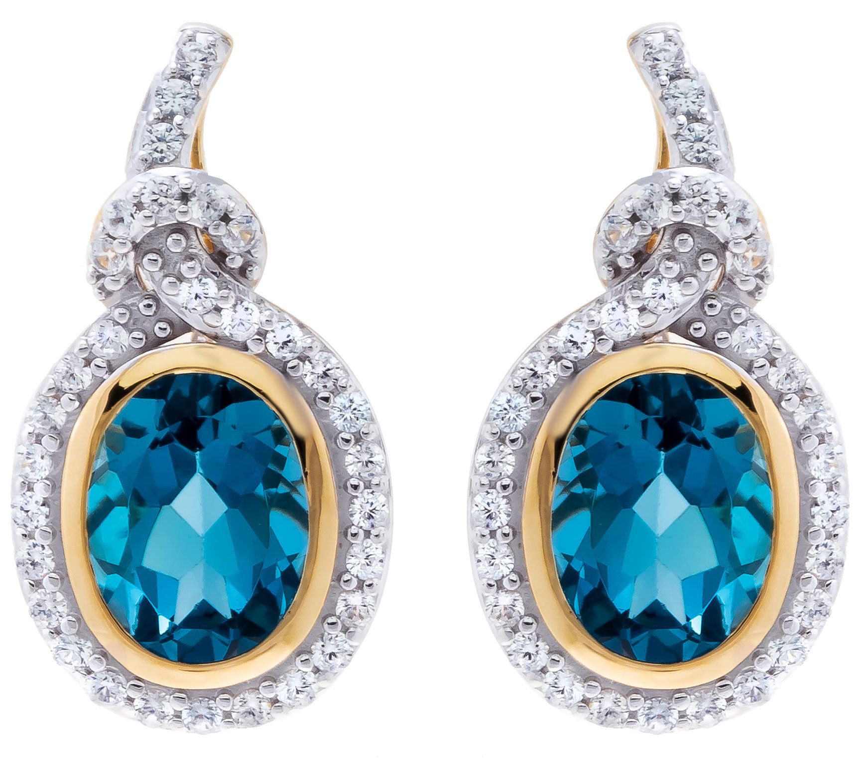 Bring a swirl of elegance to any look when you have this pair of earrings that feature bright London blue topaz surrounded by shimmering white zircon stones. From Affinity® Gems.