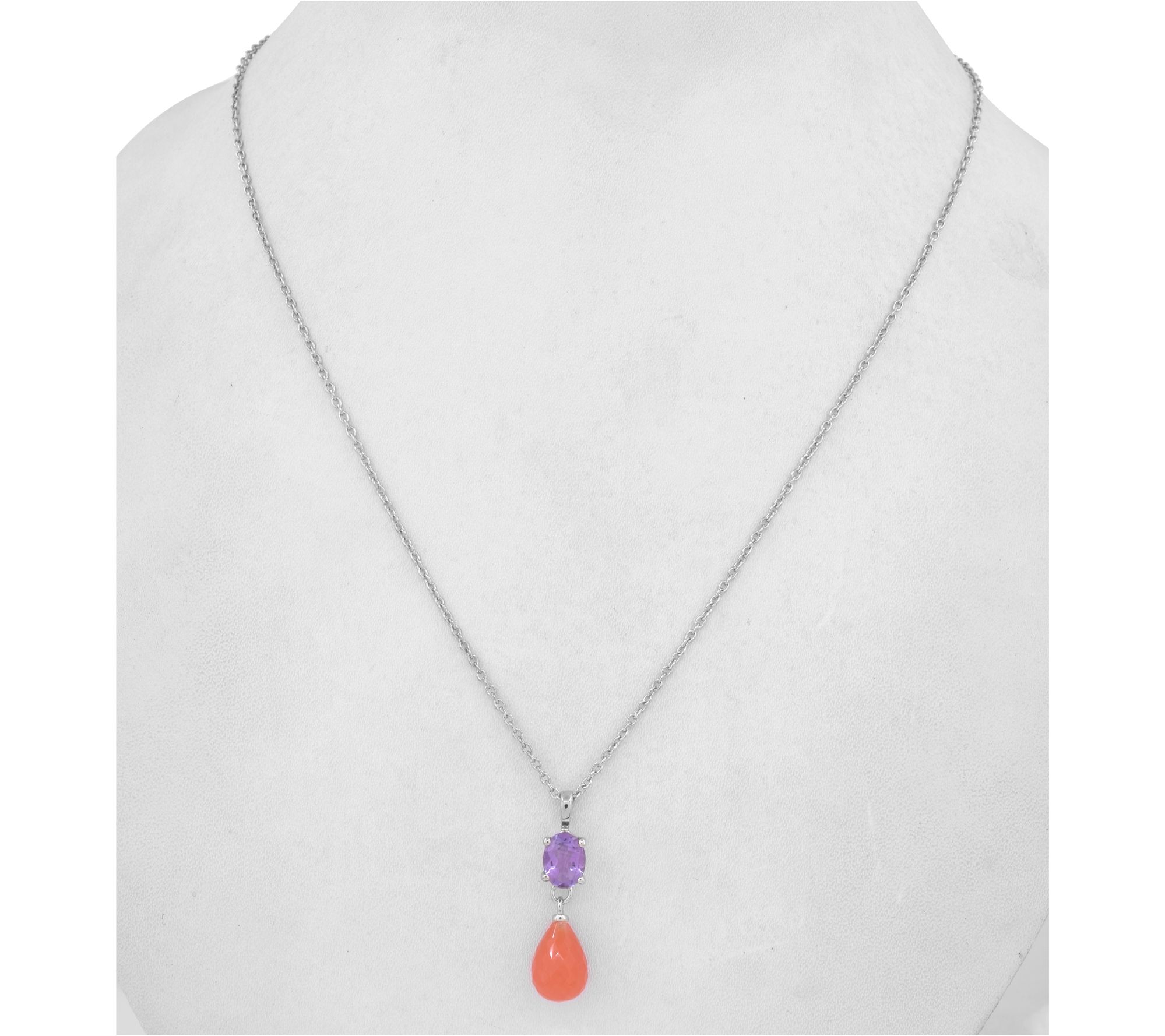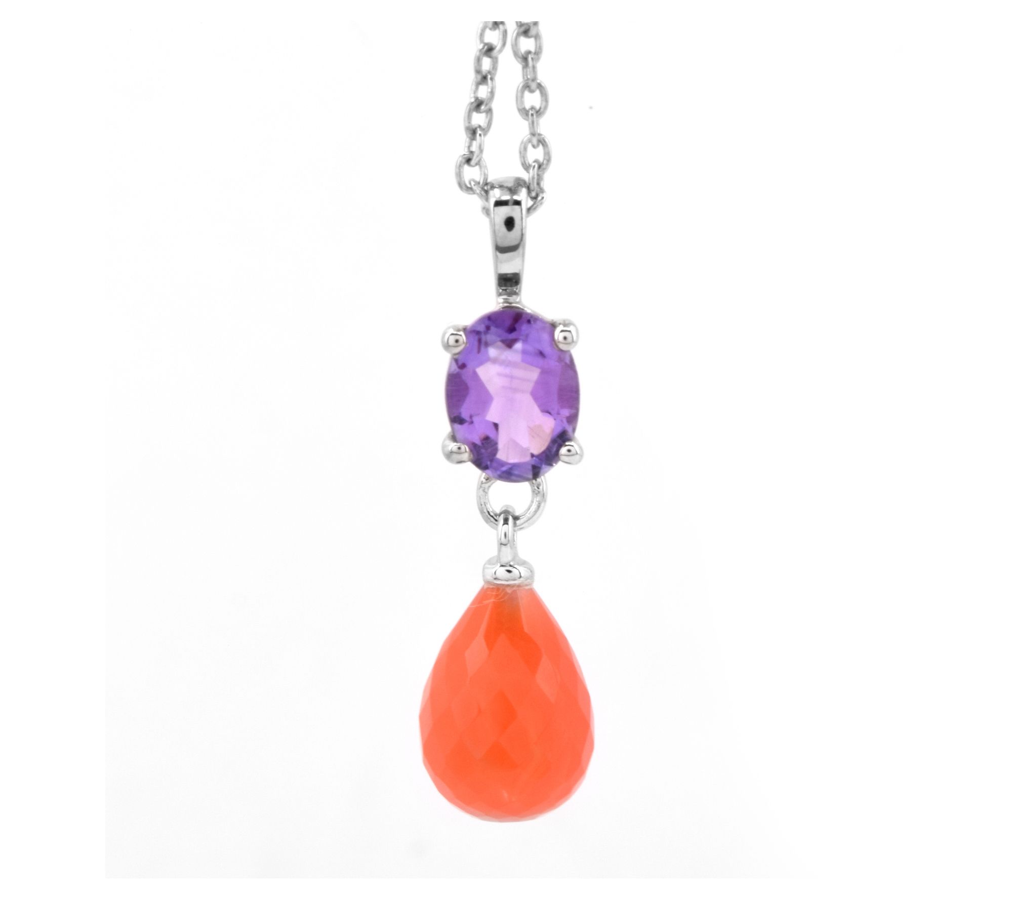 Colorful style takes center stage when you slip on this double-gem pendant, pairing genuine oval-cut amethyst with a faceted drop carnelian for a vibrant look. Layer it with your favorites or wear it solo for an eye-catching accent, day or night. From Affinity® Gems.