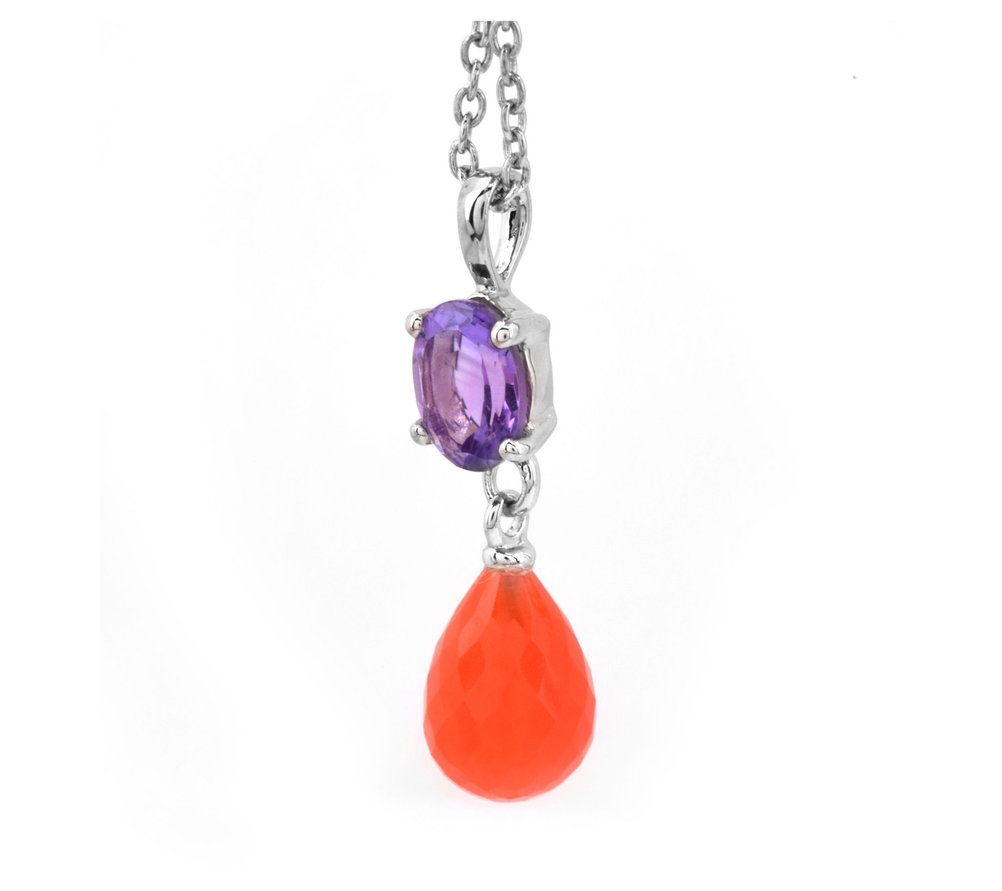 Oval-cut, prong-sett amethyst gemstone; faceted carnelian bead drop