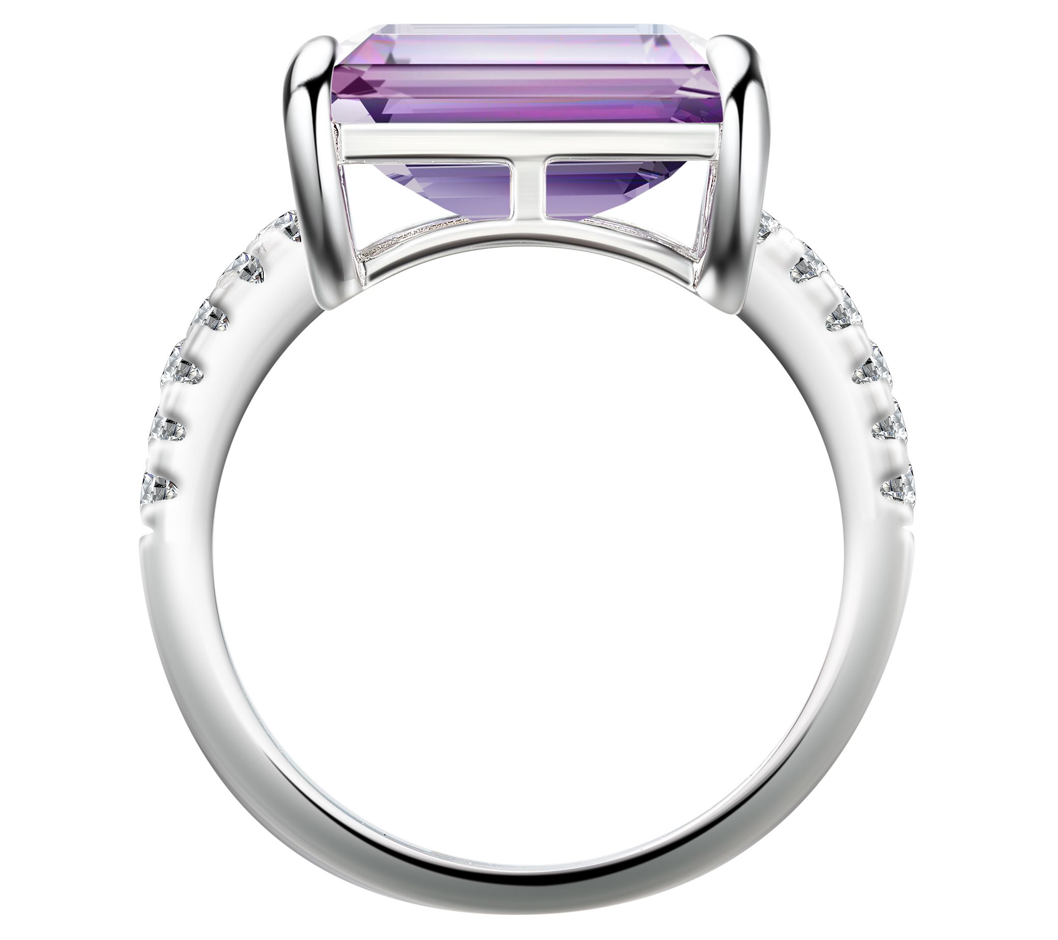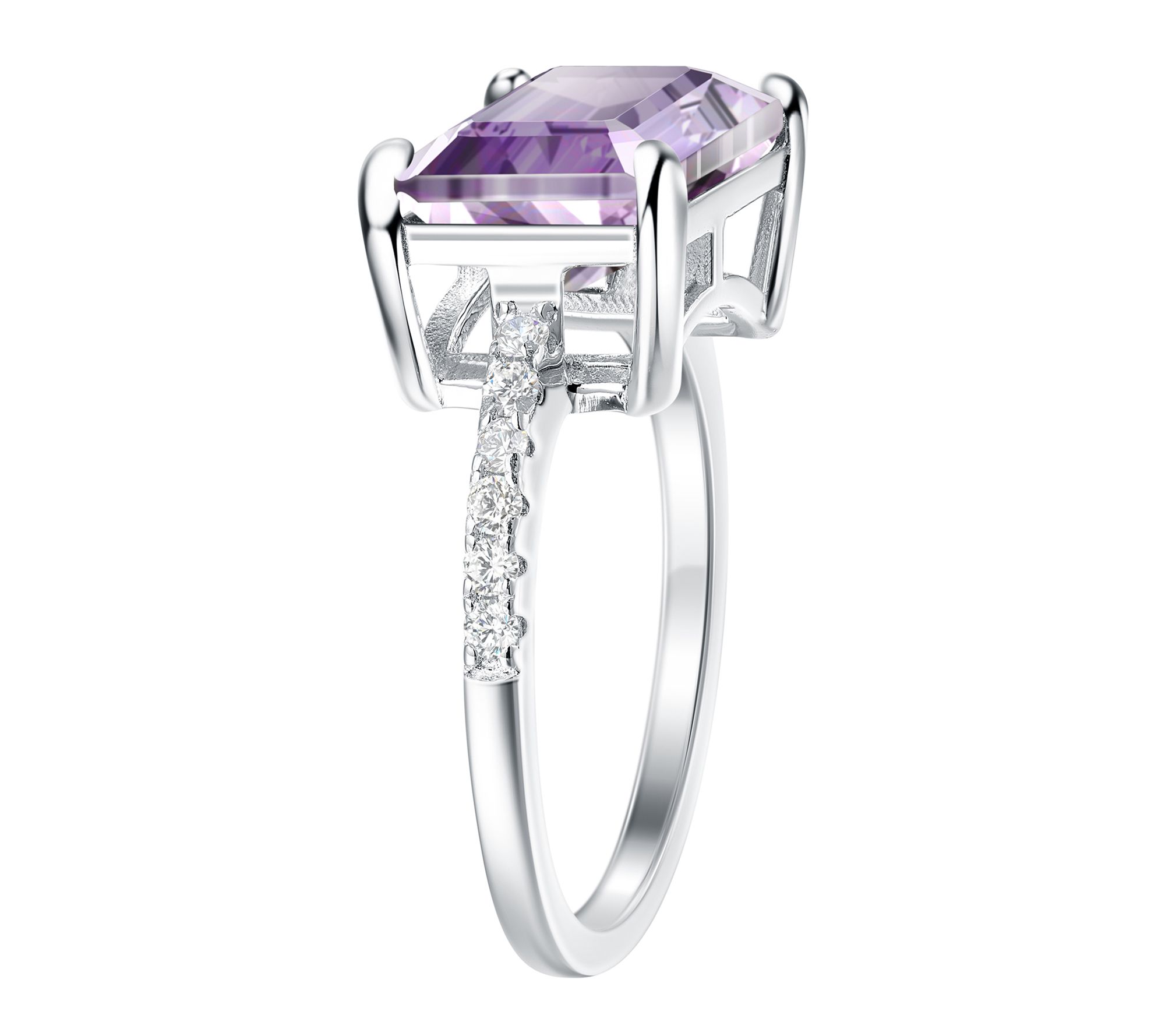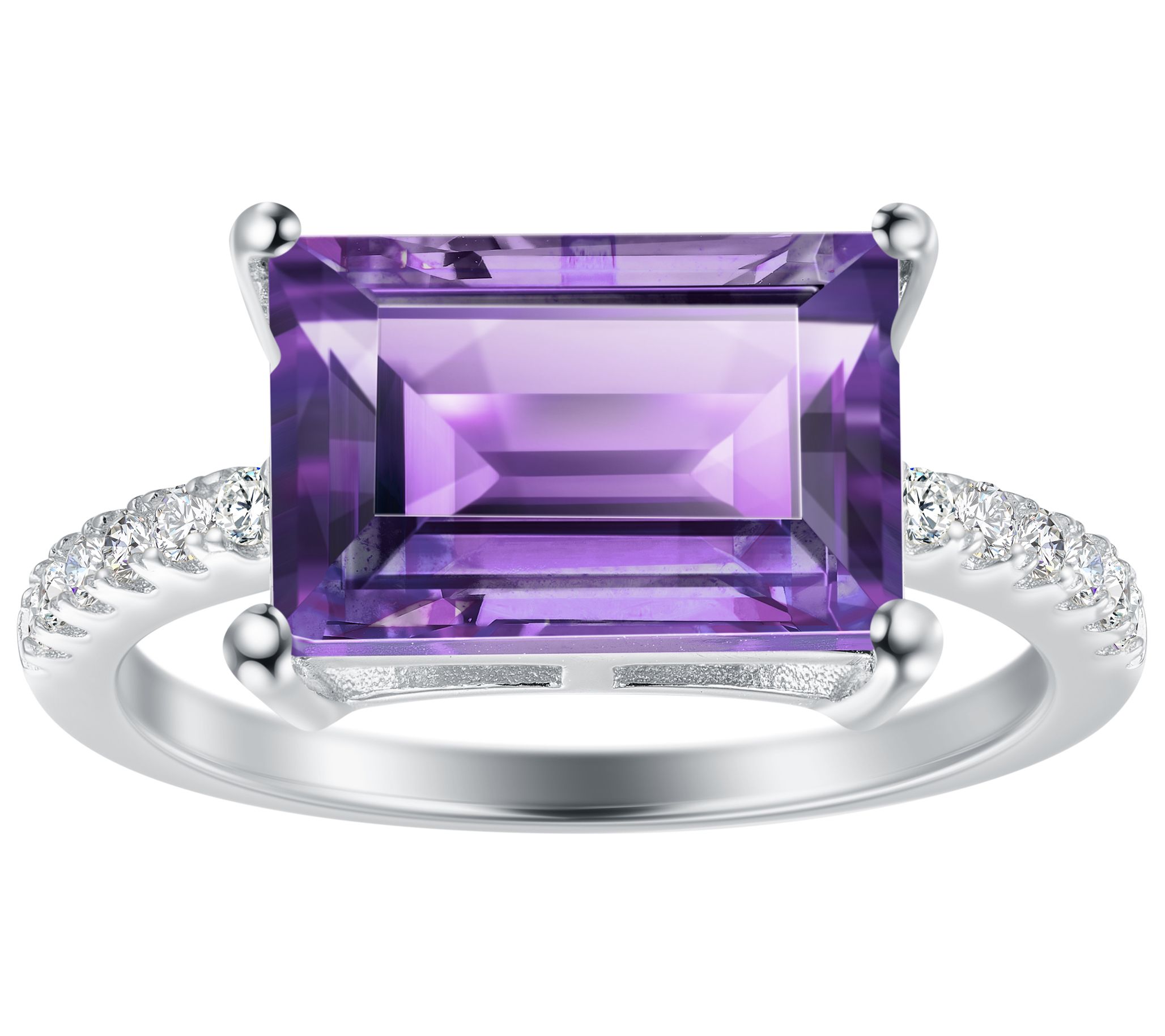 • Emerald-cut, prong-set amethyst with round-cut, pave-set white zircon stones outlining the shank